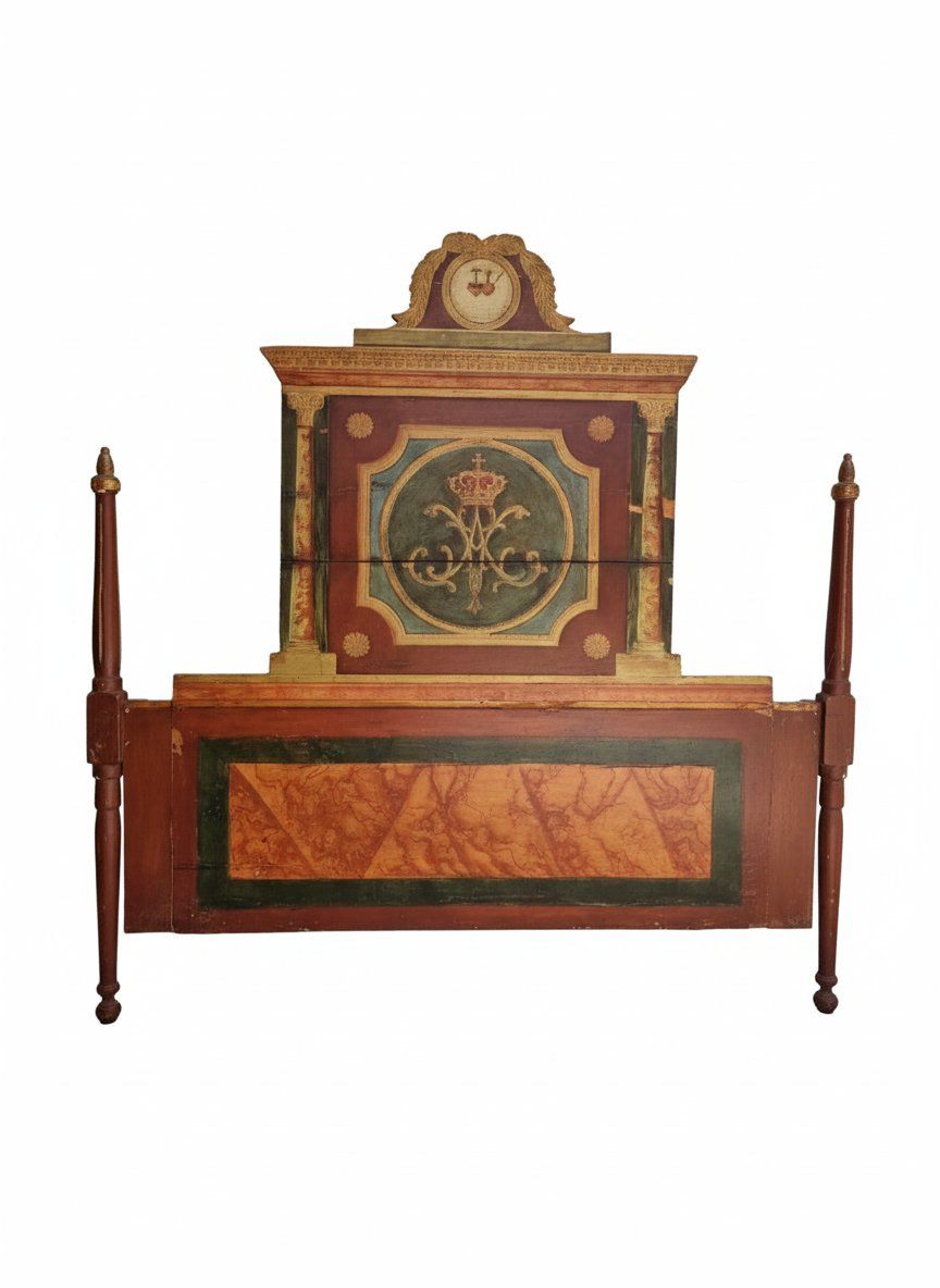 Este cabecero de origen OLOT es una pieza única de gran valor decorativo y cultural. Con una imponente estructura de 191 cm wide by 200 cm high, destaca por su composición simétrica, sus relieves tallados y su policromía original en tonos dorados, verdes y burdeos. El emblema central con corona y motivos florales sugiere una influencia nobiliaria o religiosa, propia de la tradición artística catalana del siglo XIX.