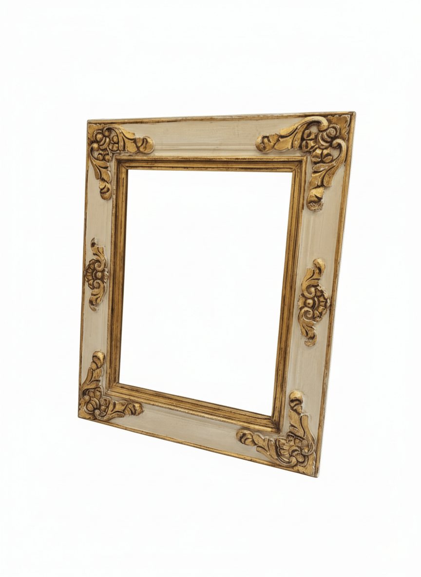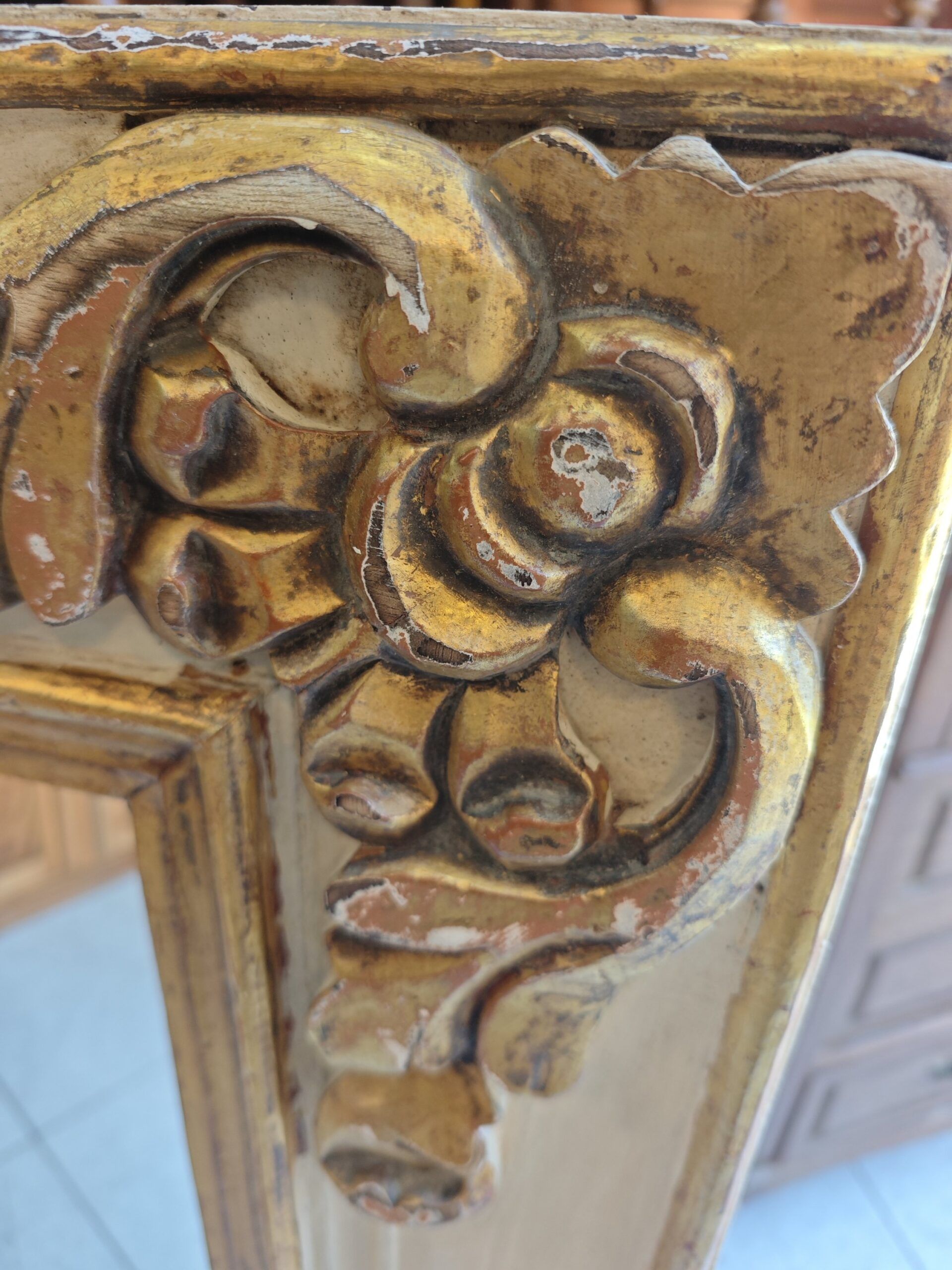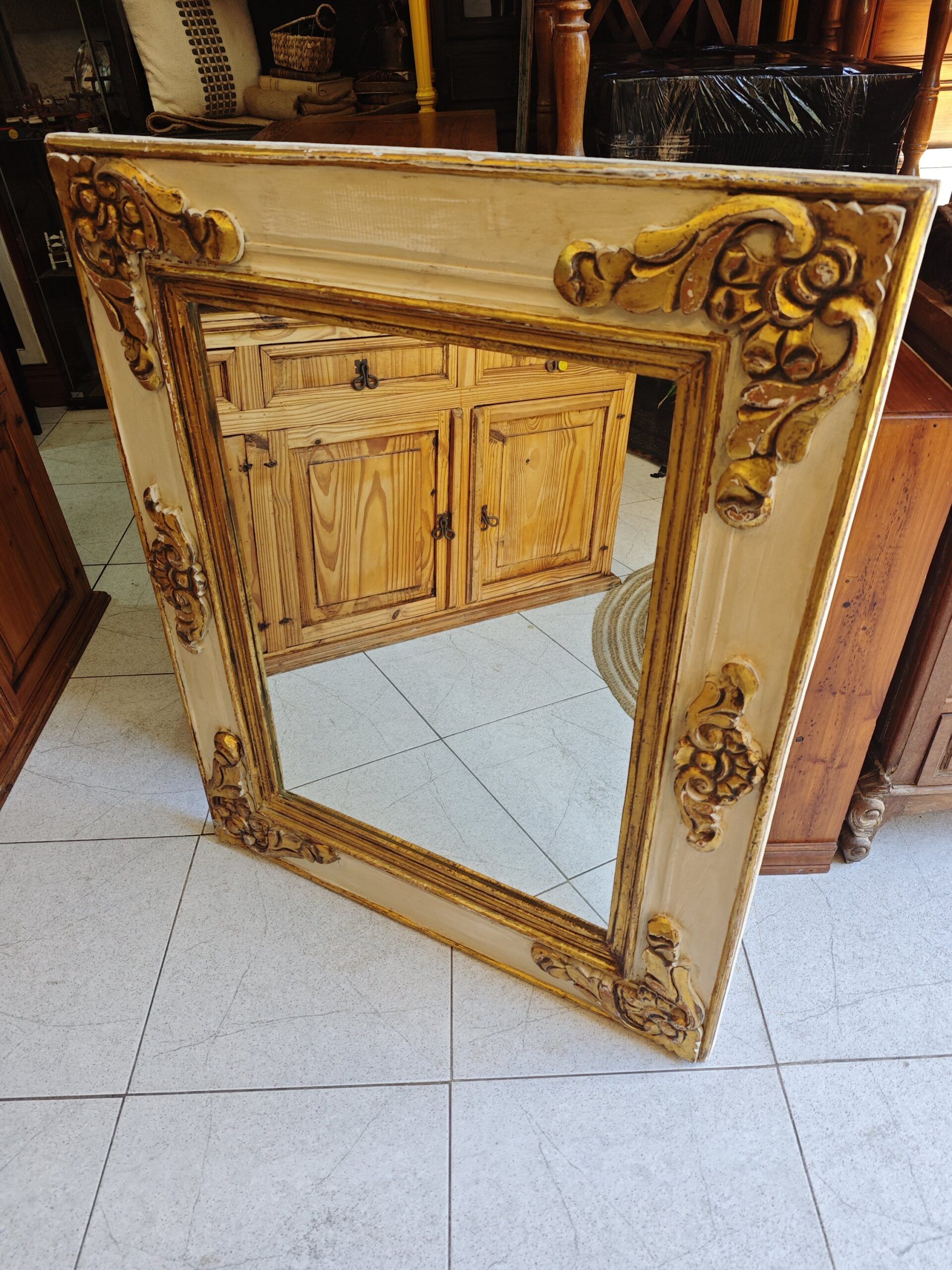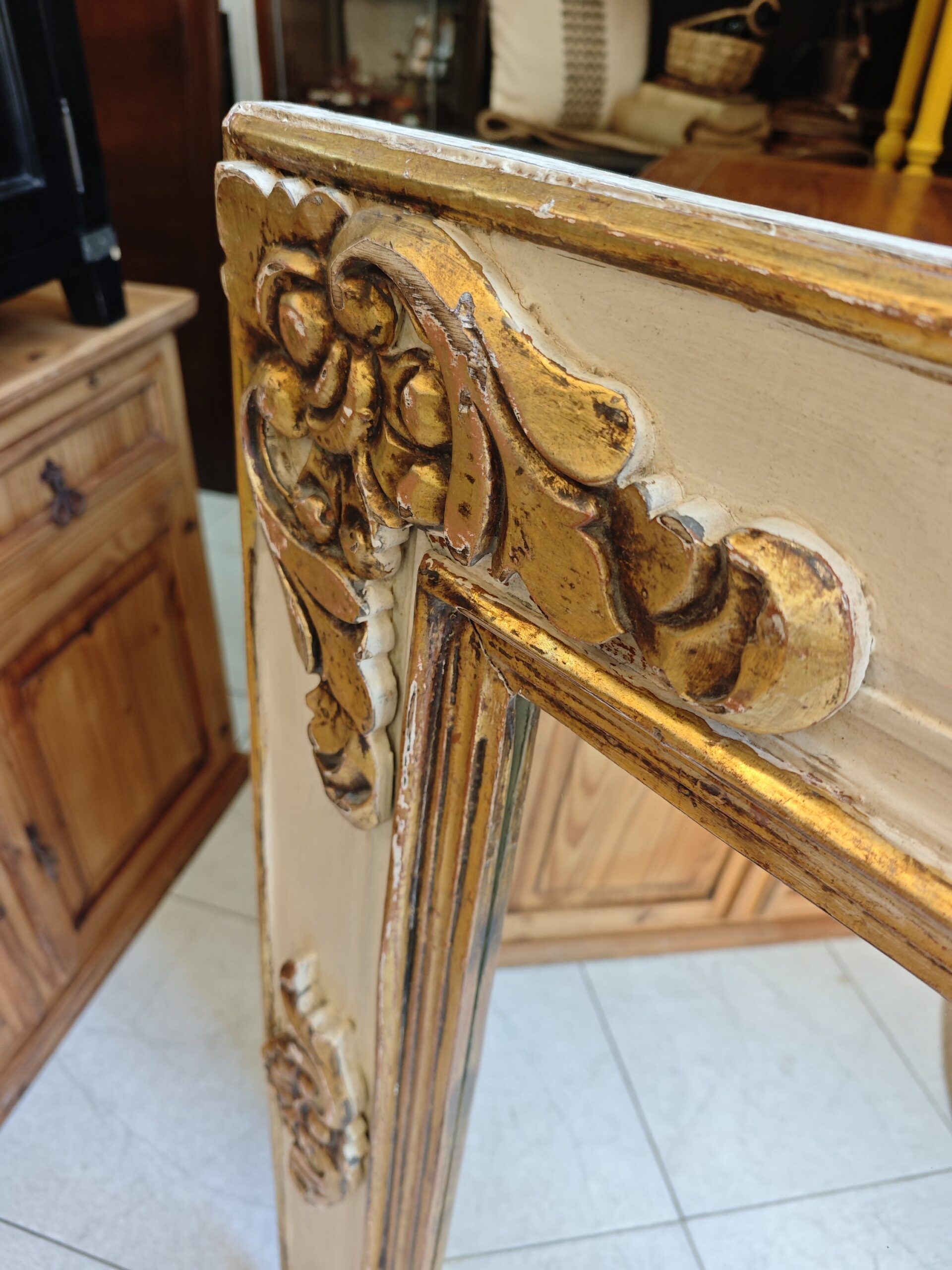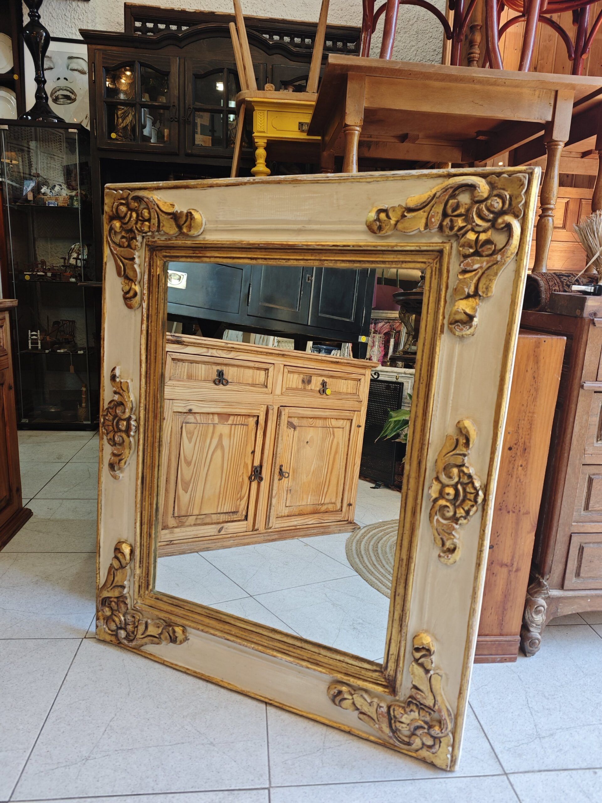 This vintage mirror stands out for its imposing baroque style design., ideal for those looking for a centerpiece with character and classic elegance. The frame is made of high quality wood, finished in a soft cream tone that highlights the ornamental reliefs in gold leaf. Its detailed carvings on the corners and sides provide a three-dimensional relief that captures light in a unique way.