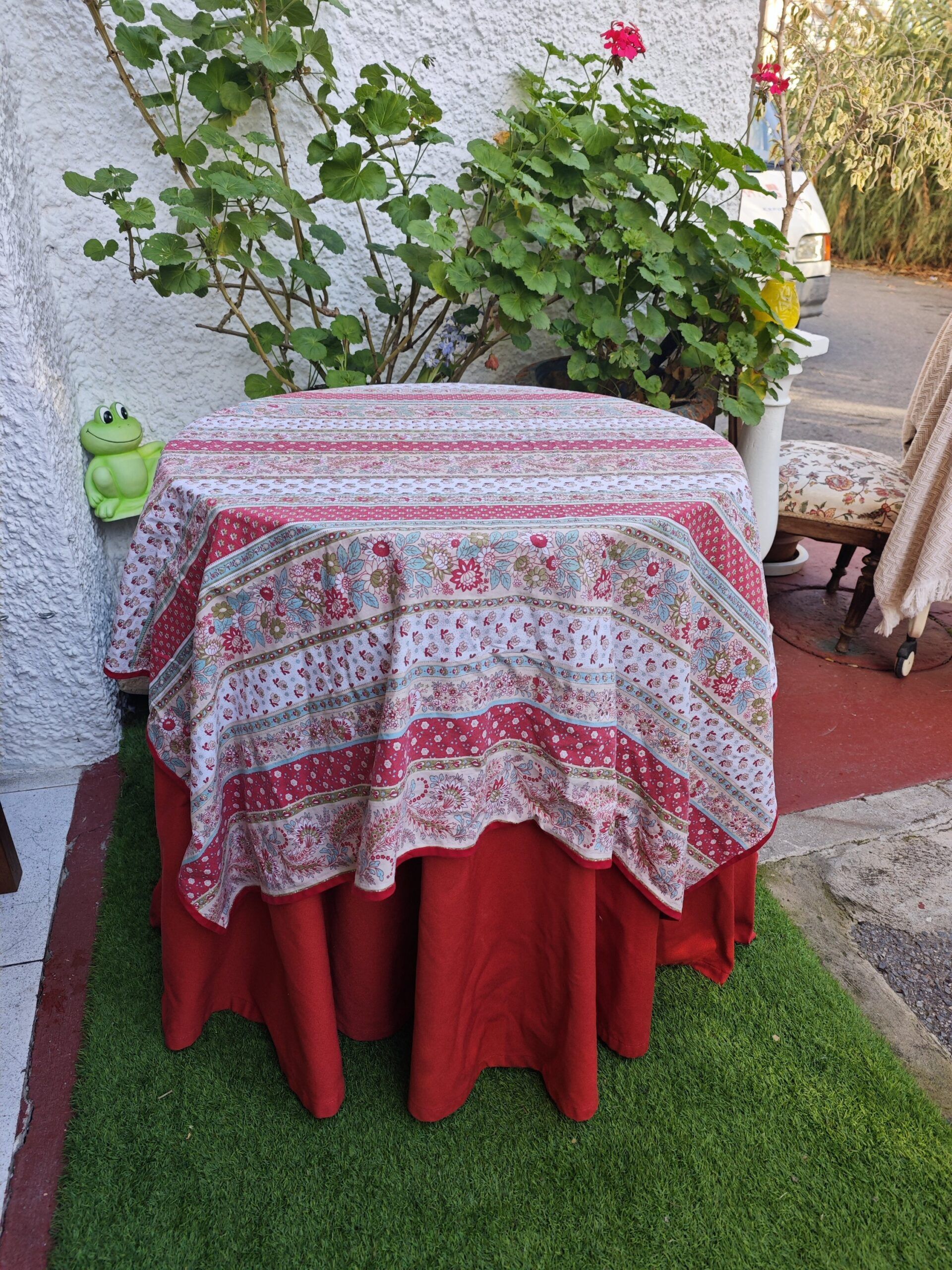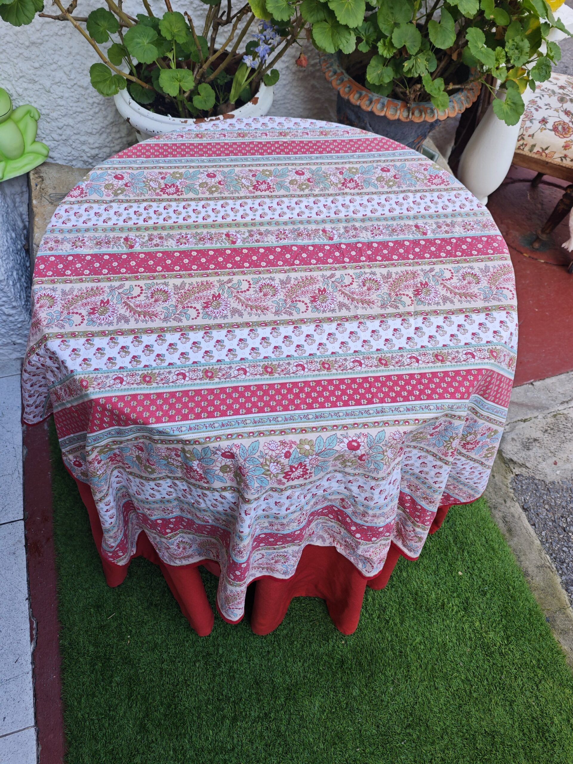Round table with double tablecloth: red base to the ground + geometric floral print tablecloth. diameter approx. 70cm. Height €75 standard.