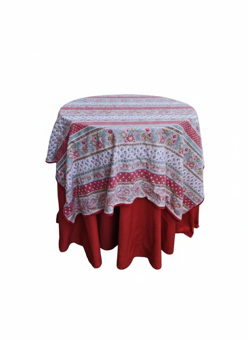 This textile composition transforms a simple table into a warm focal point full of personality. The base, a plain red tablecloth that falls to the floor, provides depth and elegance, while the over-tablecloth, with horizontal stripes of floral and geometric motifs in red tones, blanco, blue and green, adds dynamism and a festive air.
