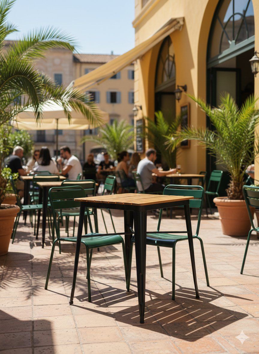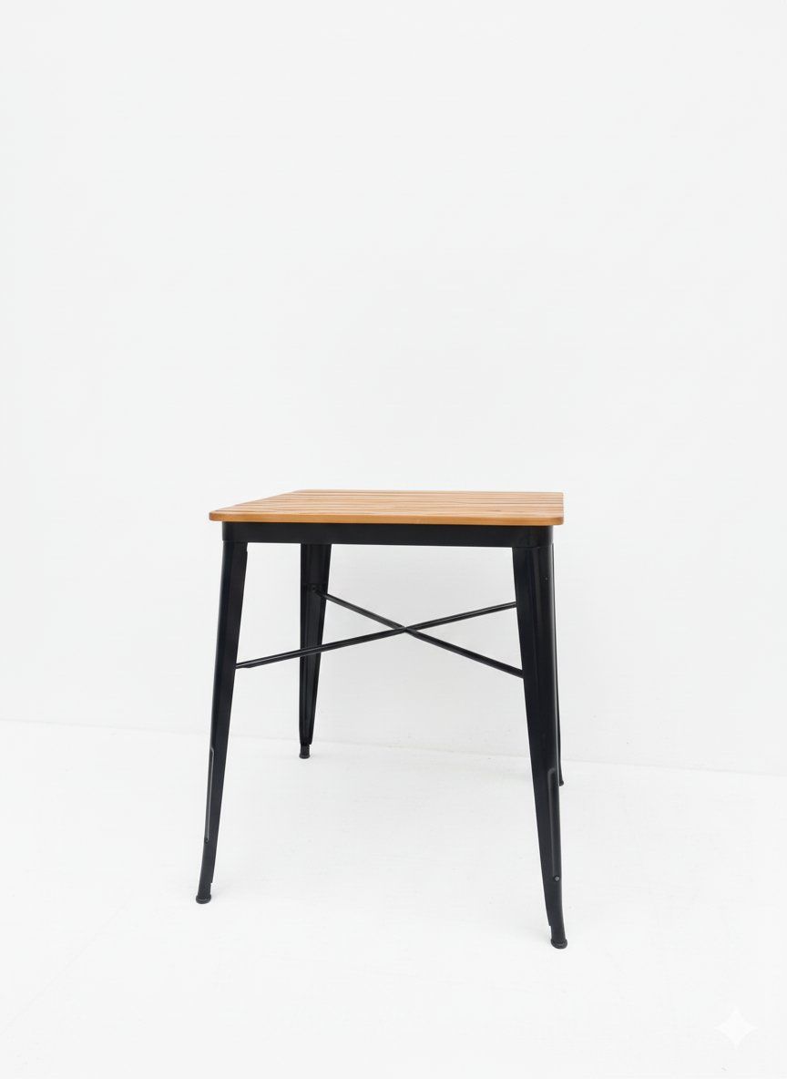 This square table combines a natural wood top with a black metal structure, creating a modern and functional contrast. Its compact and resistant design makes it ideal for terraces, reading corners, urban kitchens or commercial spaces with industrial aesthetics. Angled legs and bottom rail add stability and visual character.
