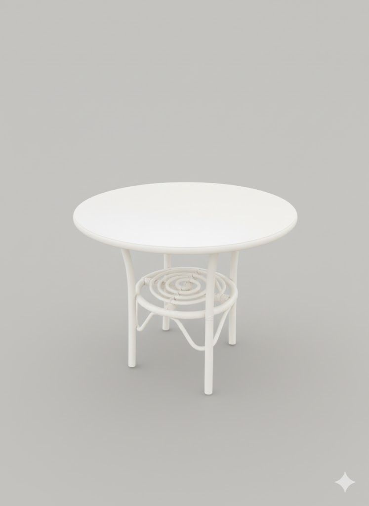 round table made of wood and bamboo, with sculptural design and organic presence. Its circular top rests on four curved legs that are connected by a spiral network of bamboo rods., providing stability and an artistic touch. This lower structure not only reinforces the base, but adds visual depth and artisanal character.