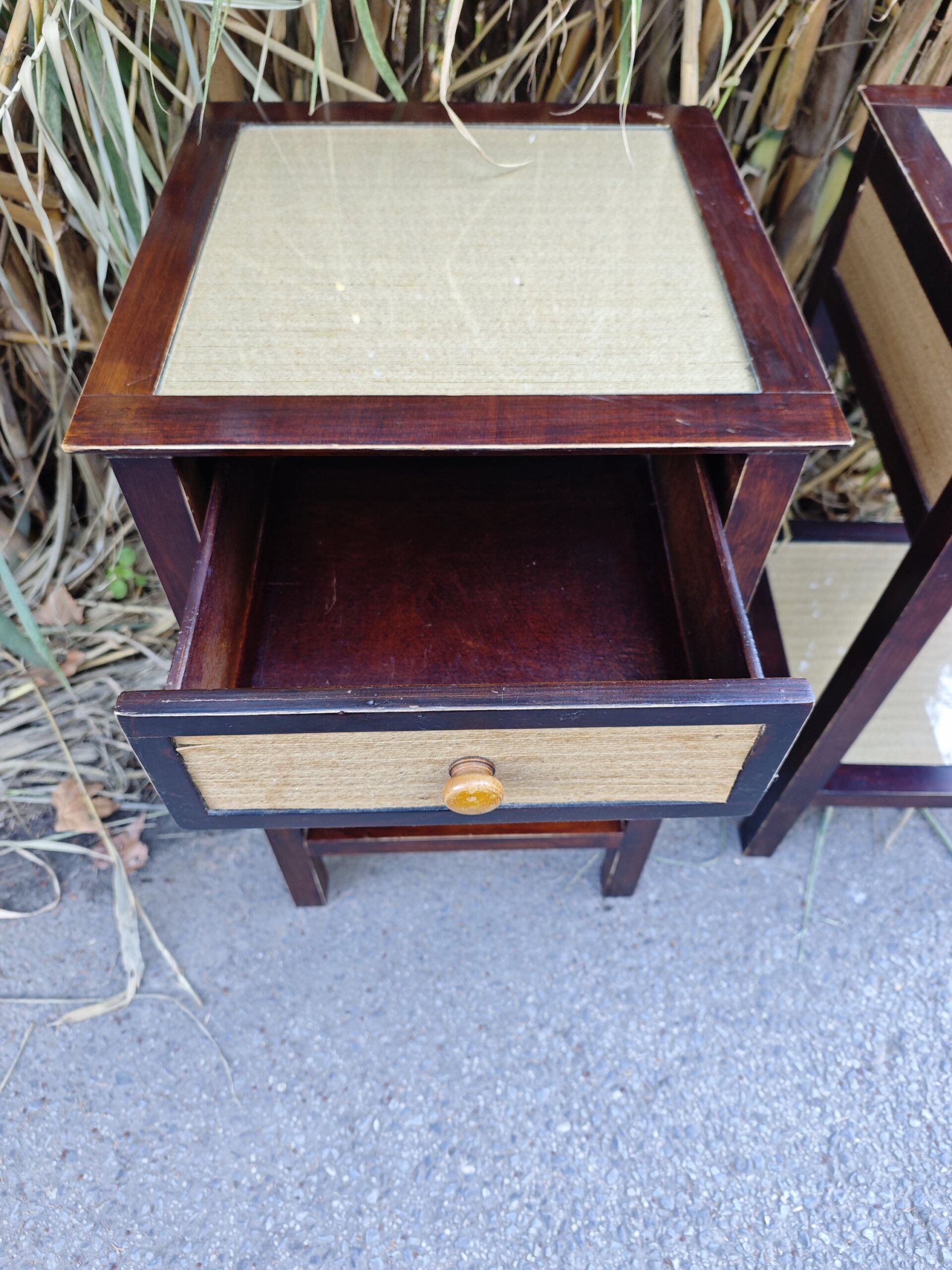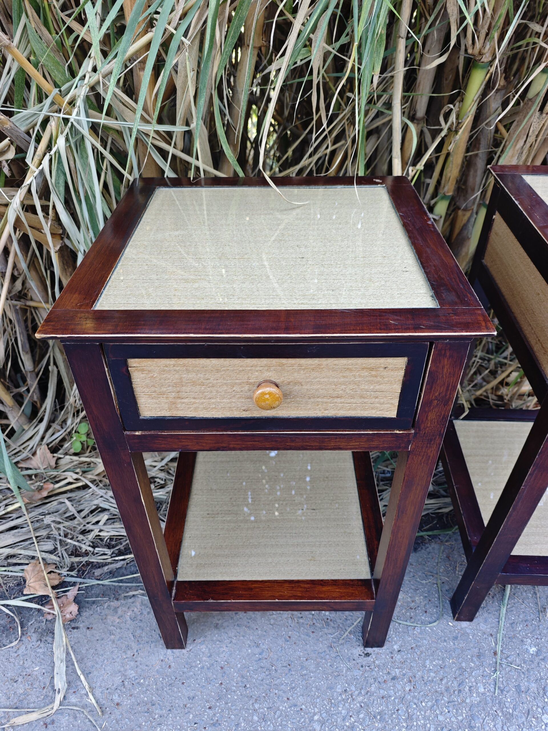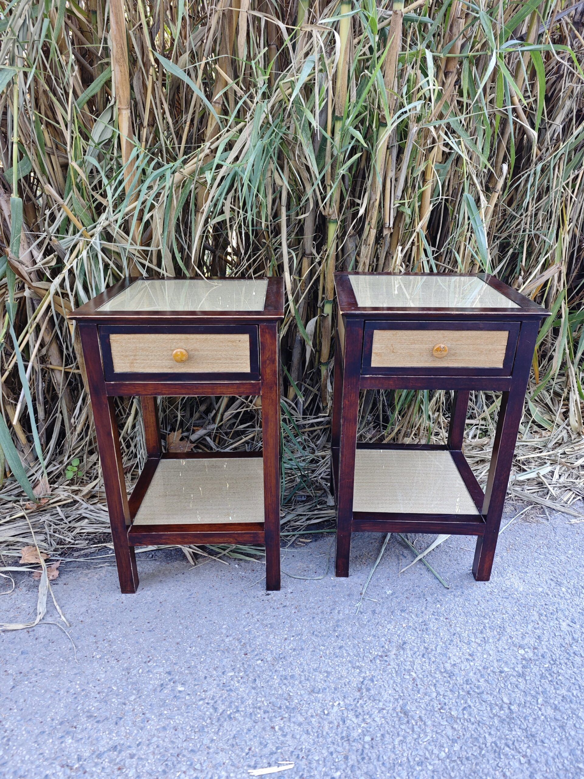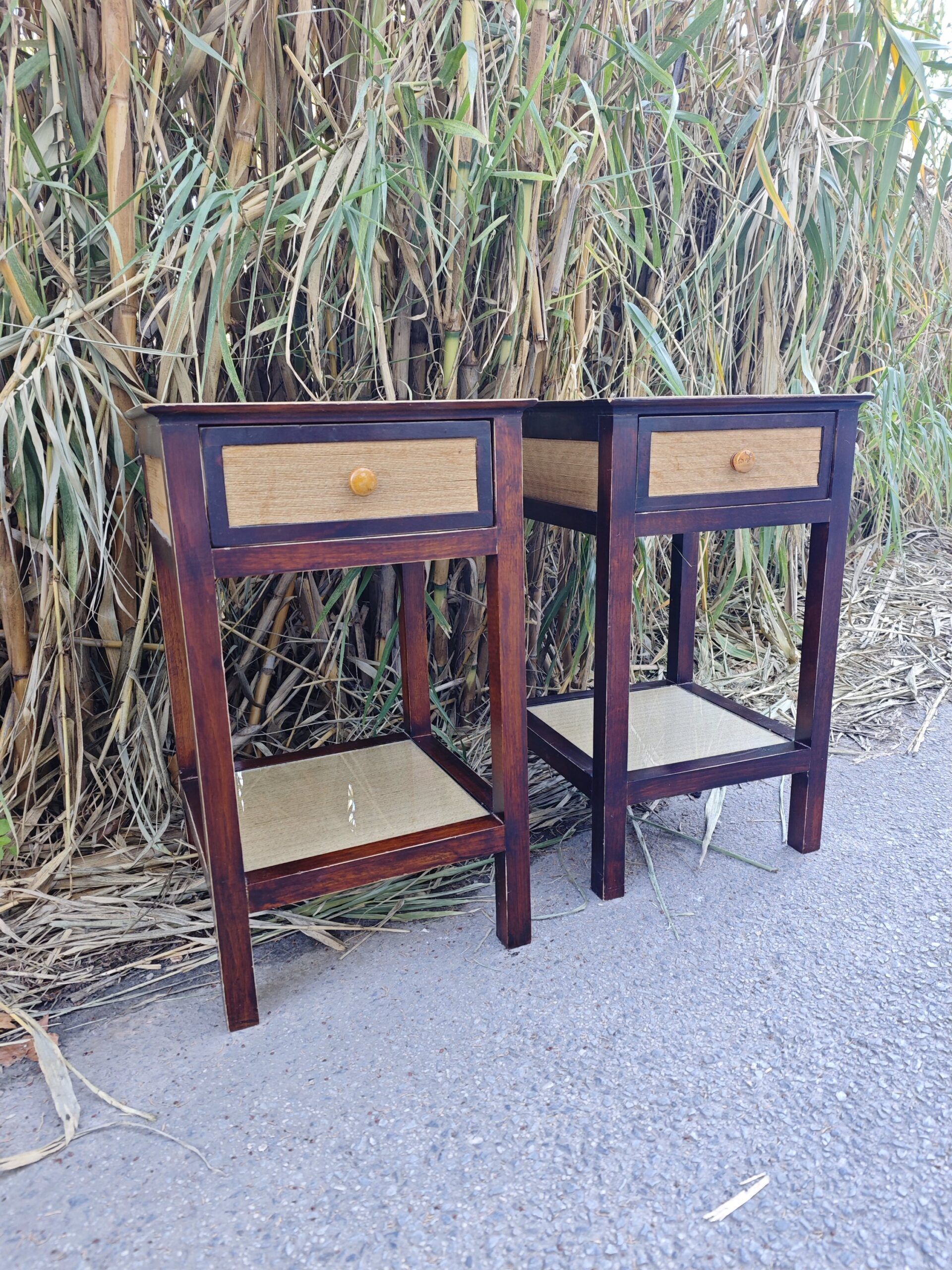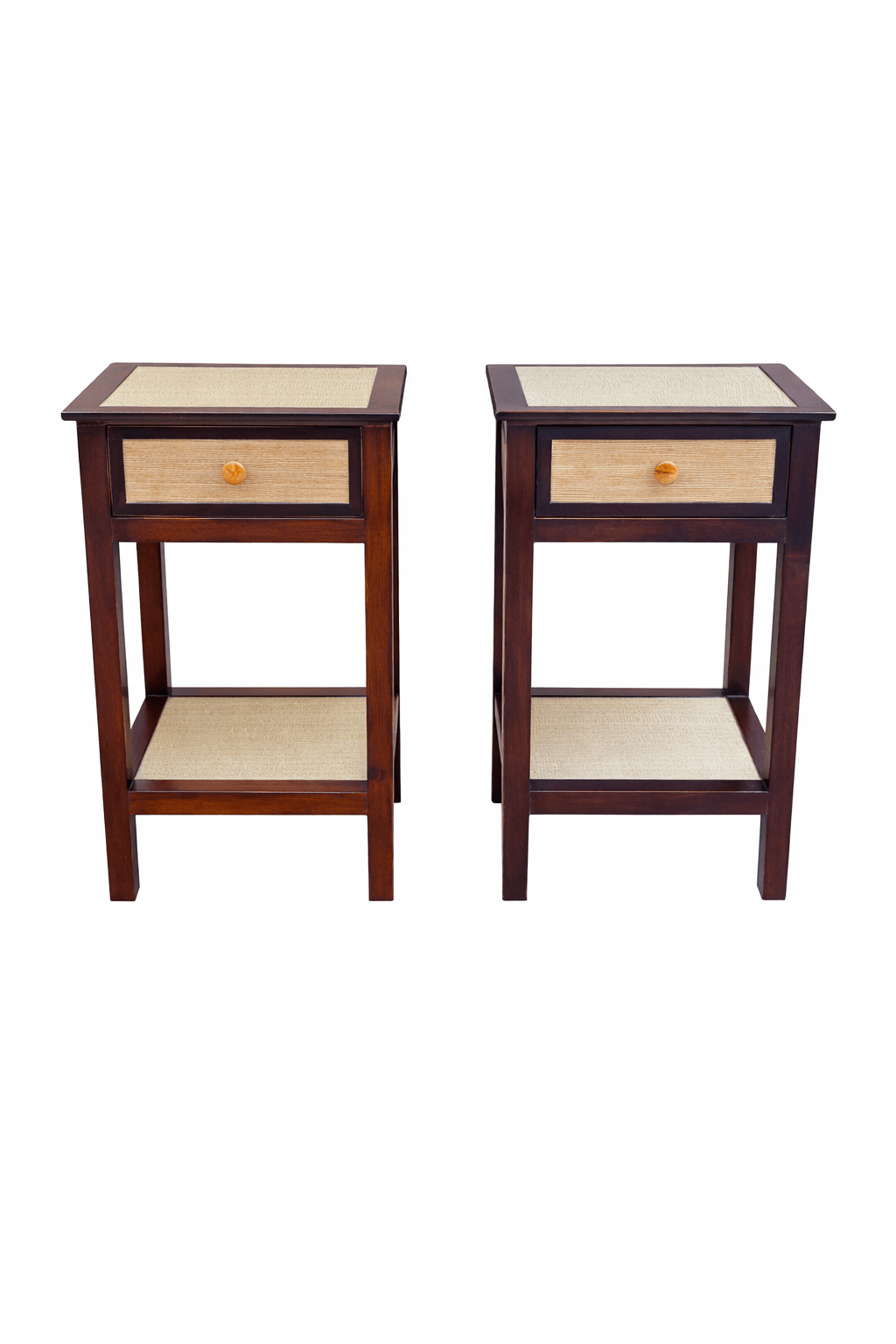 couple of wood and jute tables auxiliares elaboradas en madera maciza con detalles en yute natural. Su diseño sobrio y funcional combina líneas rectas con una estética cálida y artesanal. Cada pieza cuenta con un cajón frontal de tirador redondo y una balda inferior, ideal para almacenamiento o decoración. El contraste entre el tono oscuro de la estructura y los paneles más claros en el sobre, el frente del cajón y la balda inferior aporta dinamismo visual sin perder coherencia. El yute, presente en los acabados, añade textura y un toque orgánico que refuerza su carácter natural.
