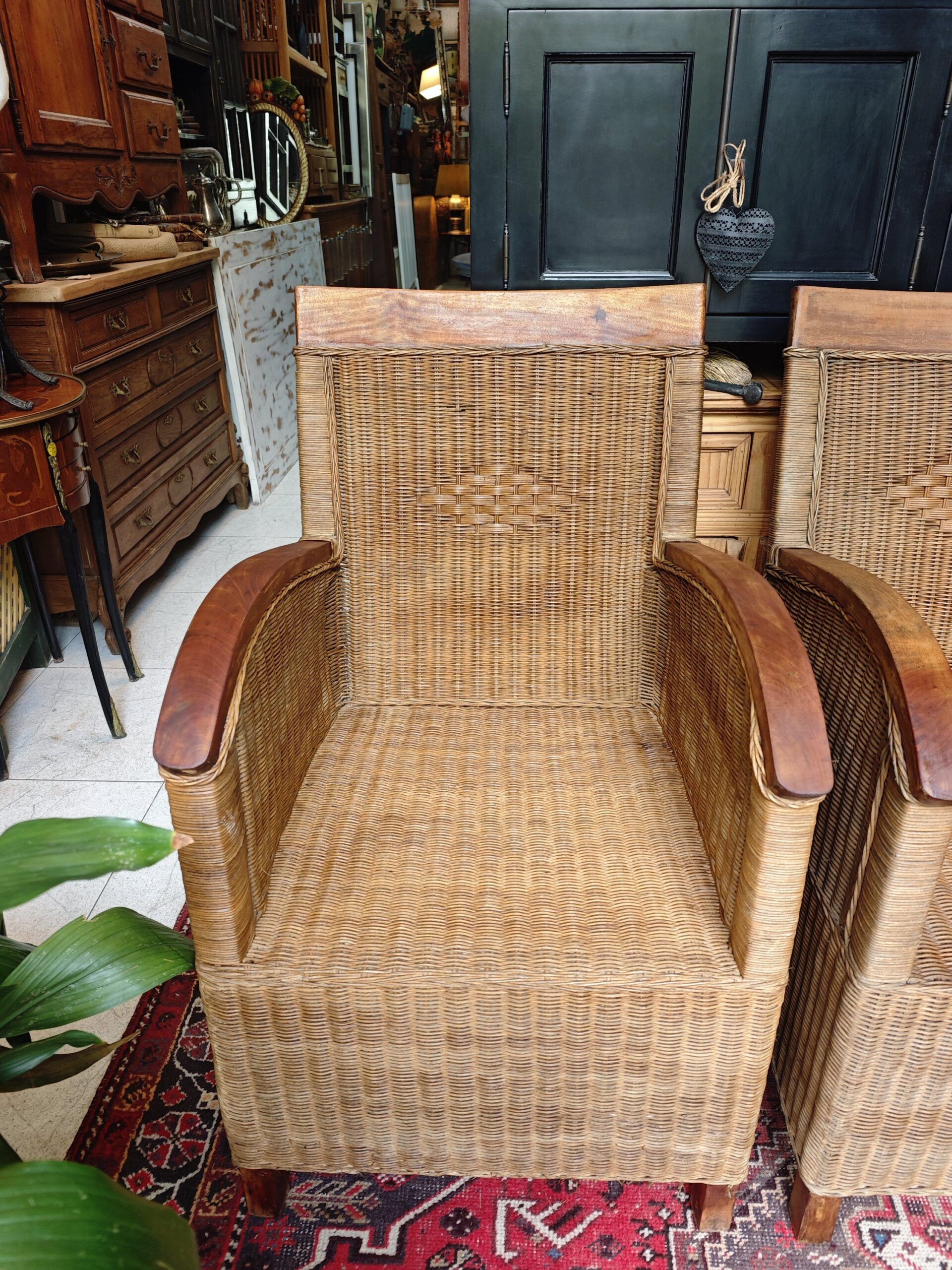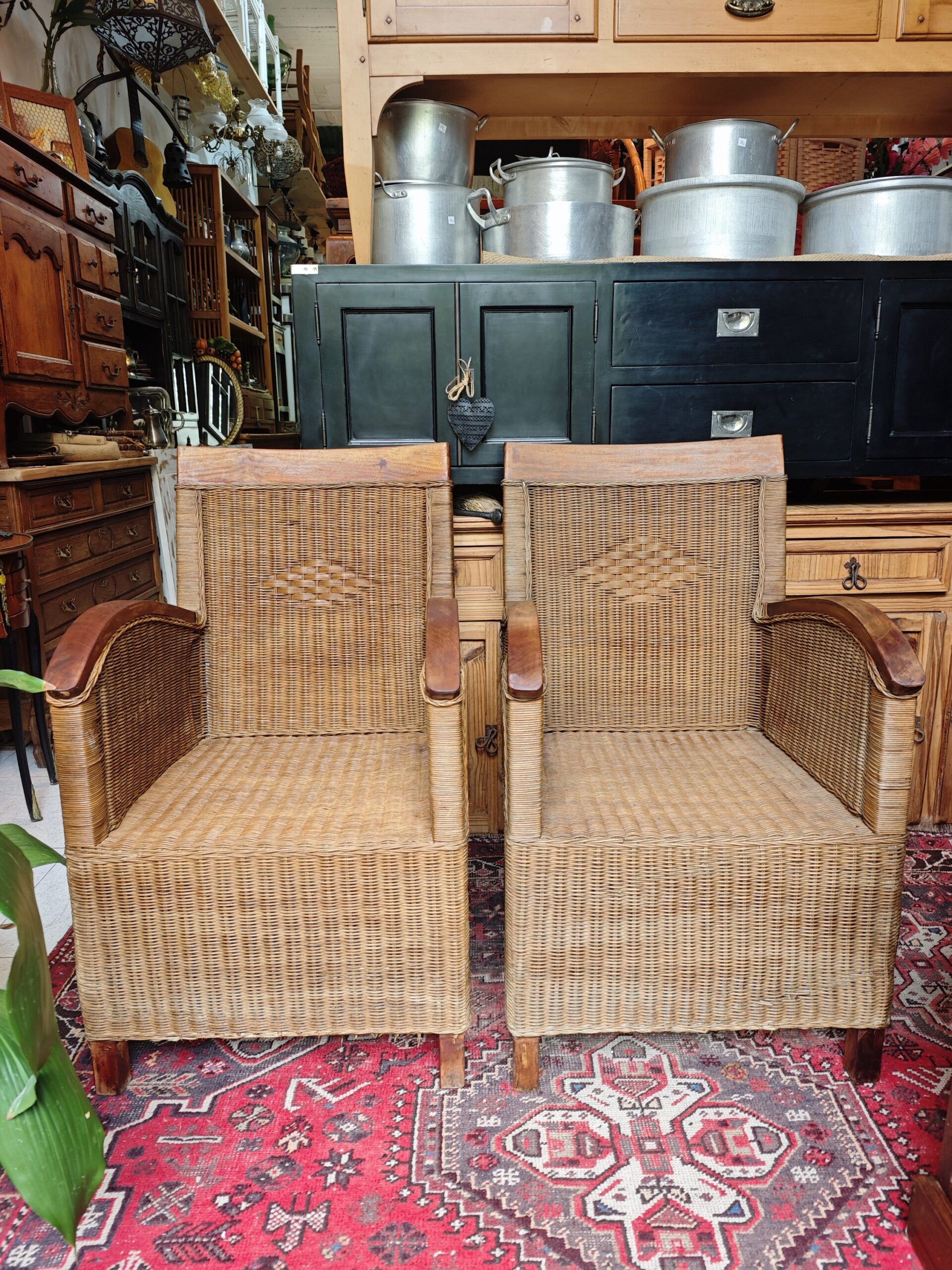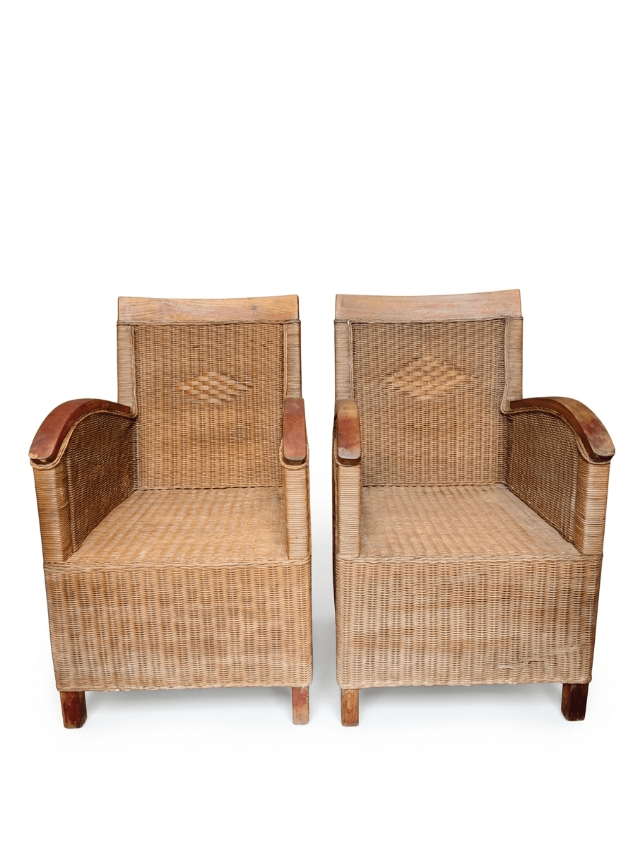 This exceptional pair of rattan armchairs is a testament to the artisanal design of the mid-20th century.. With an aesthetic that evokes the sophistication of colonial salons and the freshness of the elevated Boho-Chic style., These pieces stand out for their intricate weaving of natural fibers and their solid wood armrests with a curved finish.. The diamond detail on the backrest adds a touch of geometric distinction that breaks the uniformity of the fabric, providing a unique visual texture.