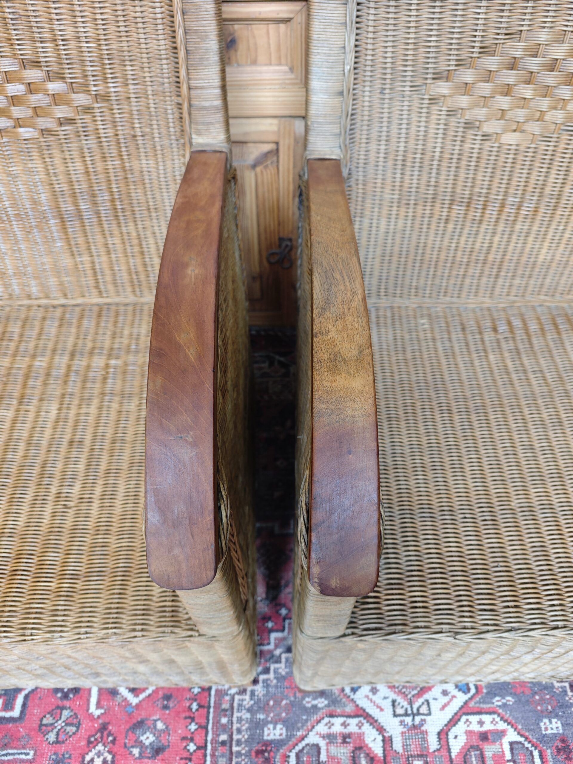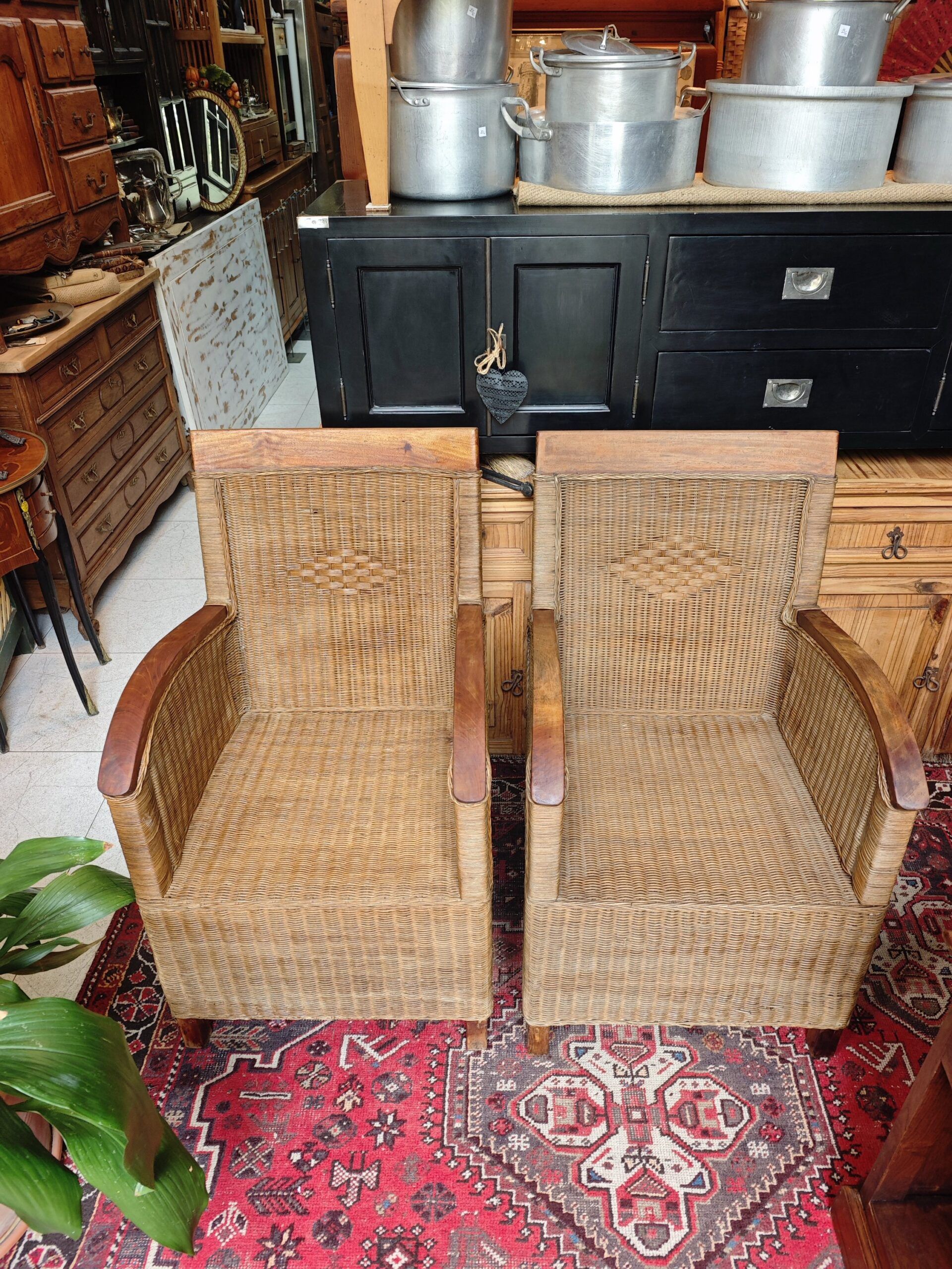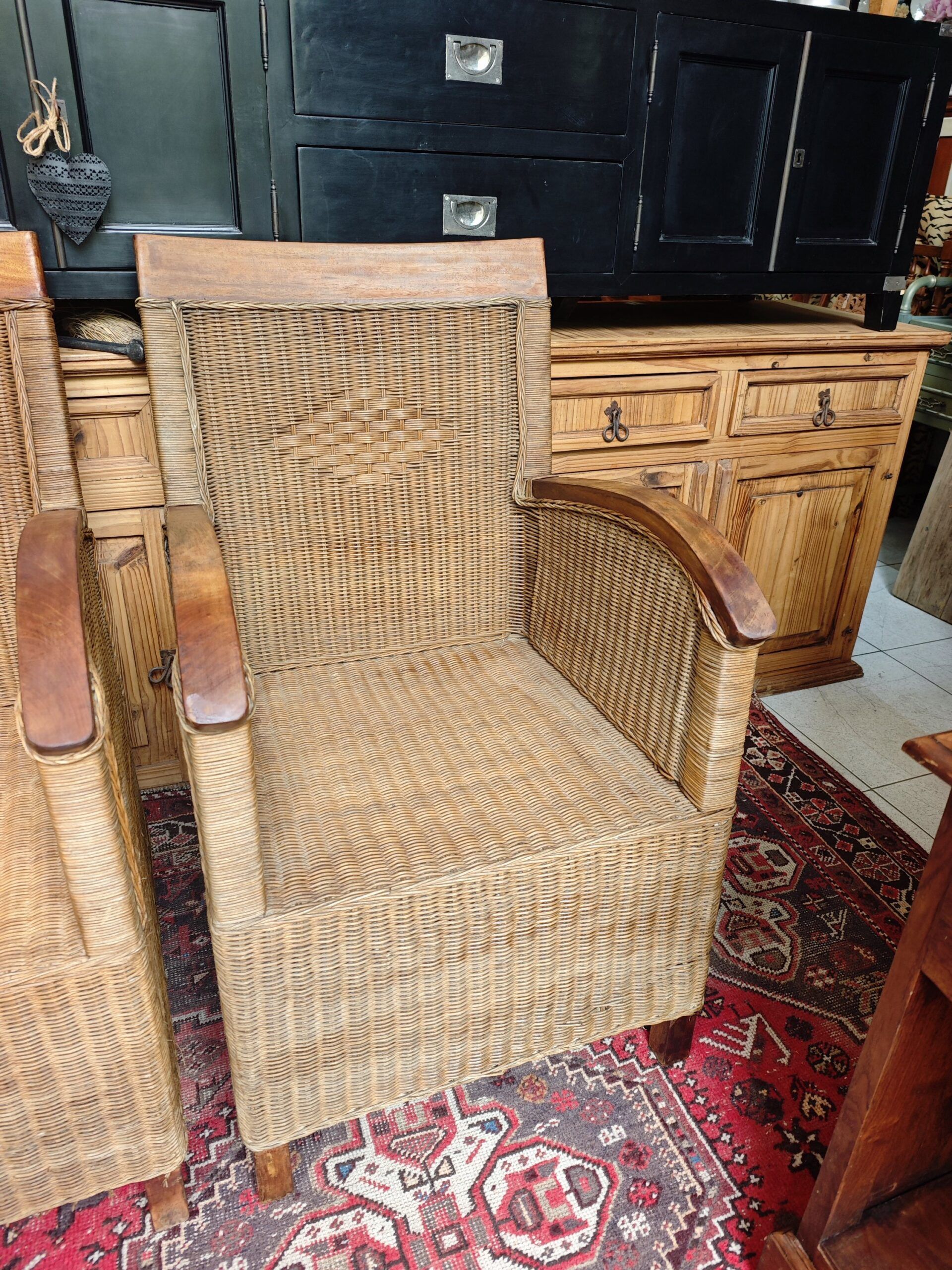 This exceptional pair of rattan armchairs is a testament to the artisanal design of the mid-20th century.. With an aesthetic that evokes the sophistication of colonial salons and the freshness of the elevated Boho-Chic style., These pieces stand out for their intricate weaving of natural fibers and their solid wood armrests with a curved finish.. The diamond detail on the backrest adds a touch of geometric distinction that breaks the uniformity of the fabric, providing a unique visual texture.