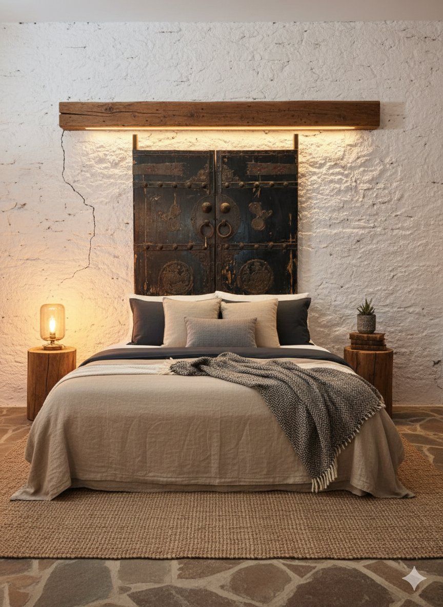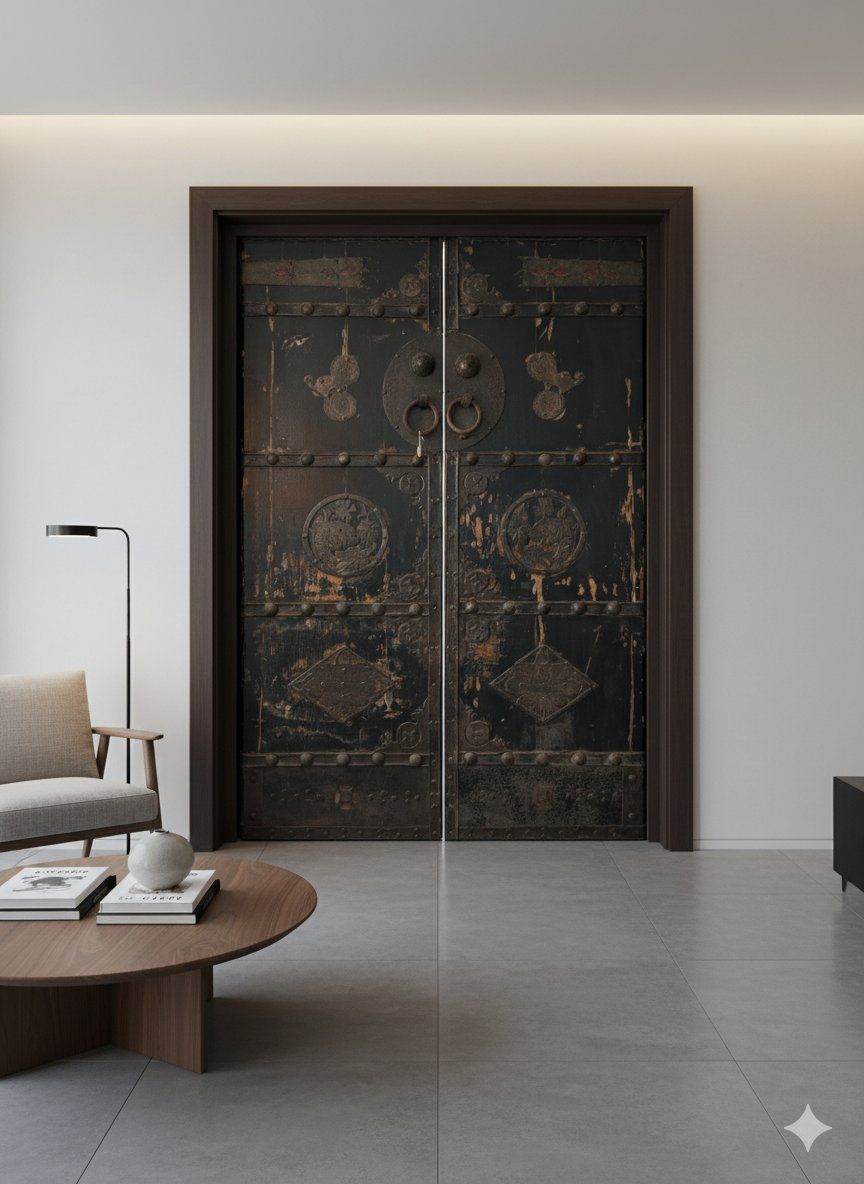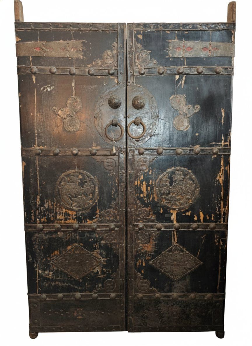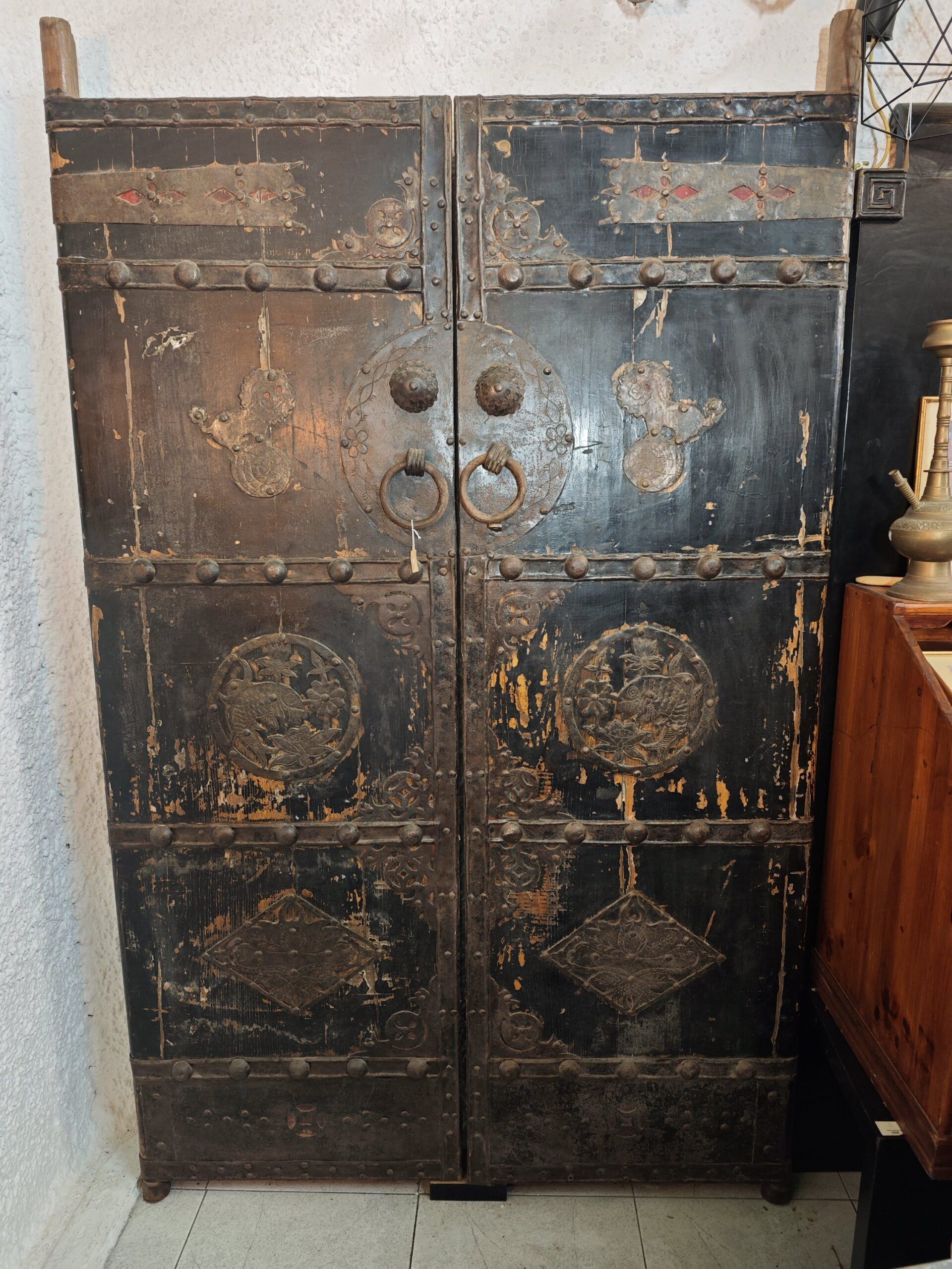 The design stands out for its intricate carved reliefs and ornamental metal plates with symbolic oriental motifs., perfect for Wabi-Sabi environments, rustic or eclectic design. This double door is not only a functional element, but a collectible antique that brings an imposing presence and an air of historical nobility to any space, either as main entrance, room divider or decorative wall element.