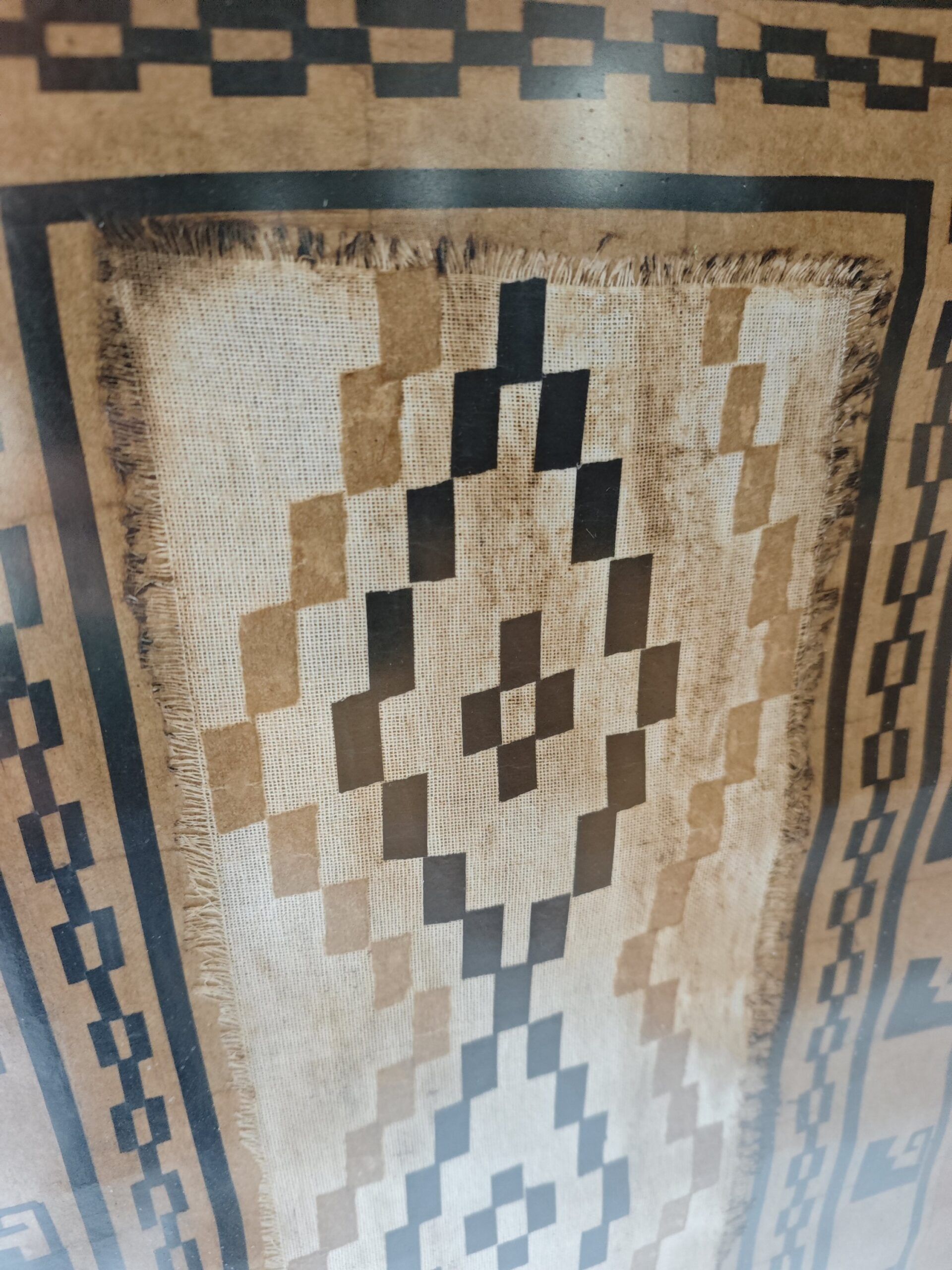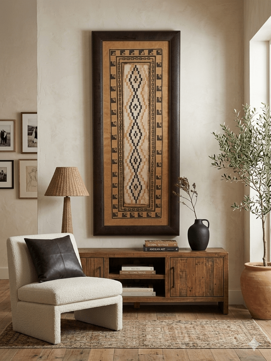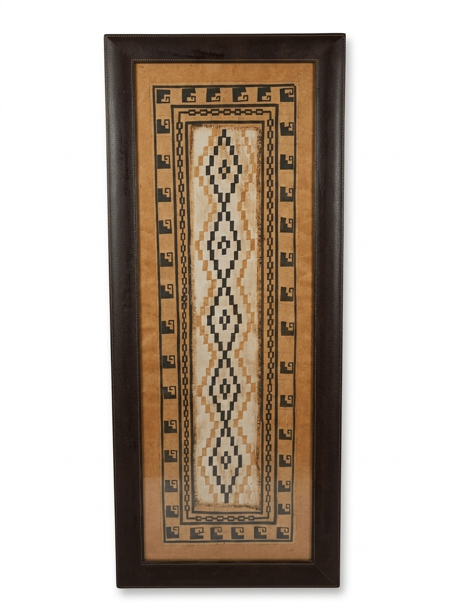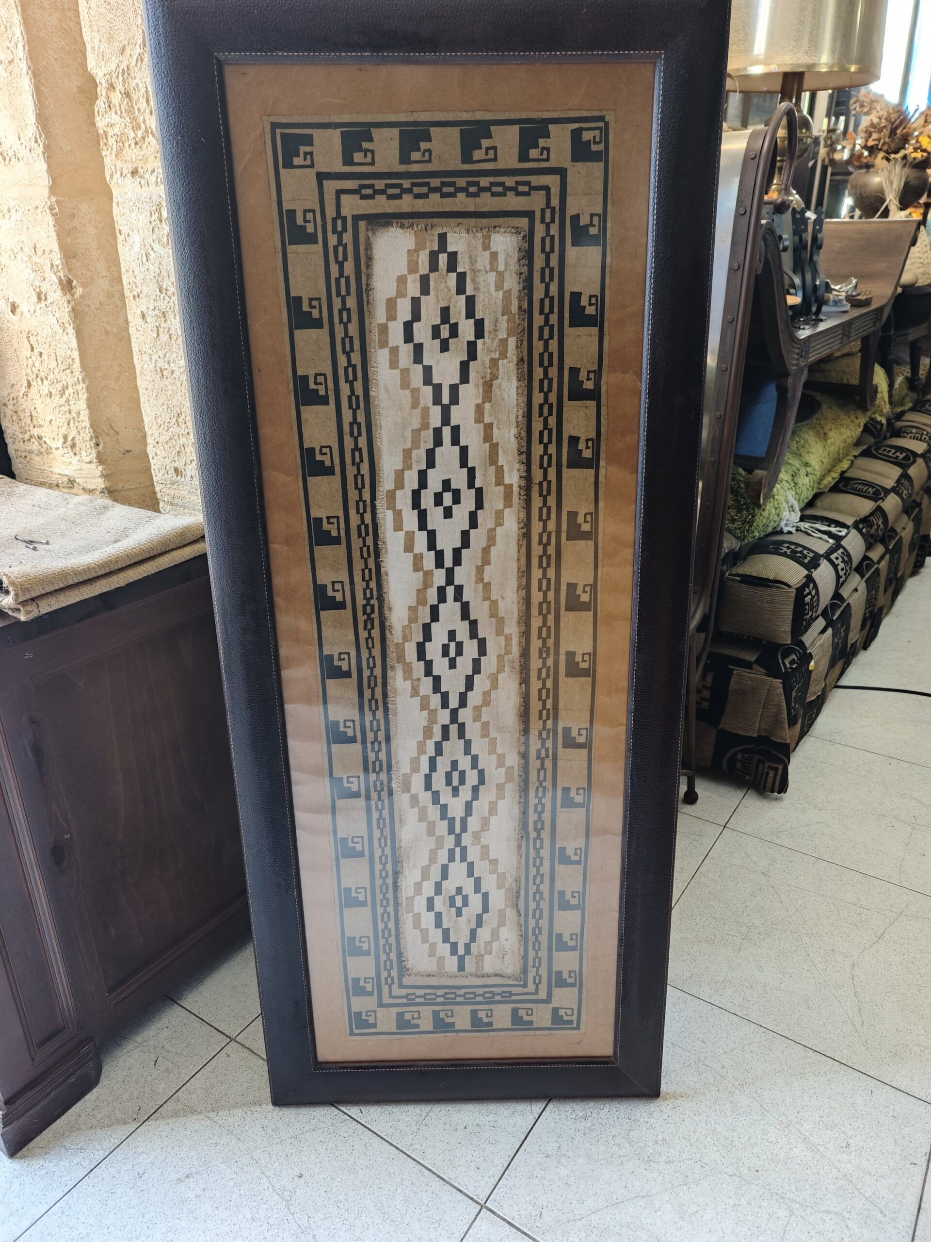 This exclusive tapestry stands out for its intricate tribal-inspired geometric design., made with artisanal weaving techniques in earth tones: beige, ocher and charcoal black. The centerpiece features a staggered diamond pattern that evokes the symbology of Andean or Southwestern cultures., surrounded by a decorative border with classical fretwork motifs. The contrast between the organic texture of the fabric and the elegant dark brown leather frame with visible seams provides a rustic and sophisticated character at the same time., ideal for Boho Chic style environments, Ethnic or Colonial.