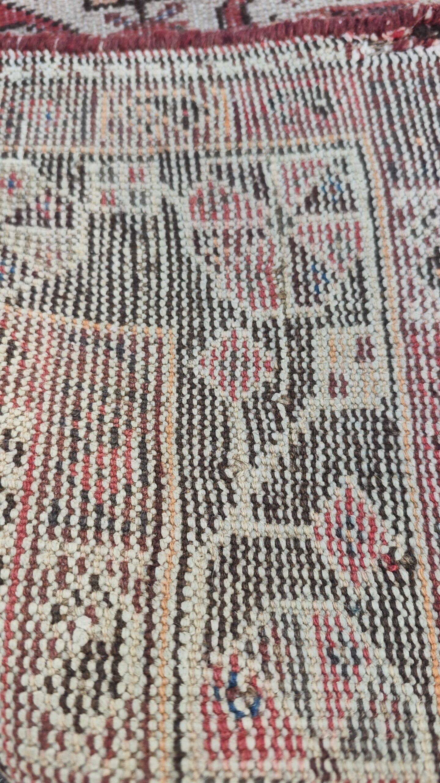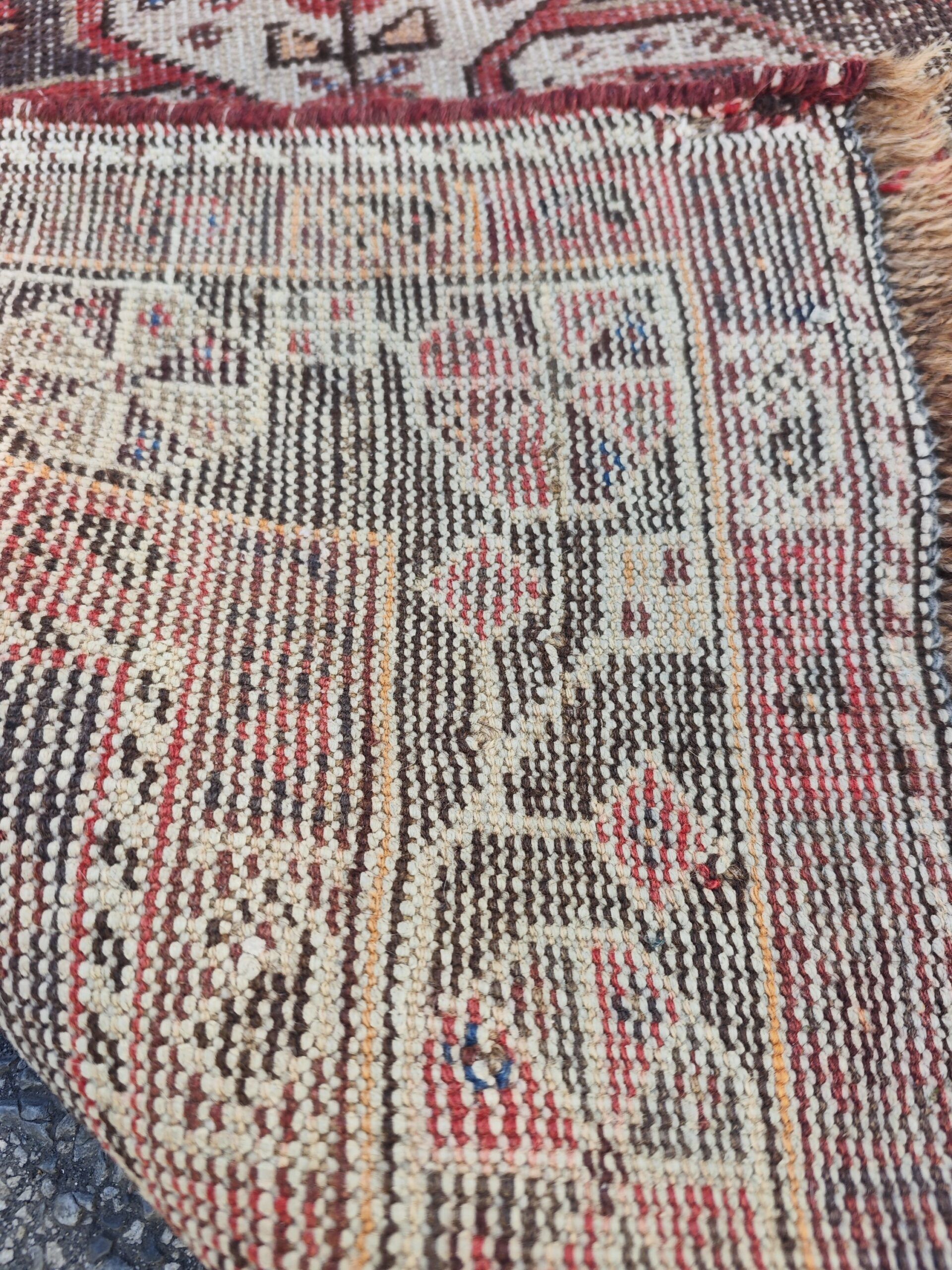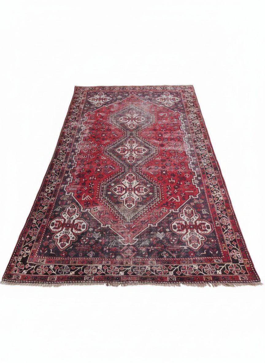 Embellezca su salón con esta magnífica alfombra vintage hecha a mano, una pieza de artesanía textil que combina tradición y durabilidad. Este modelo destaca por su complejo diseño geométrico de medallones centrales y motivos tribales, característicos de las alfombras persas o de estilo oriental. Tejida en lana de alta calidad, presenta una paleta de colores rica en rojos profundos, granates y detalles en crema y azul marino que han adquirido una pátina auténtica con el tiempo.