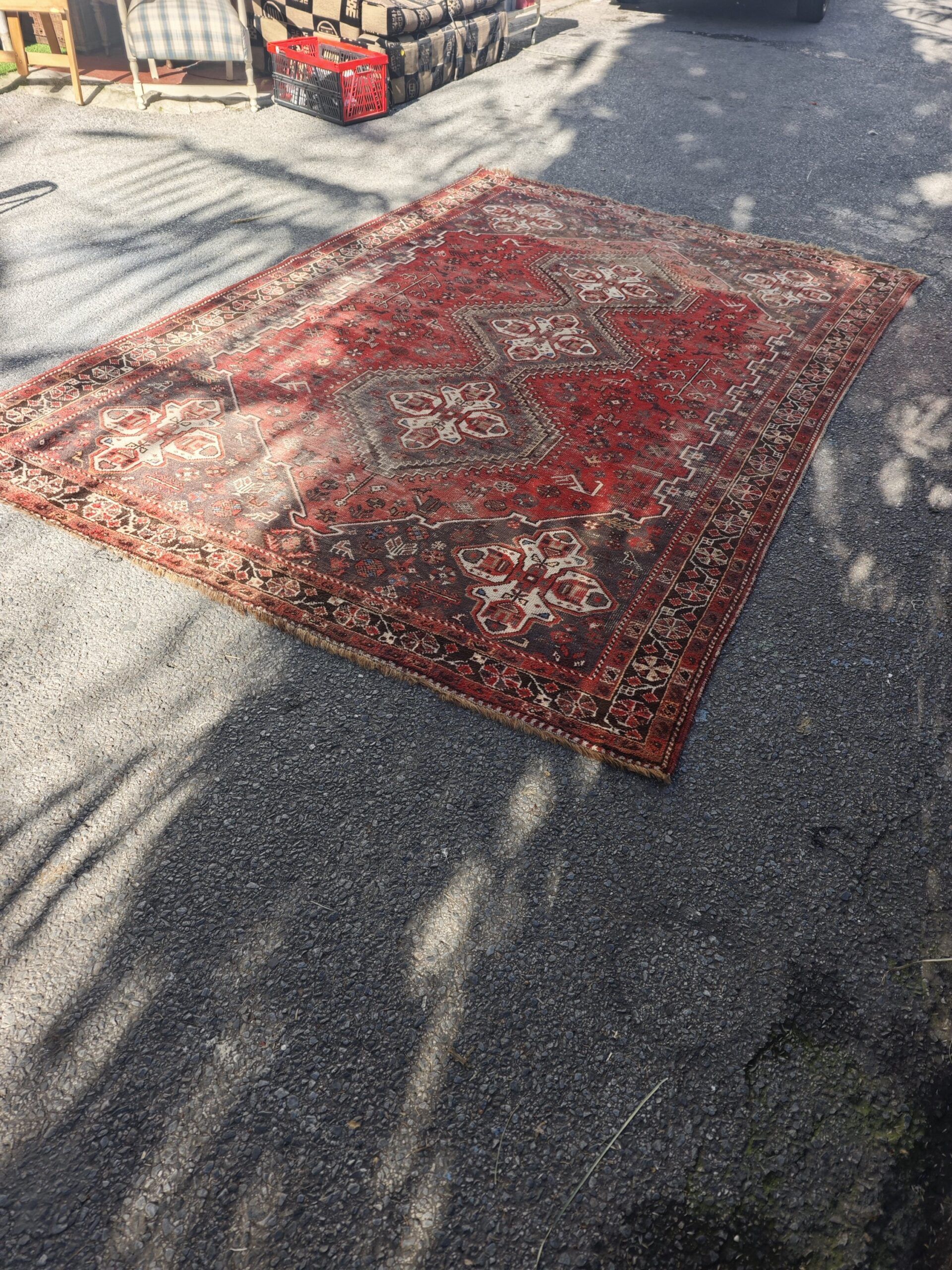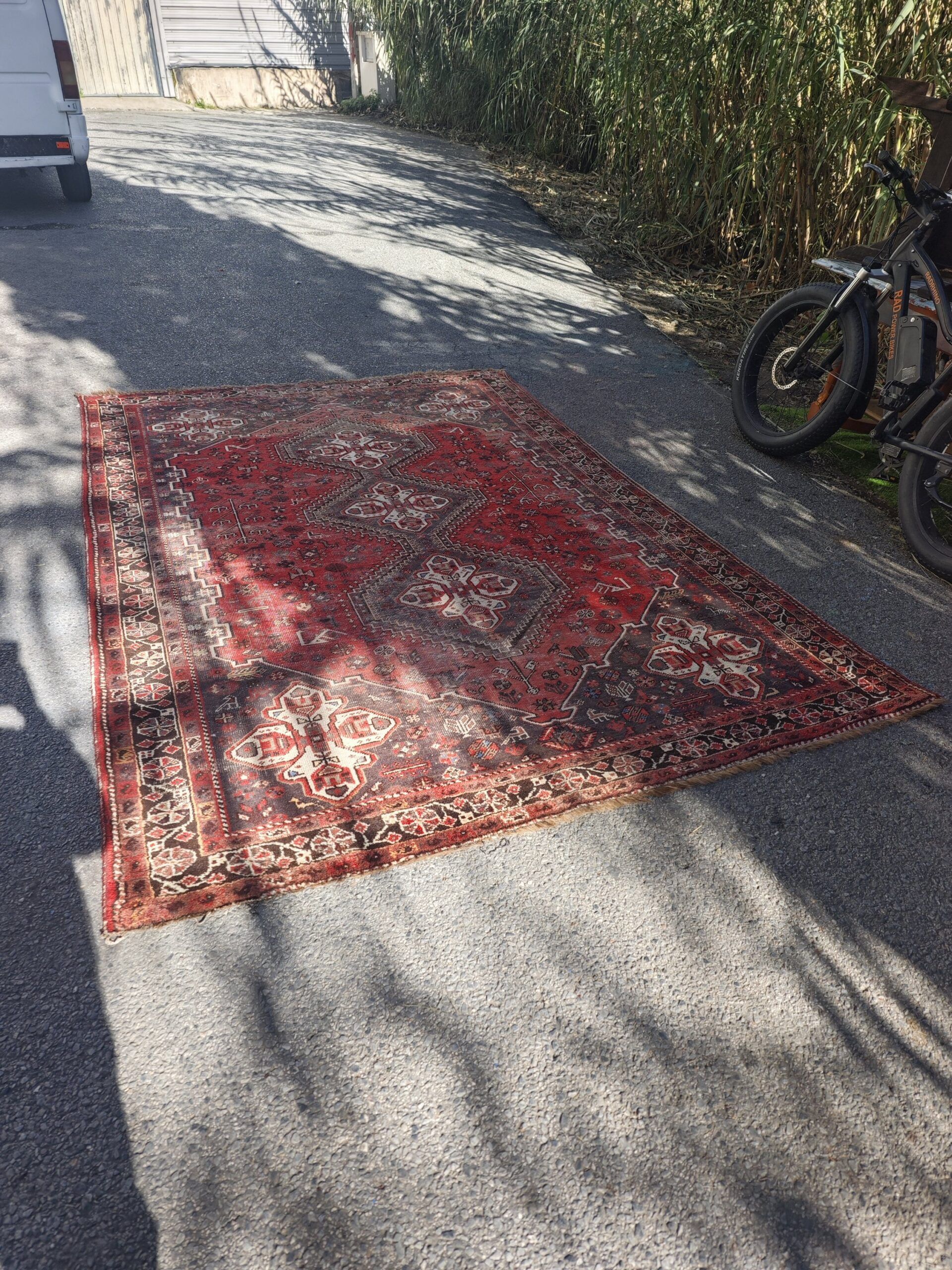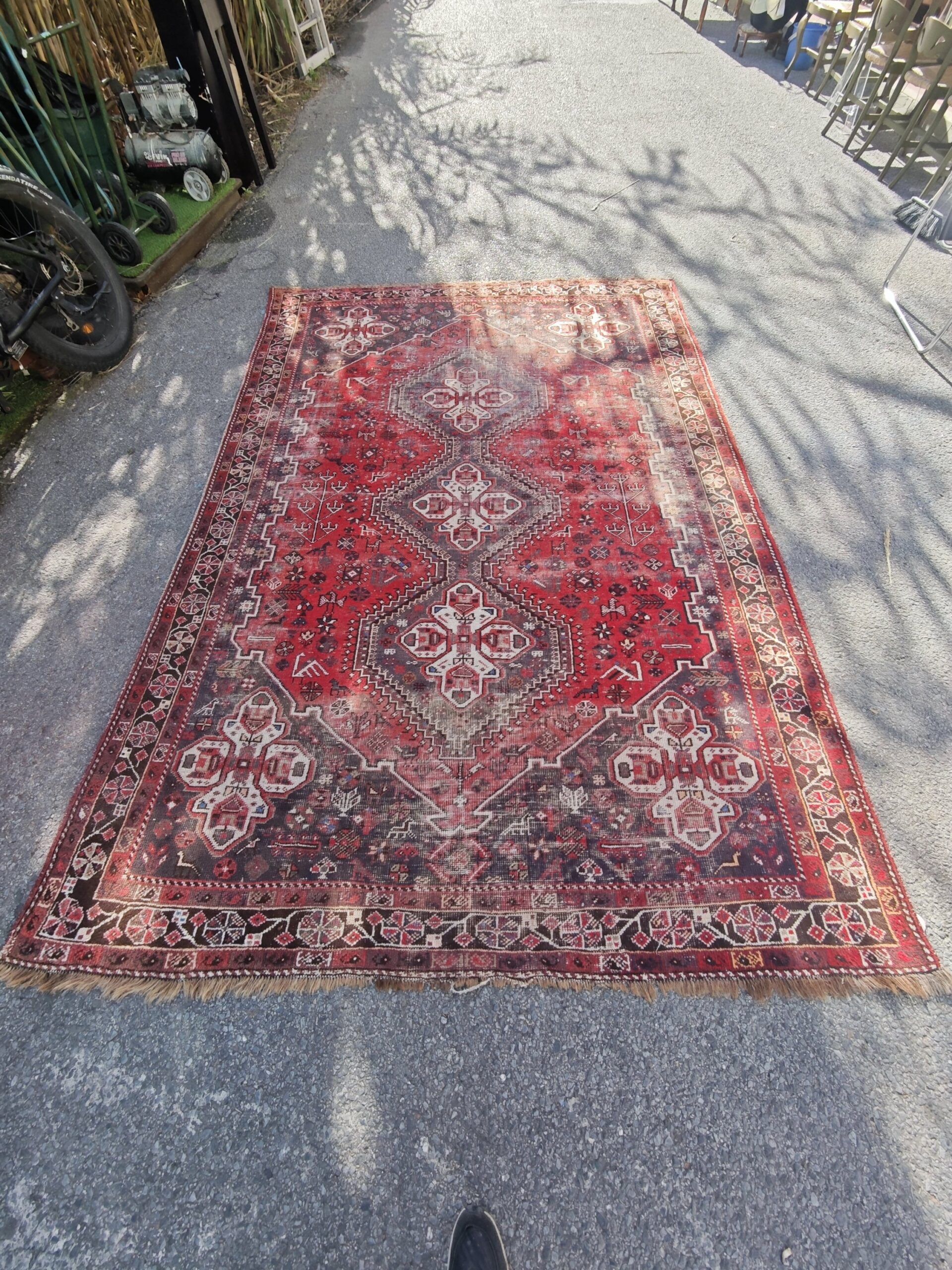 Embellezca su salón con esta magnífica alfombra vintage hecha a mano, una pieza de artesanía textil que combina tradición y durabilidad. Este modelo destaca por su complejo diseño geométrico de medallones centrales y motivos tribales, característicos de las alfombras persas o de estilo oriental. Tejida en lana de alta calidad, presenta una paleta de colores rica en rojos profundos, granates y detalles en crema y azul marino que han adquirido una pátina auténtica con el tiempo.