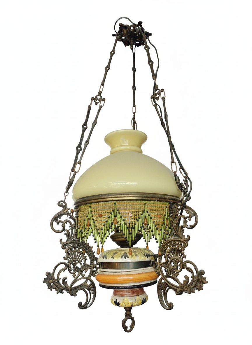 Antigua Lámpara Holandesa S. XIX-XX. Fabricada en metal labrado, tulipa de cristal y cuerpo de cerámica decorada. Conserva sus flecos de cuentas originales.