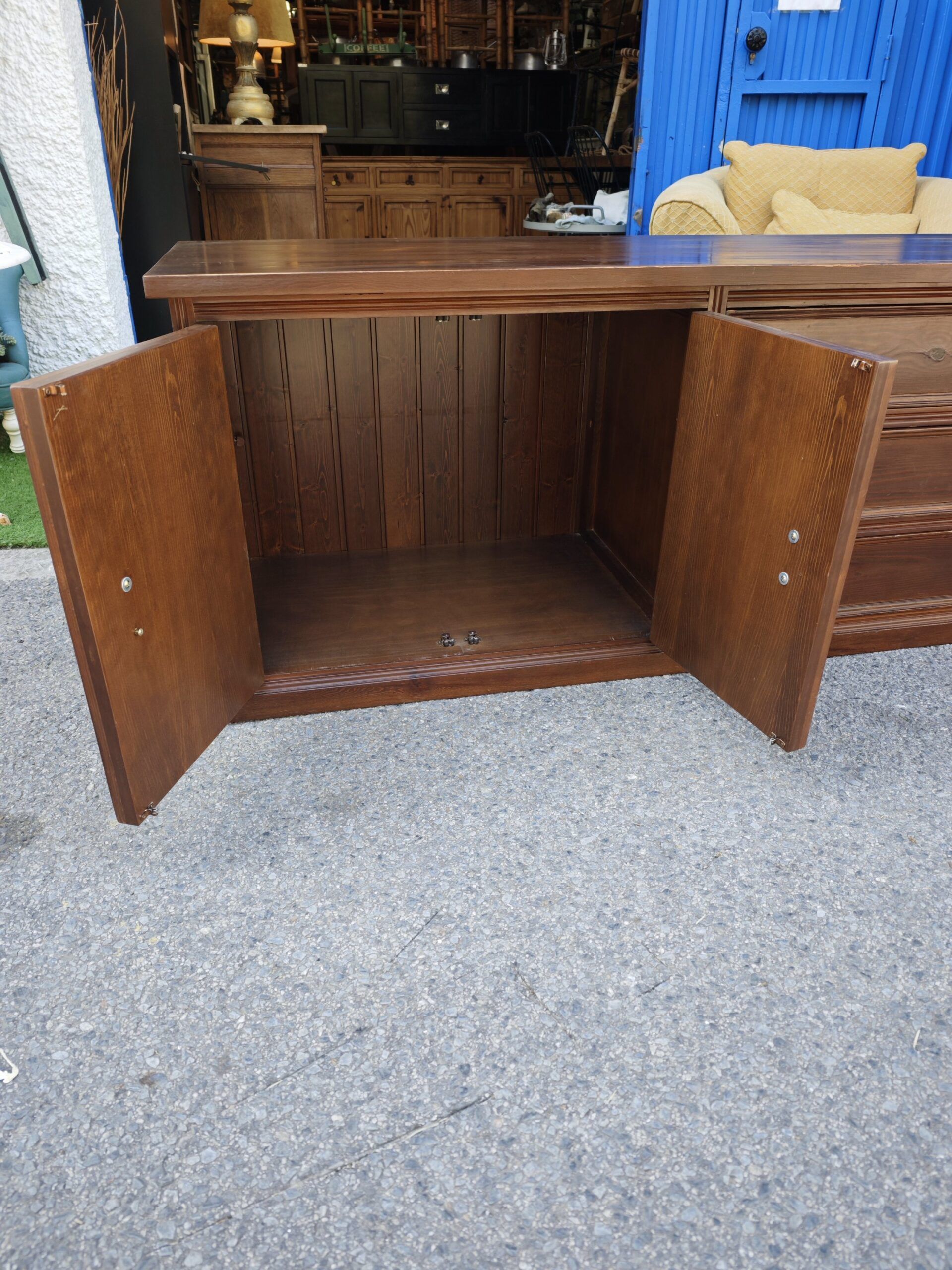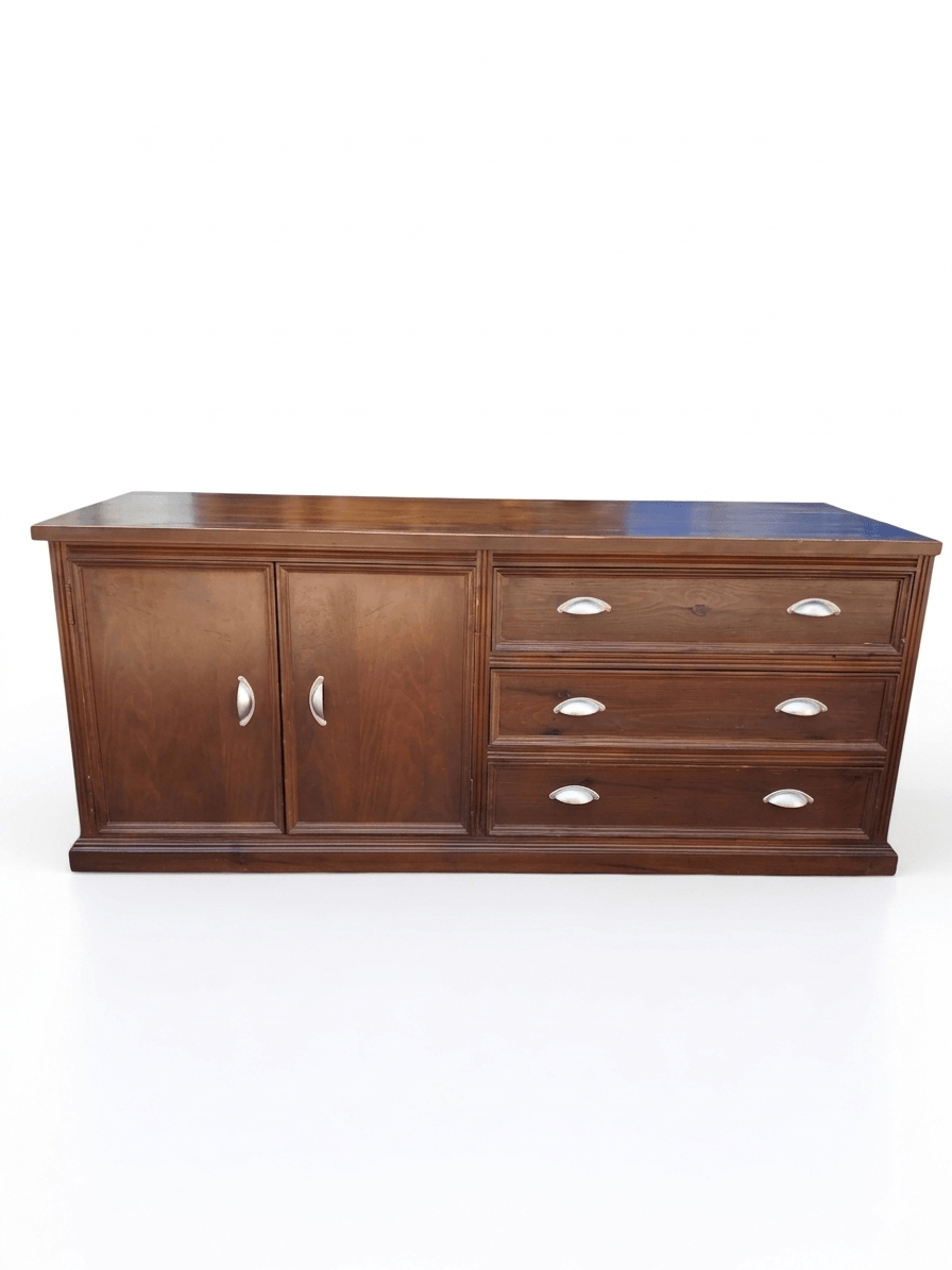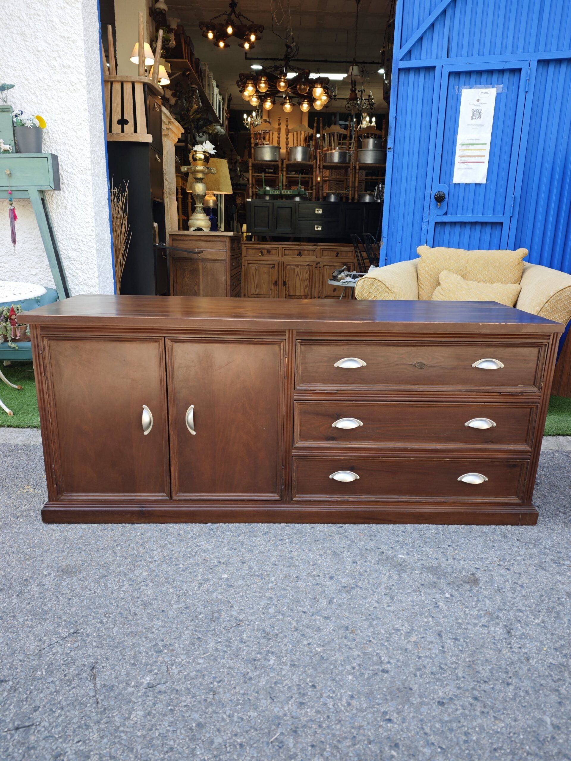Elegante aparador bajo de estilo rústico contemporáneo, fabricado en madera con un cálido acabado en tono nogal. Este mueble destaca por su diseño funcional y equilibrado, dividido en dos secciones: un módulo de doble puerta con gran capacidad de almacenaje y un bloque de tres cajones amplios. Los tiradores metálicos tipo concha en acabado plata satinada aportan un toque industrial vintage que moderniza la pieza. Gracias a su altura de 70 cm, es el mueble perfecto para utilizar como mueble de televisión, buffet en el comedor o incluso como pieza de entrada en recibidores amplios. Su estructura sólida y líneas limpias garantizan una integración armoniosa en cualquier estancia.