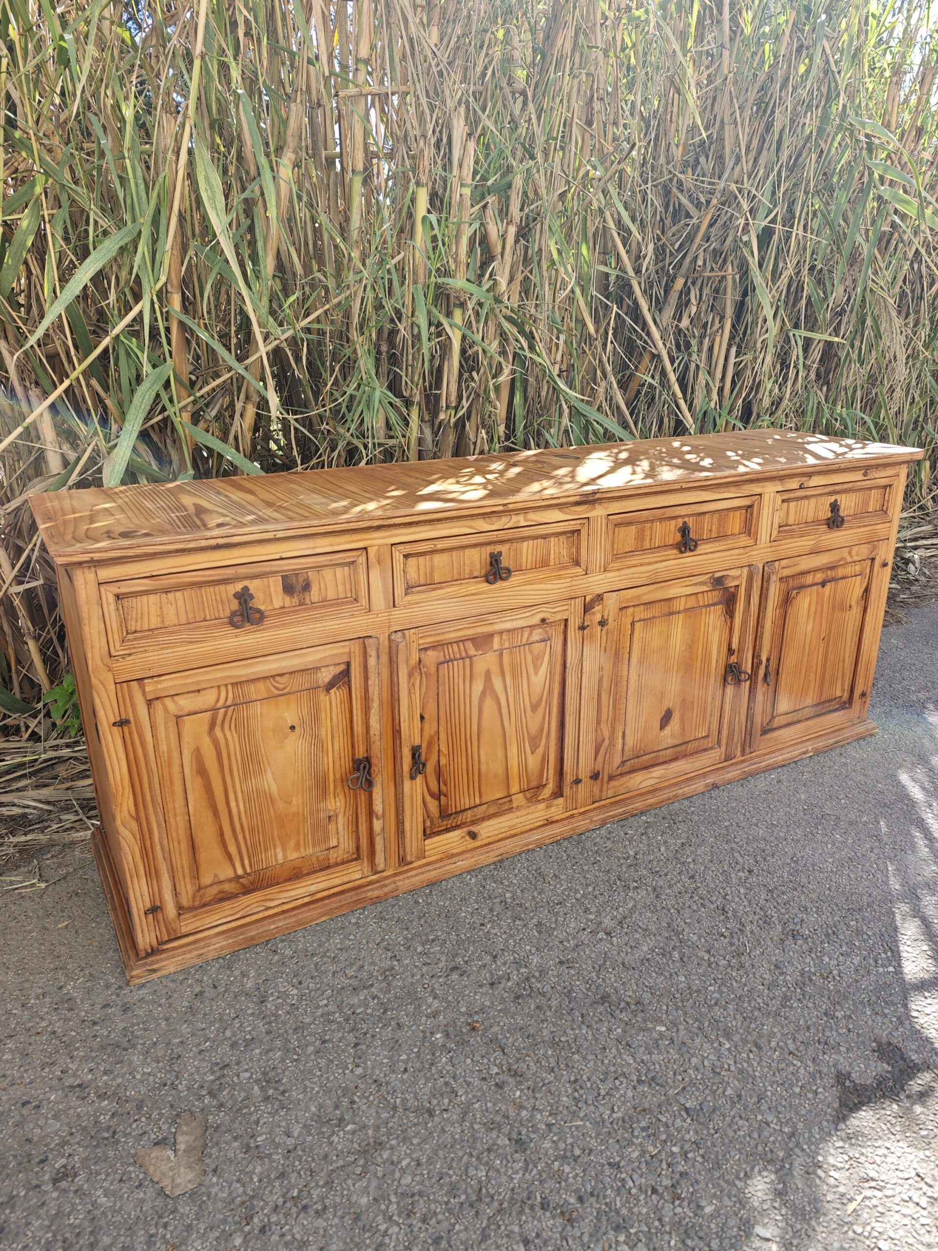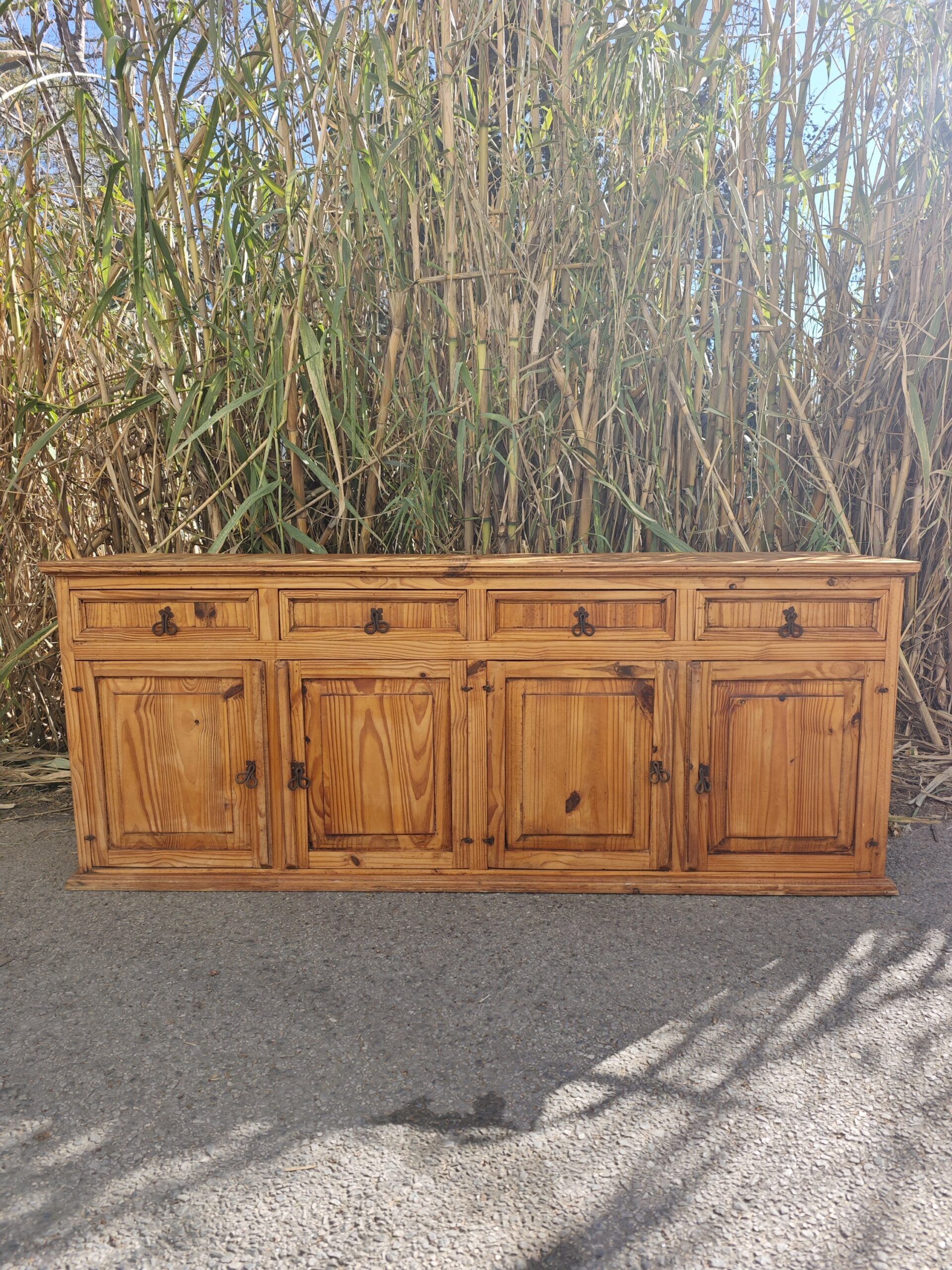 Amplio aparador rústico de madera lavada con 4 puertas y 4 cajones. Medidas: 201 cm de ancho, 51 cm de fondo y 79 cm de altura.