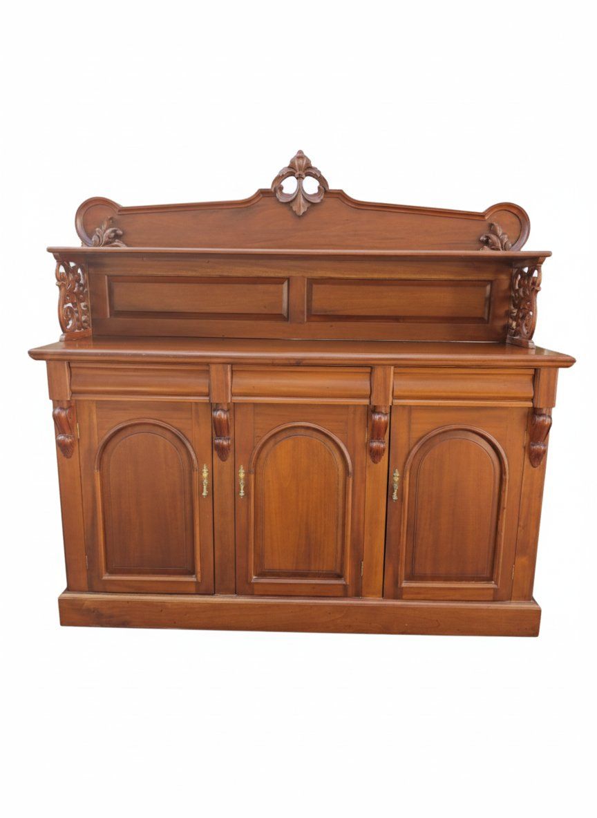 Este aparador buffet de estilo vintage es una pieza de carácter noble y presencia imponente. Fabricado en madera maciza con un acabado cálido en tono caoba, destaca por sus tres puertas arqueadas con tiradores de latón envejecido y delicadas tallas ornamentales en las esquinas. El copete superior, ricamente trabajado con motivos florales y volutas, es desmontable, permitiendo adaptar la altura según el espacio o estilo deseado.