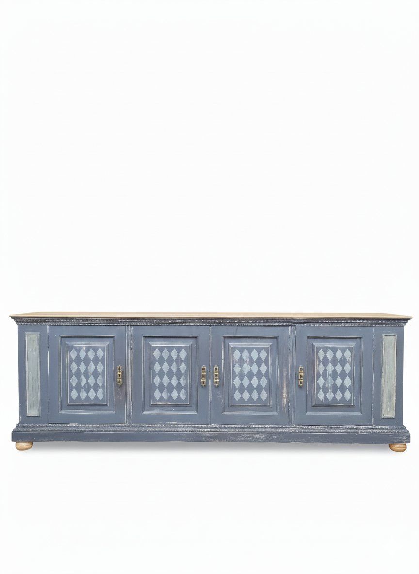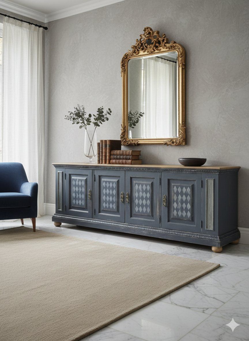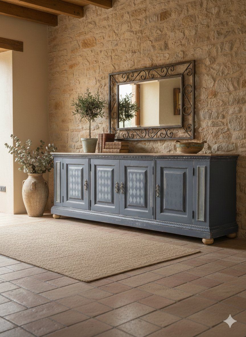 La tapa superior en madera natural clara contrasta elegantemente con la base en tonos azul grisáceo envejecido, creando una armonía cromática que transmite serenidad y sofisticación. Es ideal para espacios que buscan funcionalidad sin renunciar al estilo: desde salones y comedores hasta recibidores amplios o zonas de paso con carácter.