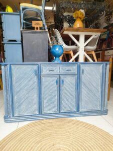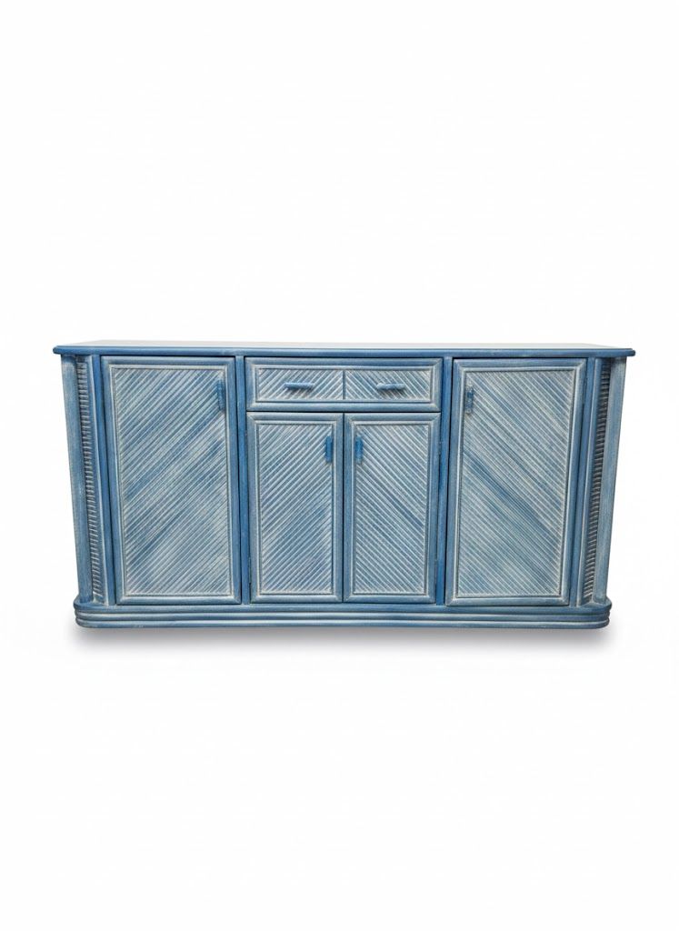 Este aparador vintage azul de madera maciza destaca por su diseño original con textura diagonal en puertas y cajones, que aporta dinamismo y carácter artesanal. Con una estructura robusta y elegante, ofrece gran capacidad de almacenaje gracias a sus cuatro puertas (dos grandes laterales y dos centrales) y dos cajones superiores.