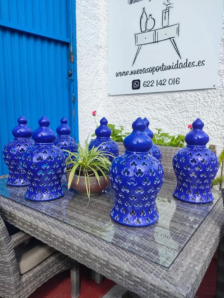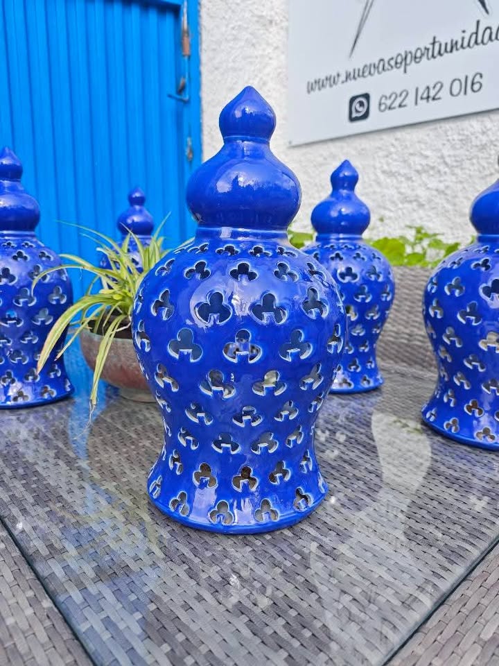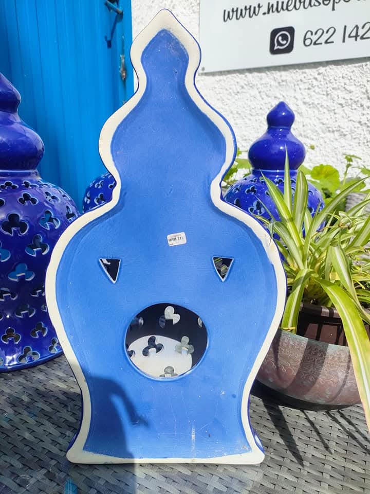 Este aplique cerámico azul está diseñado para decorar paredes con estilo mediterráneo, boho chic o tradicional andaluz. Fabricado en cerámica esmaltada, presenta un acabado brillante en azul intenso y formas caladas de tréboles que permiten el paso de la luz si se utiliza como porta velas o luminaria.