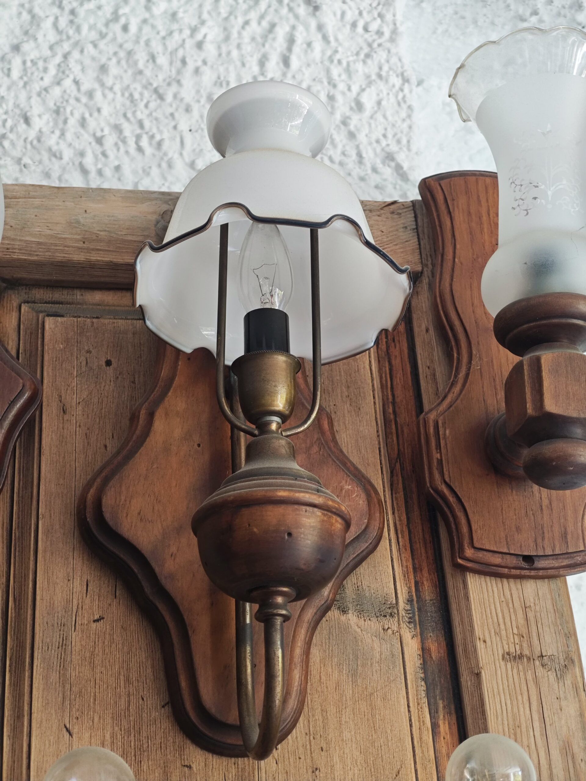 Este aplique de pared vintage es una pieza excepcional que combina la calidez de la madera maciza con la elegancia del metal envejecido. Su diseño de inspiración clásica presenta una base de madera tallada con formas sinuosas que resaltan el carácter rústico y artesanal de la pieza. La estructura de metal sostiene una delicada tulipa de cristal opalescente con borde ondulado, diseñada para difundir una luz suave y acogedora en cualquier estancia.