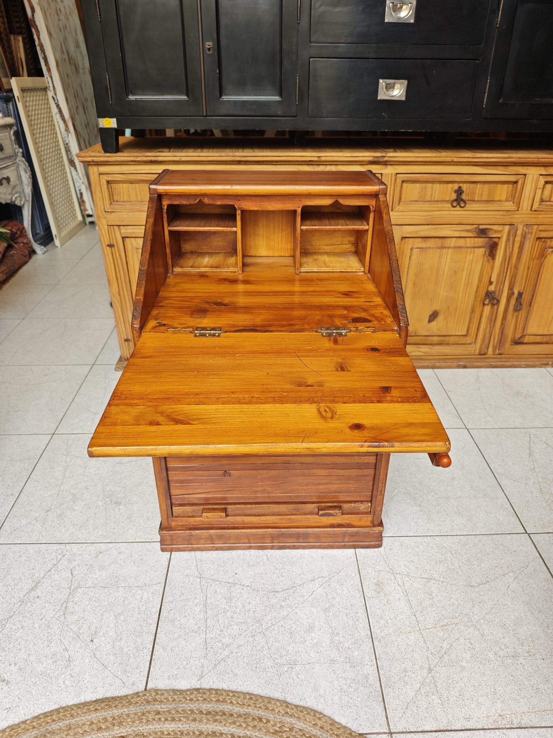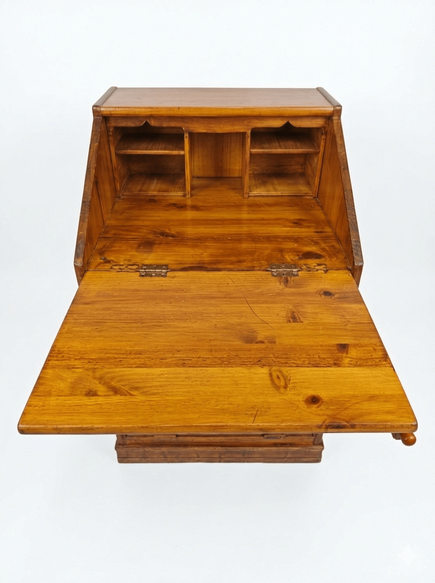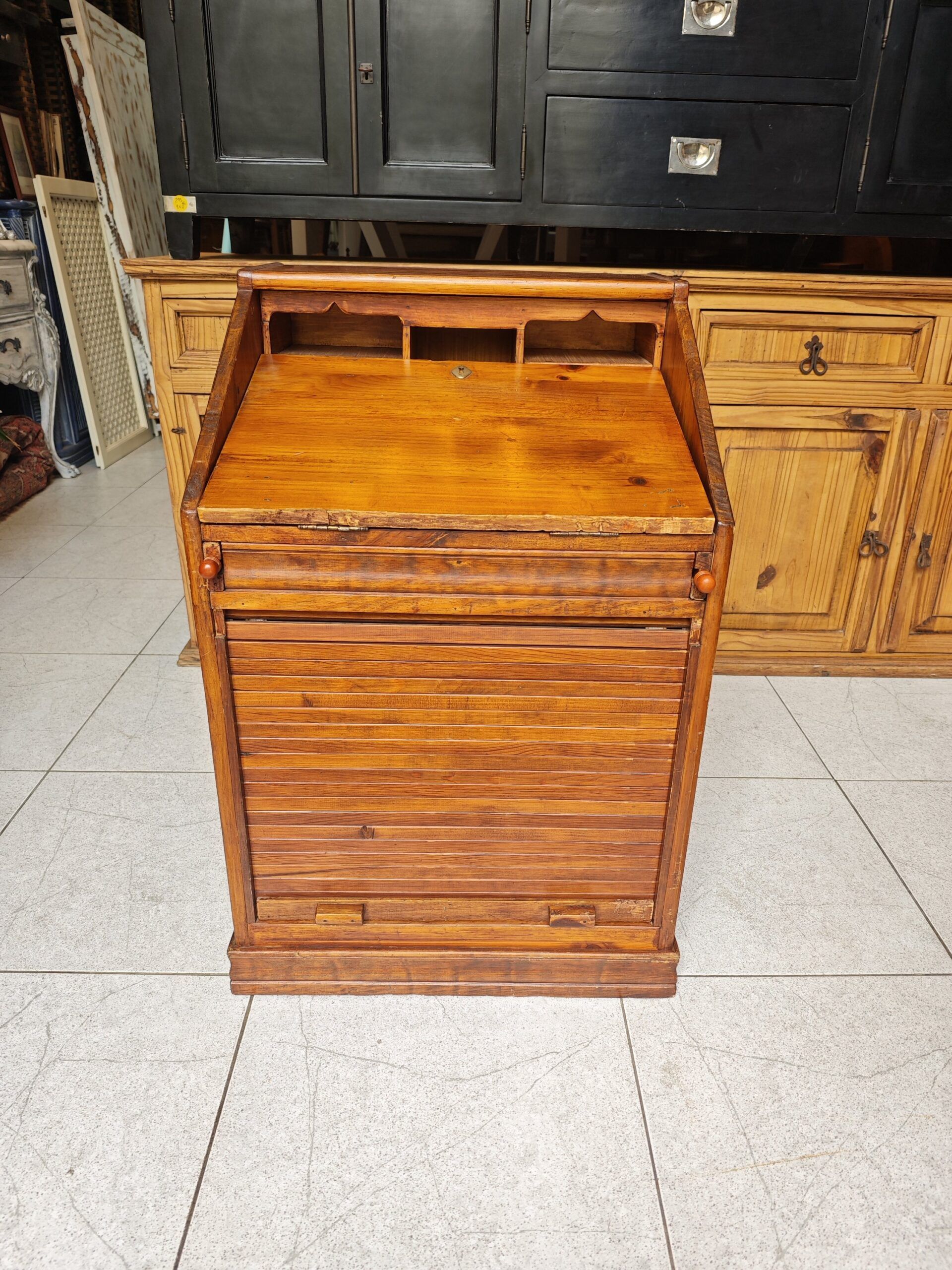 Este archivador buró de persiana es una pieza excepcional que combina la funcionalidad de un mueble de oficina con el encanto del diseño clásico. Fabricado en madera maciza con un acabado natural que resalta las vetas y la calidez del material, este mueble destaca por su versatilidad. Cuenta con una parte superior abatible que se convierte en una cómoda superficie de trabajo o escritorio, revelando un organizador interno con nichos y estantes para documentos. La parte inferior dispone de un sistema de cierre de persiana de deslizamiento suave, ideal para mantener el orden y proteger archivos de forma discreta. Su estructura robusta y compacta lo hace perfecto tanto para despachos profesionales como para rincones de lectura o estudios en casa, aportando un carácter atemporal y profesional a cualquier estancia.