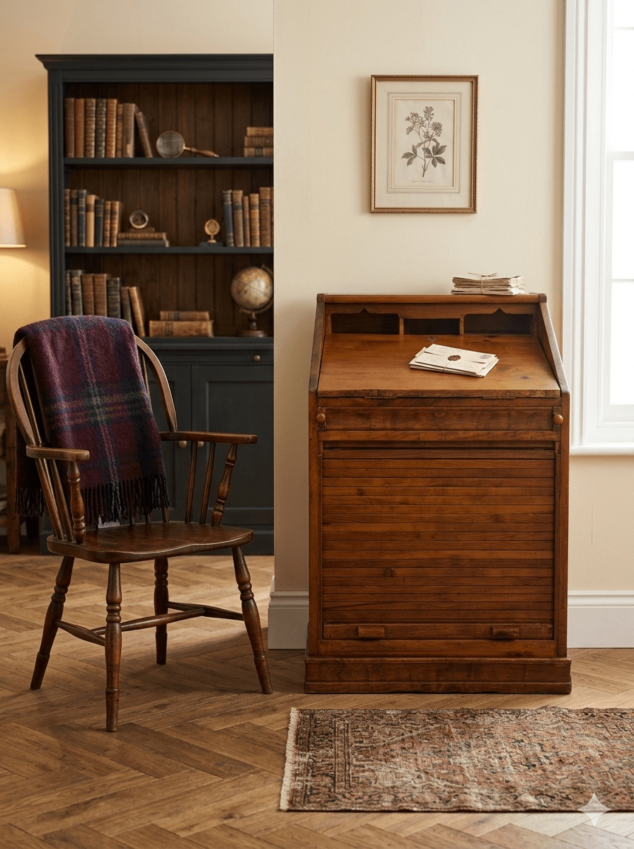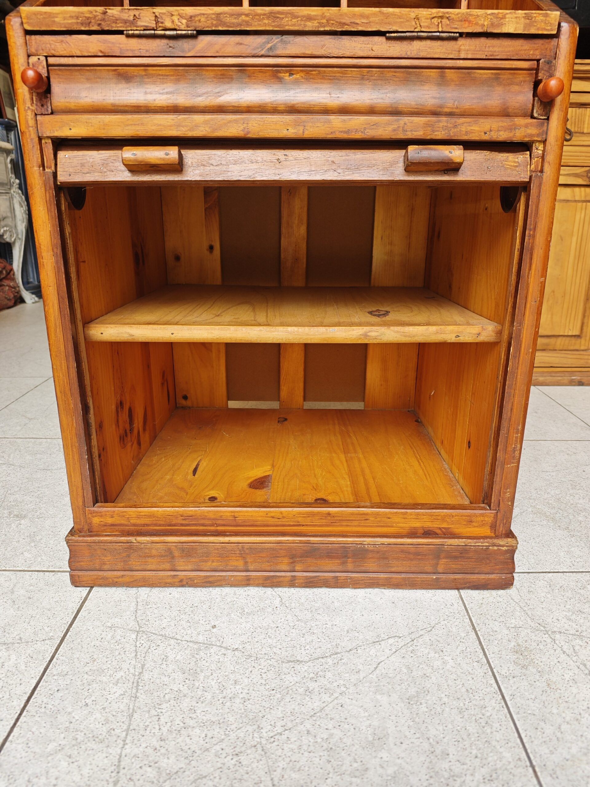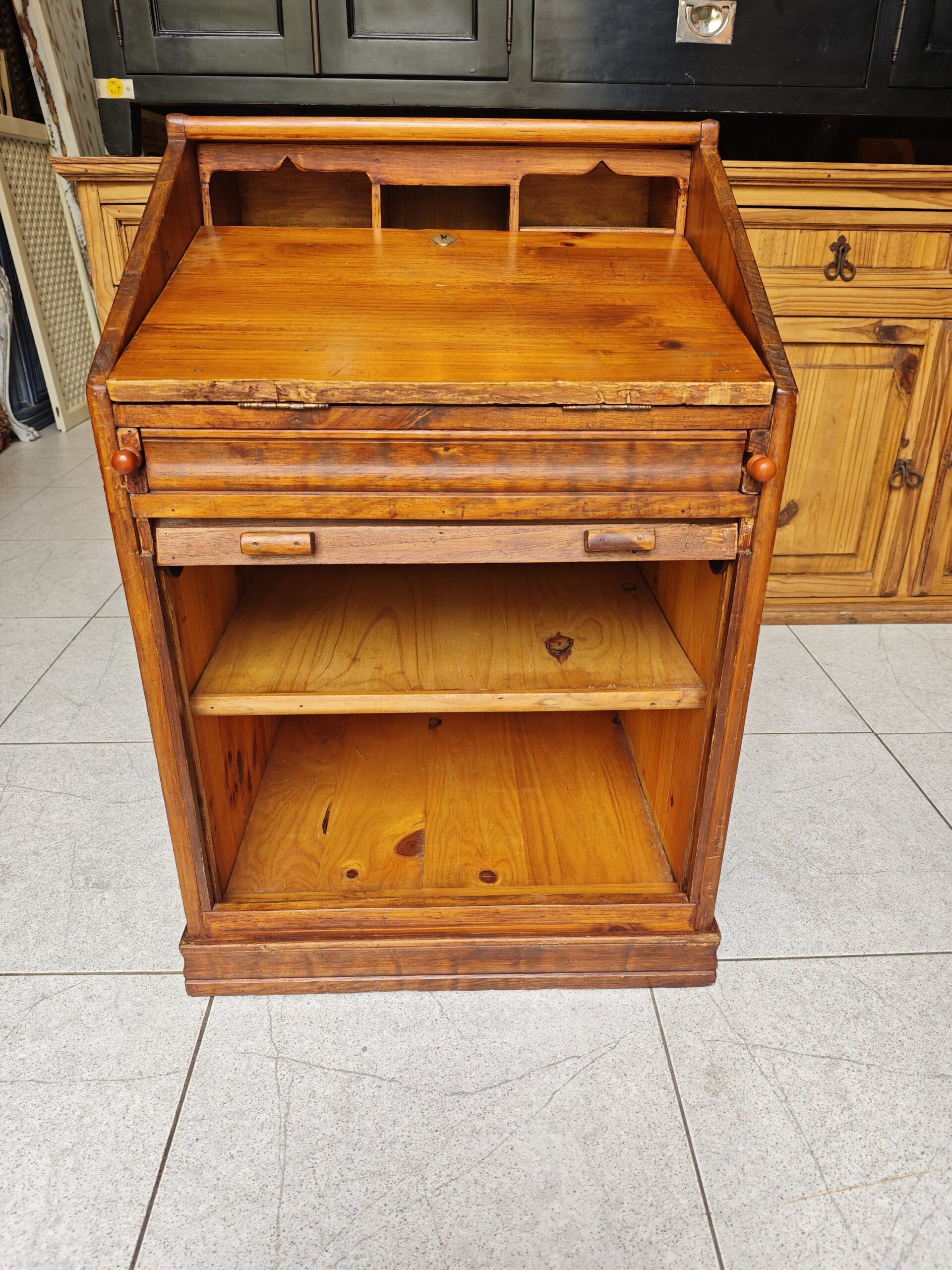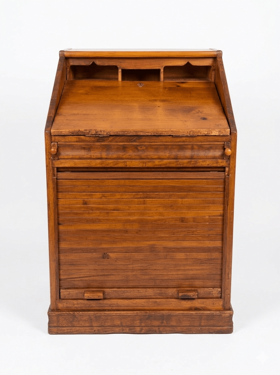 Este archivador buró de persiana es una pieza excepcional que combina la funcionalidad de un mueble de oficina con el encanto del diseño clásico. Fabricado en madera maciza con un acabado natural que resalta las vetas y la calidez del material, este mueble destaca por su versatilidad. Cuenta con una parte superior abatible que se convierte en una cómoda superficie de trabajo o escritorio, revelando un organizador interno con nichos y estantes para documentos. La parte inferior dispone de un sistema de cierre de persiana de deslizamiento suave, ideal para mantener el orden y proteger archivos de forma discreta. Su estructura robusta y compacta lo hace perfecto tanto para despachos profesionales como para rincones de lectura o estudios en casa, aportando un carácter atemporal y profesional a cualquier estancia.