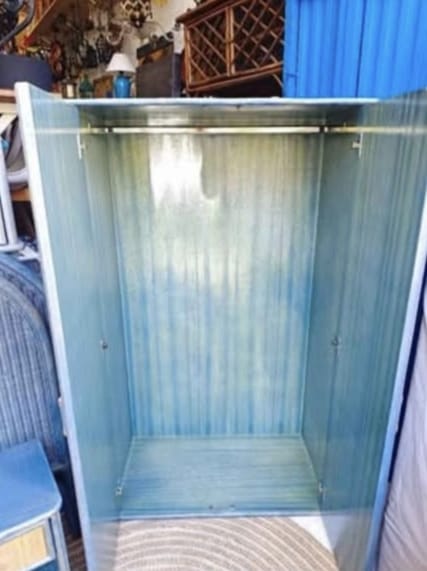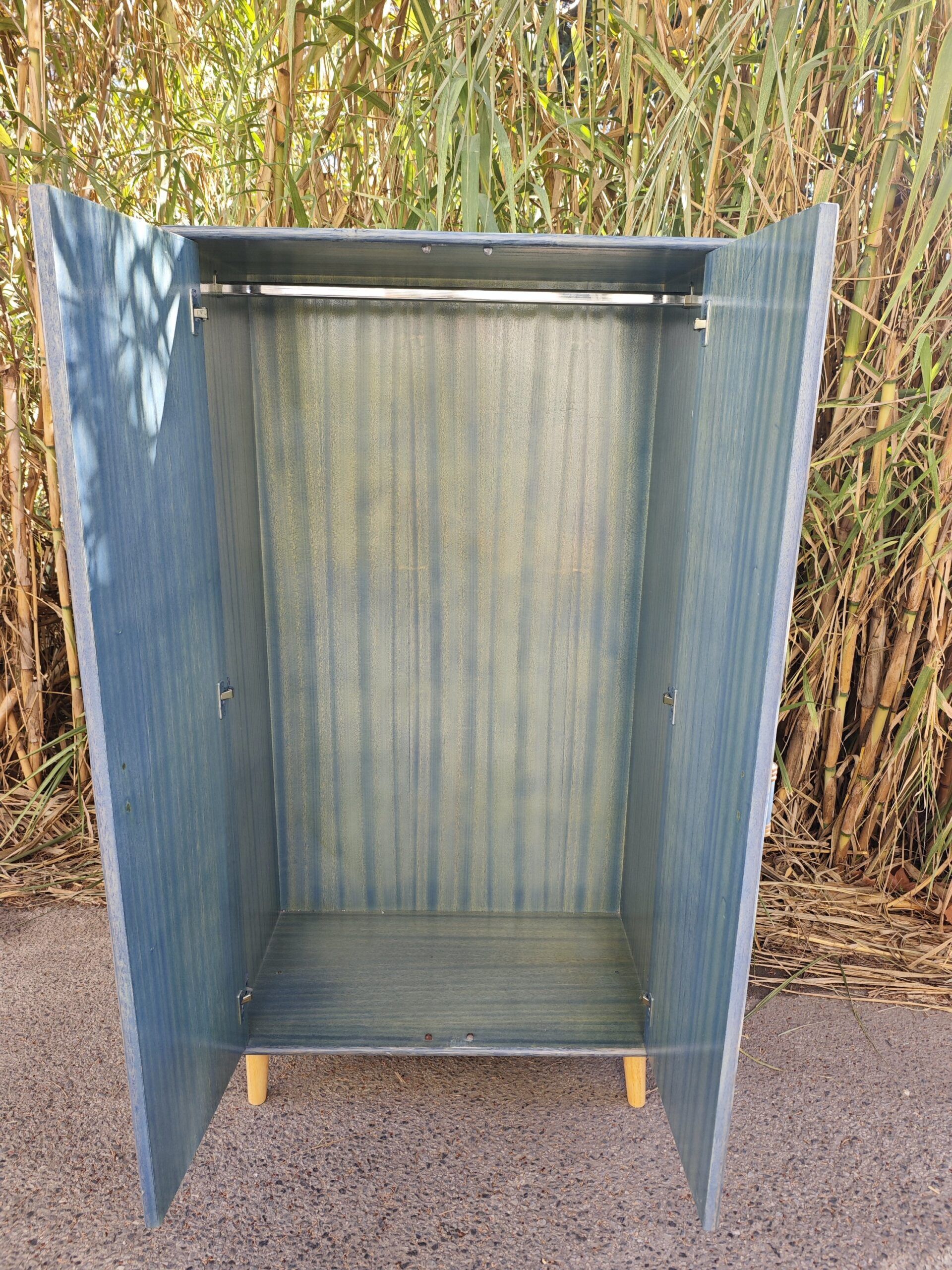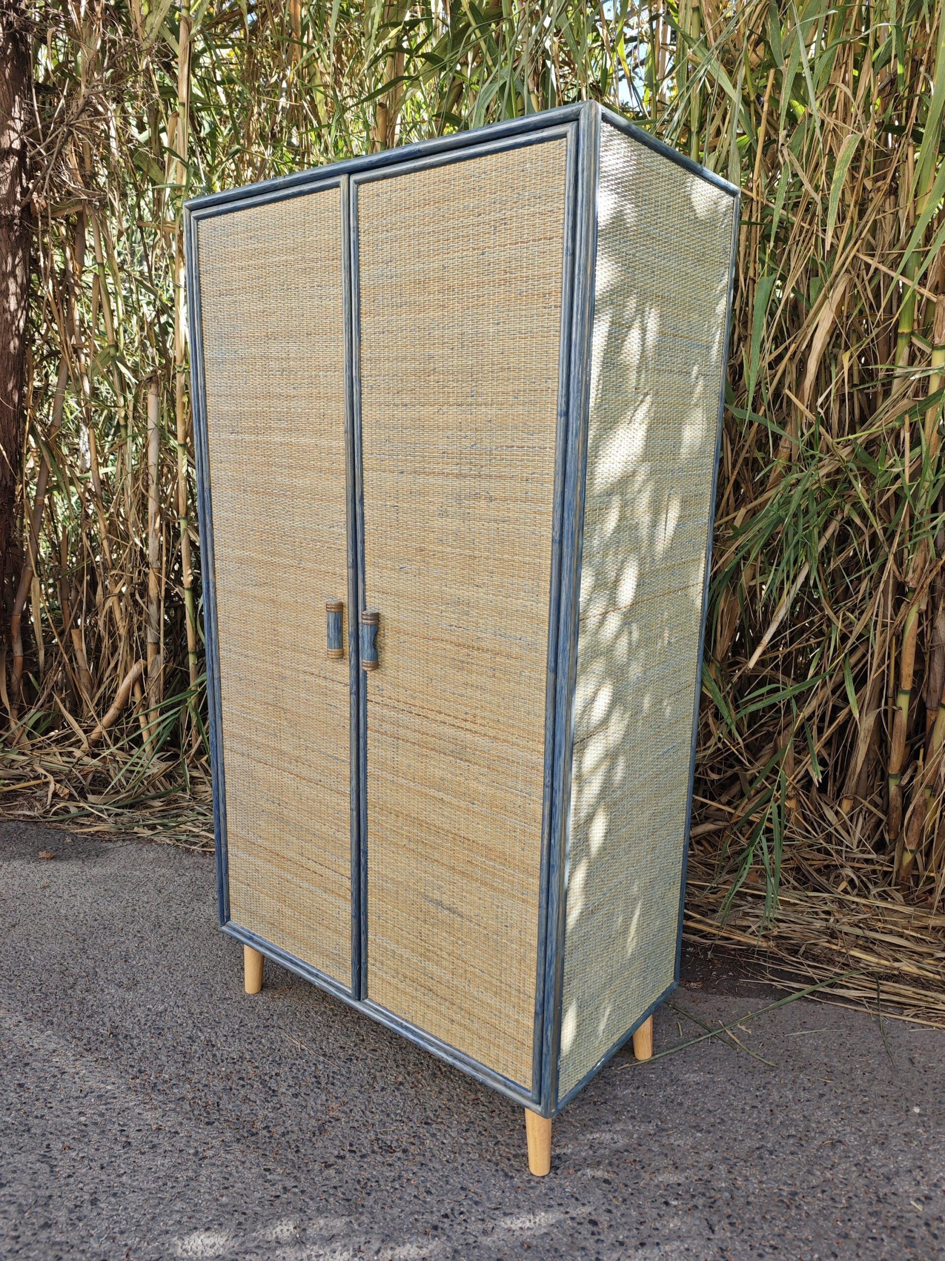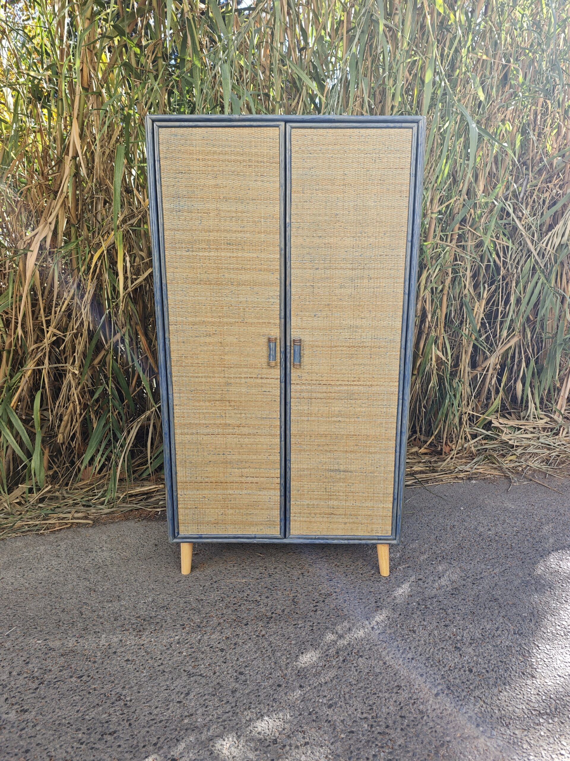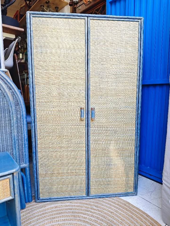 Este armario compacto de dos puertas combina estructura de madera pintada en azul con paneles de ratán natural trenzado, creando una pieza decorativa y funcional con aire mediterráneo y boho chic. Su diseño vertical y compacto lo hace ideal para dormitorios, recibidores, salones o espacios comerciales, aportando textura, color y capacidad de almacenaje.