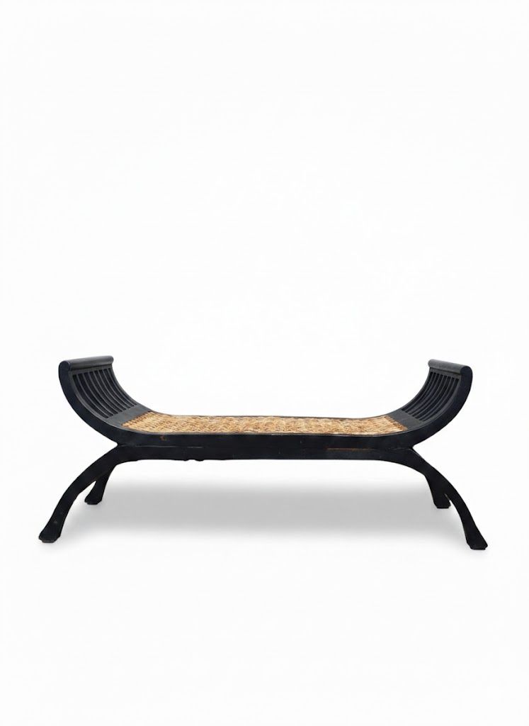 Banco descalzador de madera y ratán natural. Diseño artesanal ideal para dormitorio, recibidor o vestidor con estilo mediterráneo. Largo 120 cm Ancho 36 cm Alto 58 cm