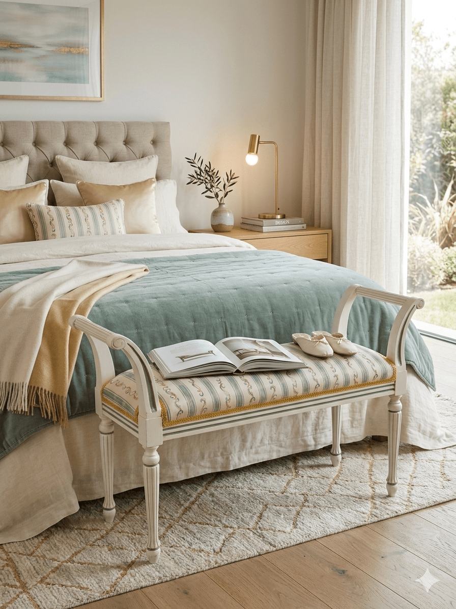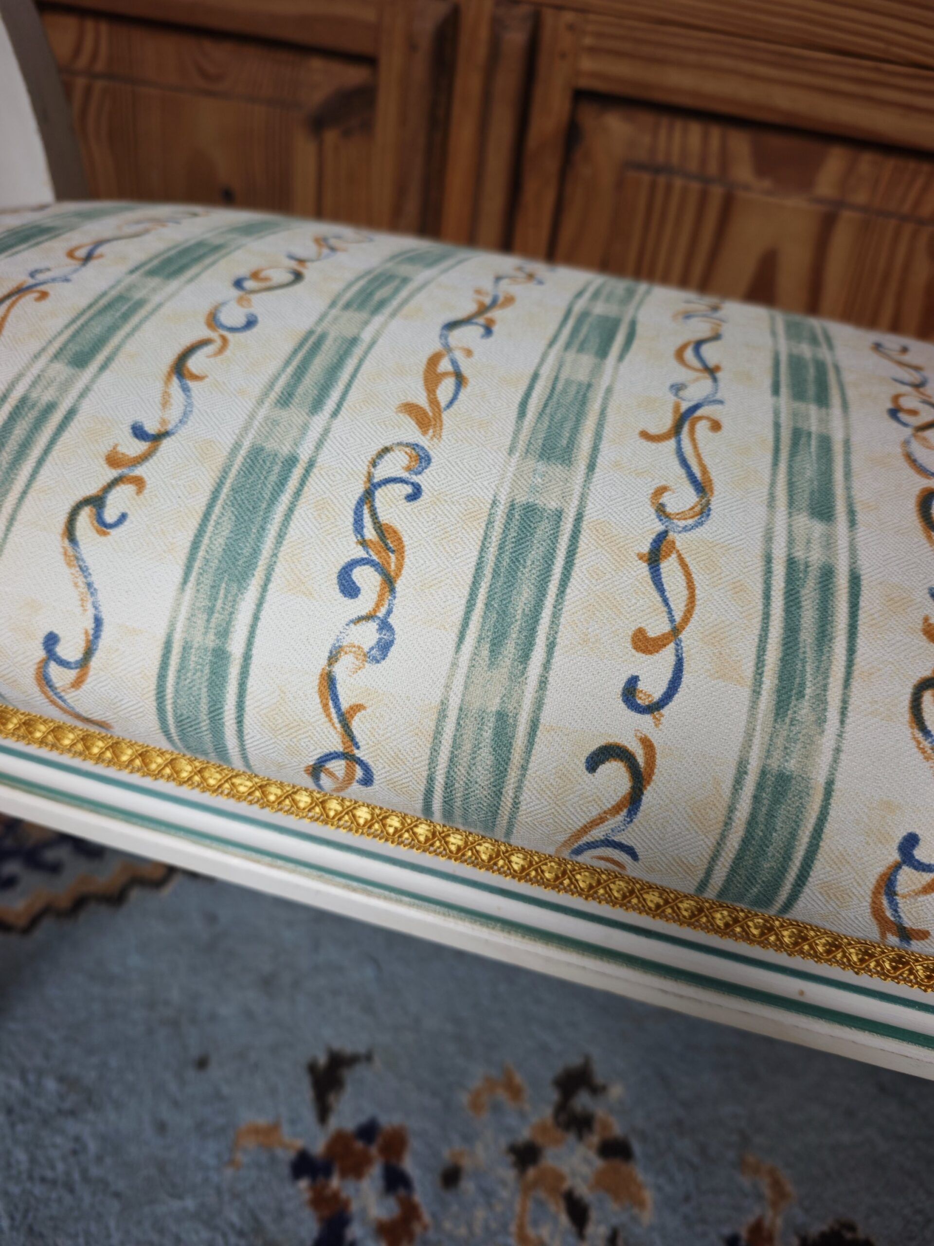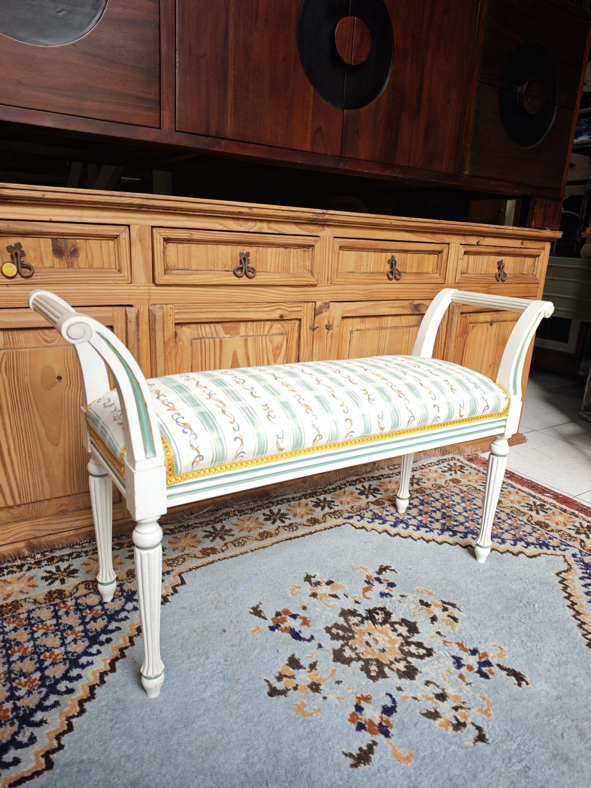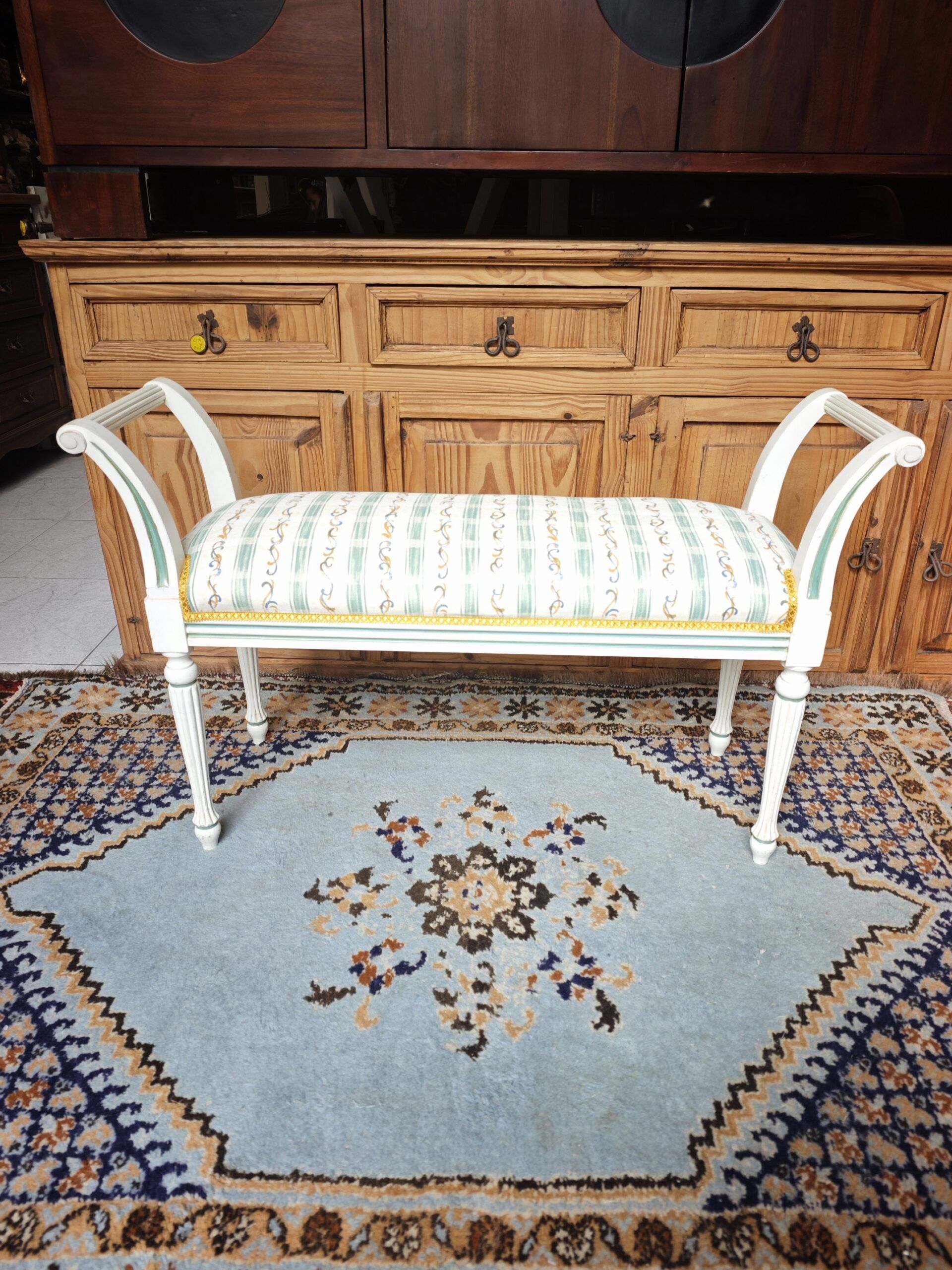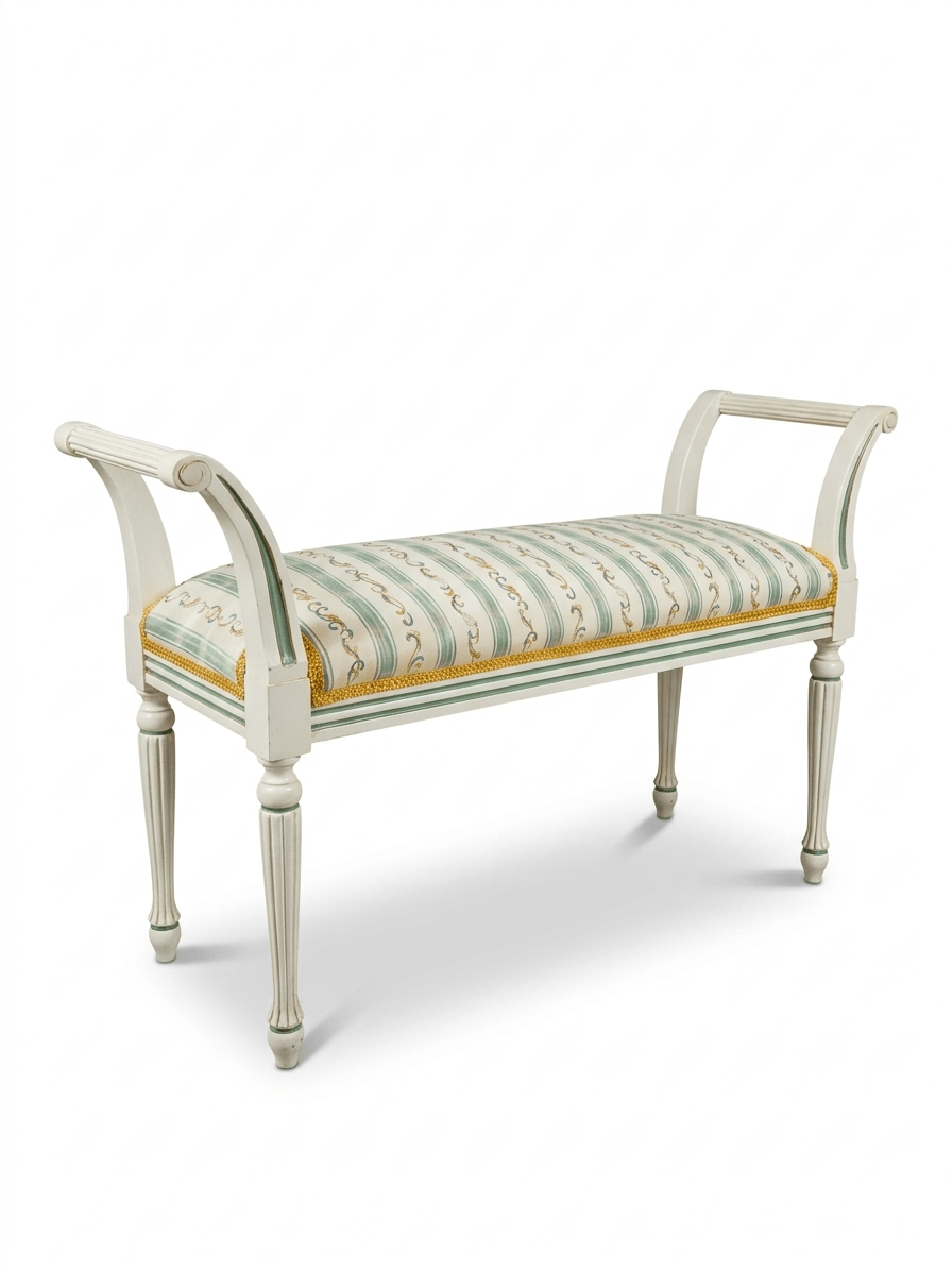 Elegante banqueta descalzadora tipo góndola, inspirada en el estilo Luis XVI. Presenta una estructura de madera maciza tallada y lacada en blanco con detalles en verde mint, resaltando sus patas acanaladas. El asiento está vestido con una exquisita tapicería de seda con motivos clásicos y rematado con pasamanería dorada. Una pieza de gran lujo ideal para dormitorios señoriales o recibidores exclusivos en Marbella.