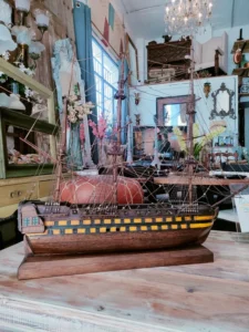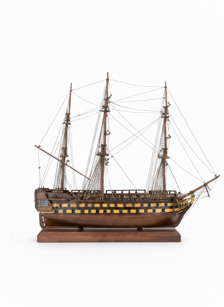 La calidad de la talla y el ensamblaje refleja un trabajo minucioso, ideal para coleccionistas, amantes de la historia marítima o espacios decorativos con estética náutica, vintage o ecléctica. Puede exhibirse sobre mesas, vitrinas o aparadores, convirtiéndose en un punto focal que transmite elegancia y pasión por el detalle.