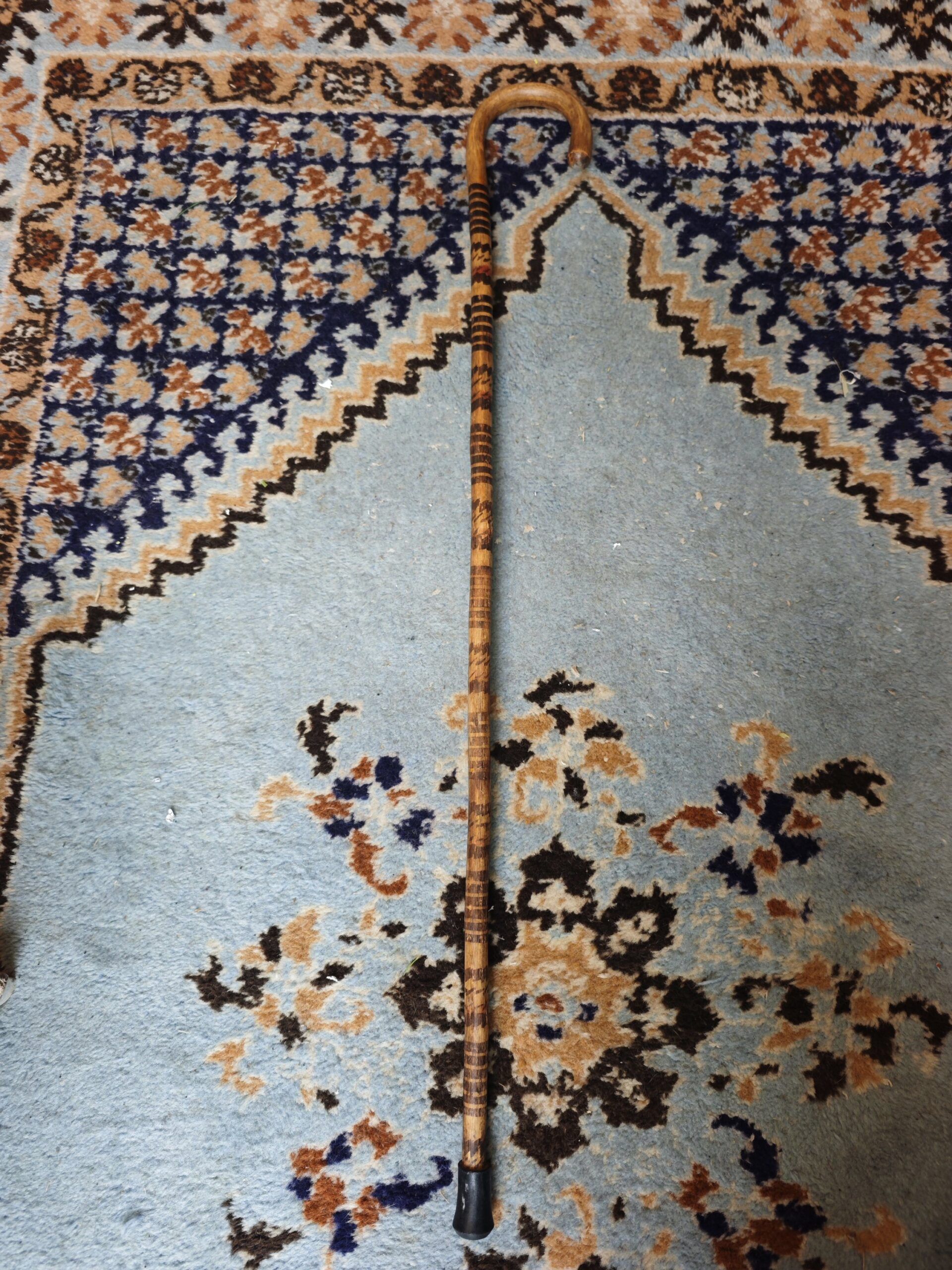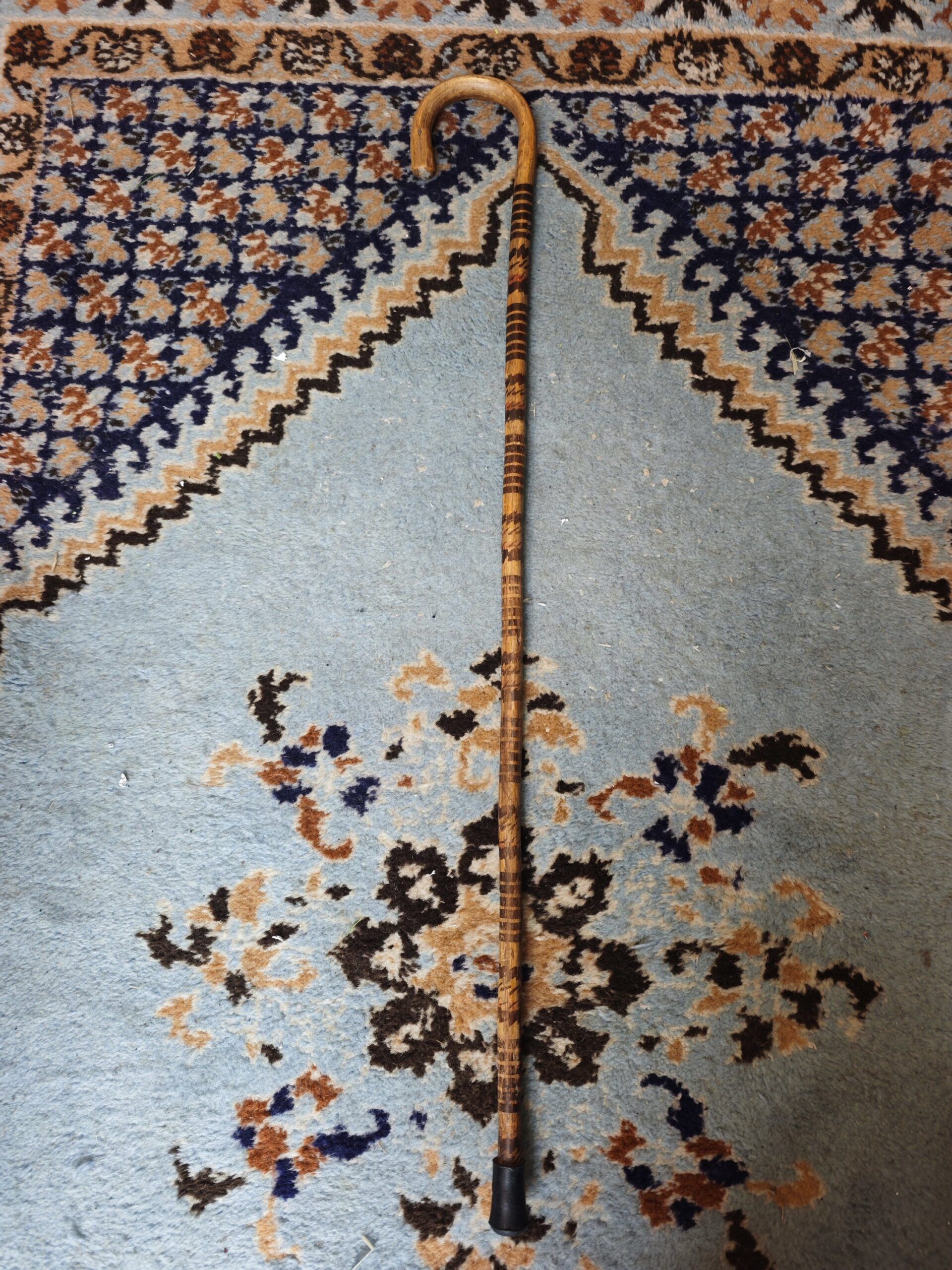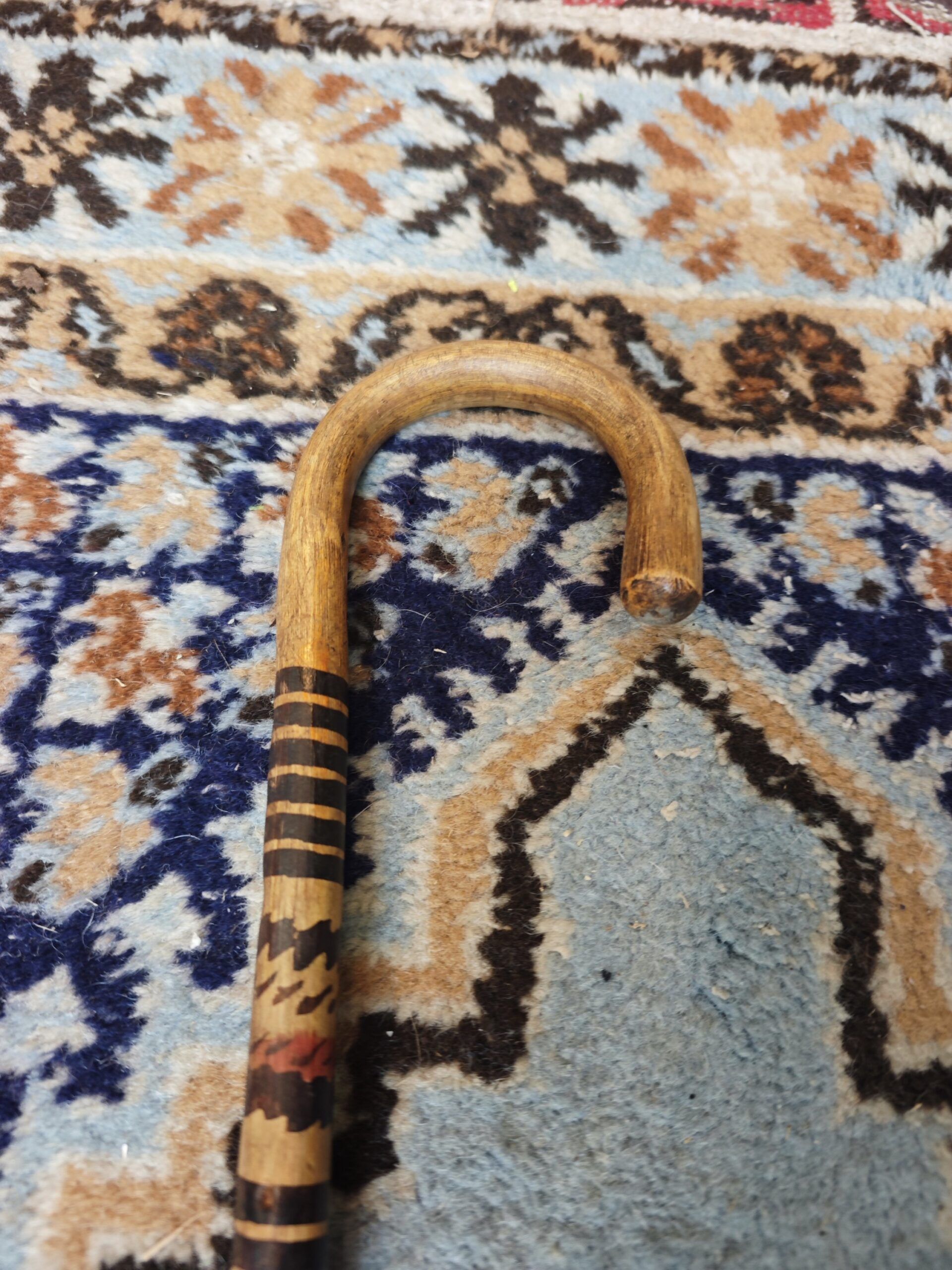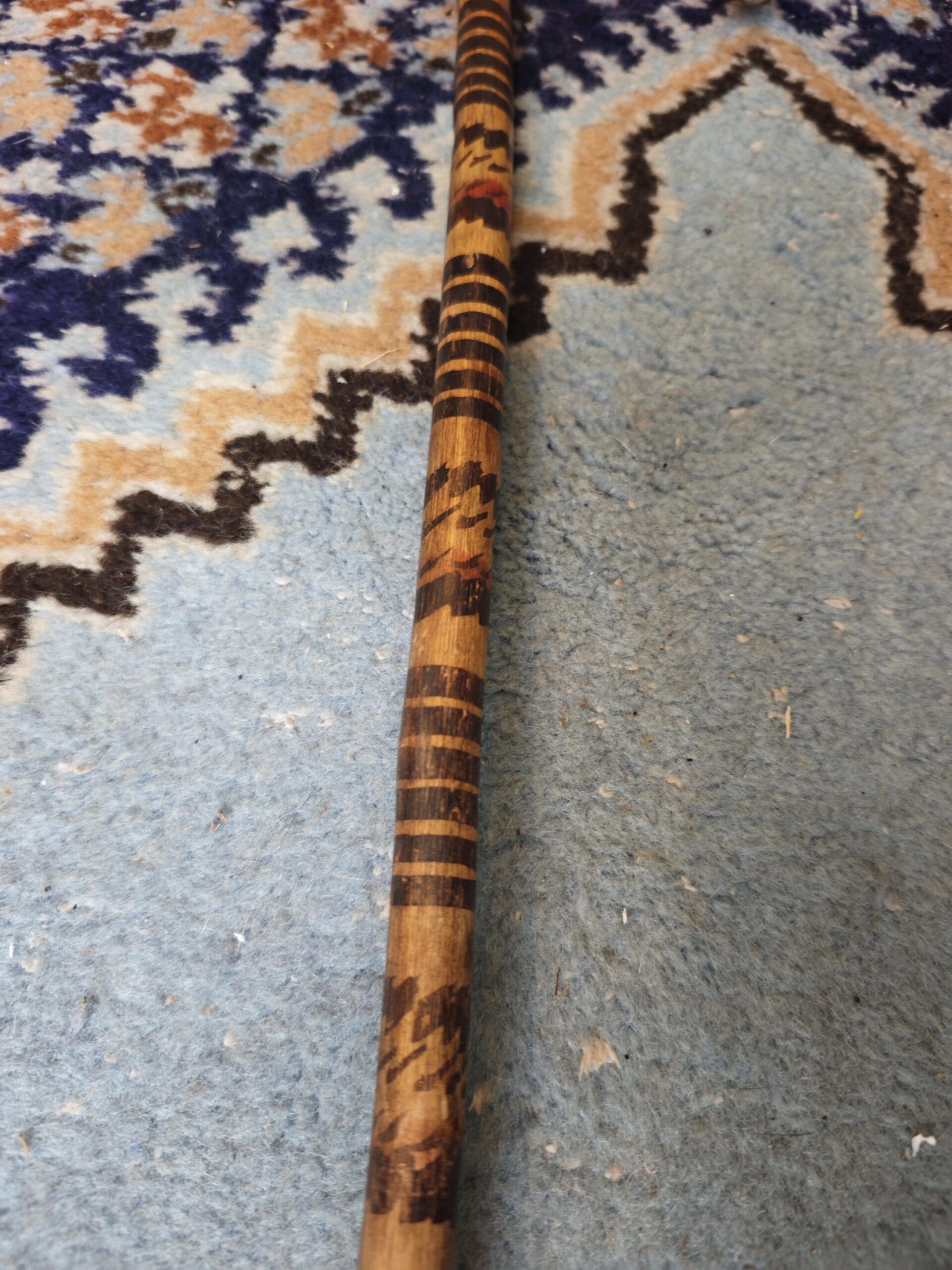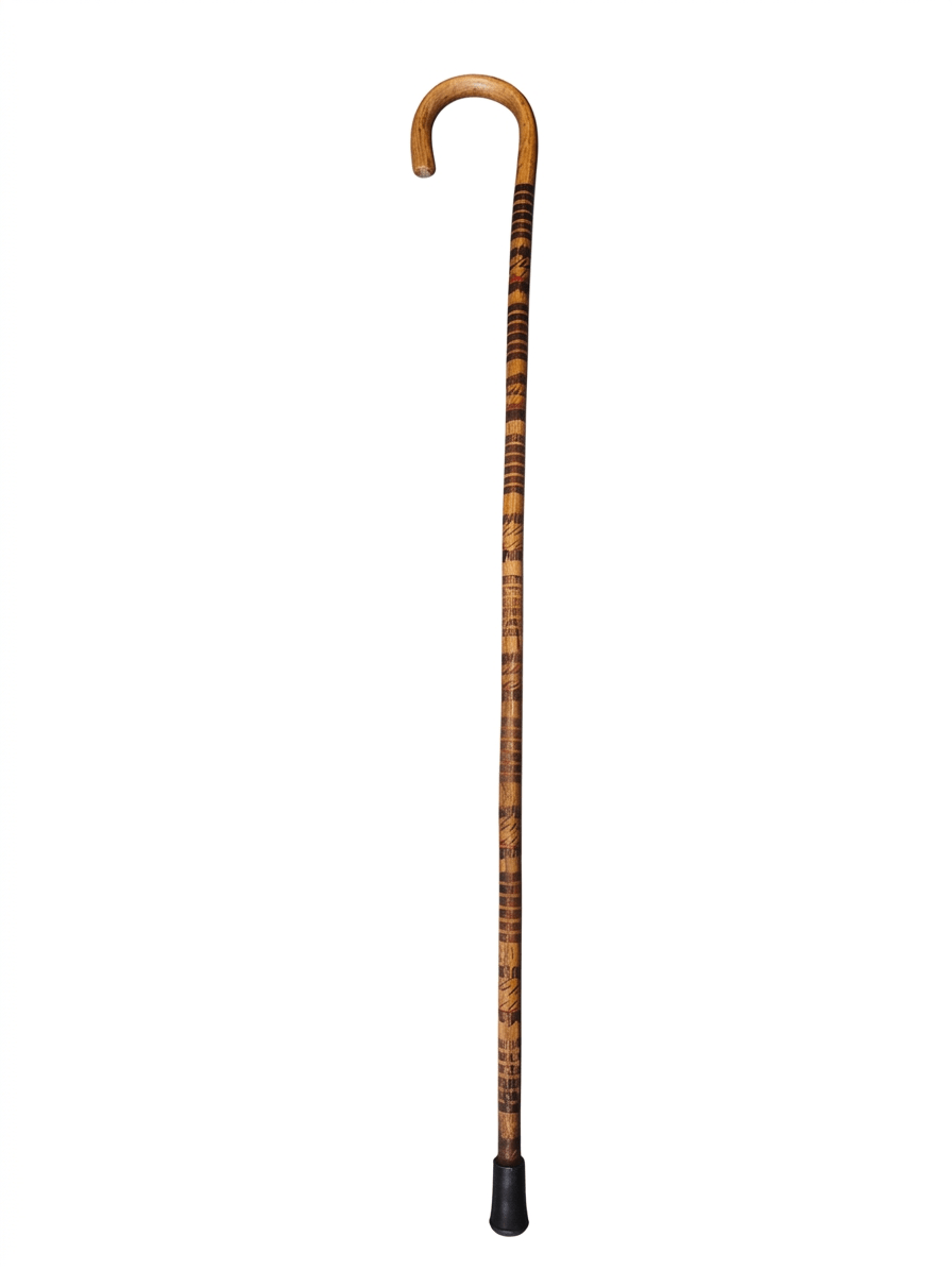 Esta pieza en particular destaca por su decoración artesanal, con motivos geométricos y lineales cuidadosamente aplicados a lo largo de su estructura, lo que le confiere un estilo rústico pero refinado. Su empuñadura curva (tipo «crook») ofrece un agarre ergonómico y tradicional, ideal para quienes aprecian lo auténtico sobre lo fabricado en serie.