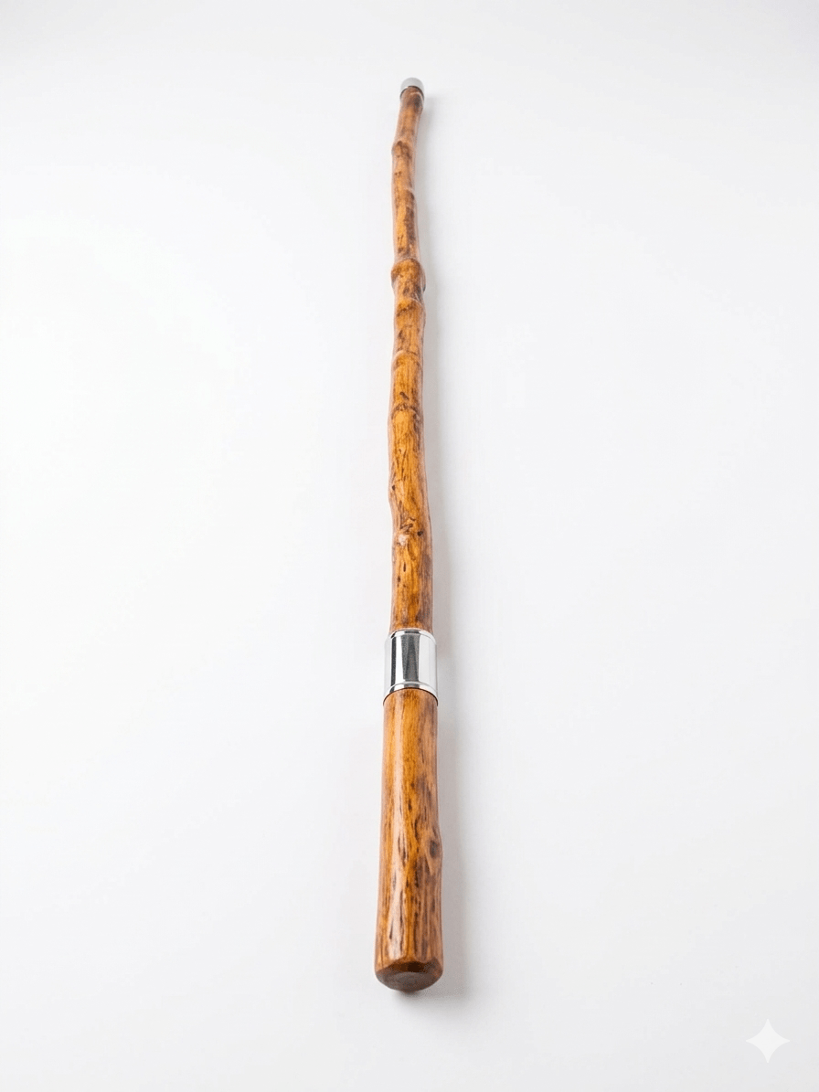 El uso de bastones artesanales se remonta a siglos de tradición rural y de montaña. Históricamente, estas piezas no solo servían como apoyo para el camino, sino que eran símbolos de estatus y autoridad en comunidades locales. Este modelo en particular, con su empuñadura curvada y fuste irregular, evoca la herencia de los pastores y caminantes del sur de Europa, donde cada pieza era única.