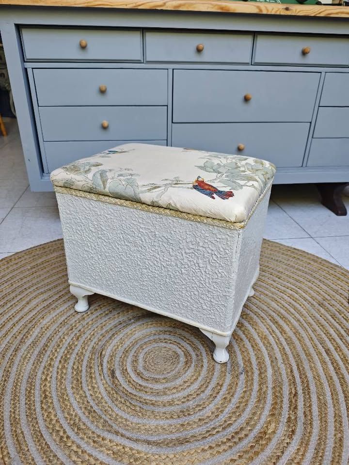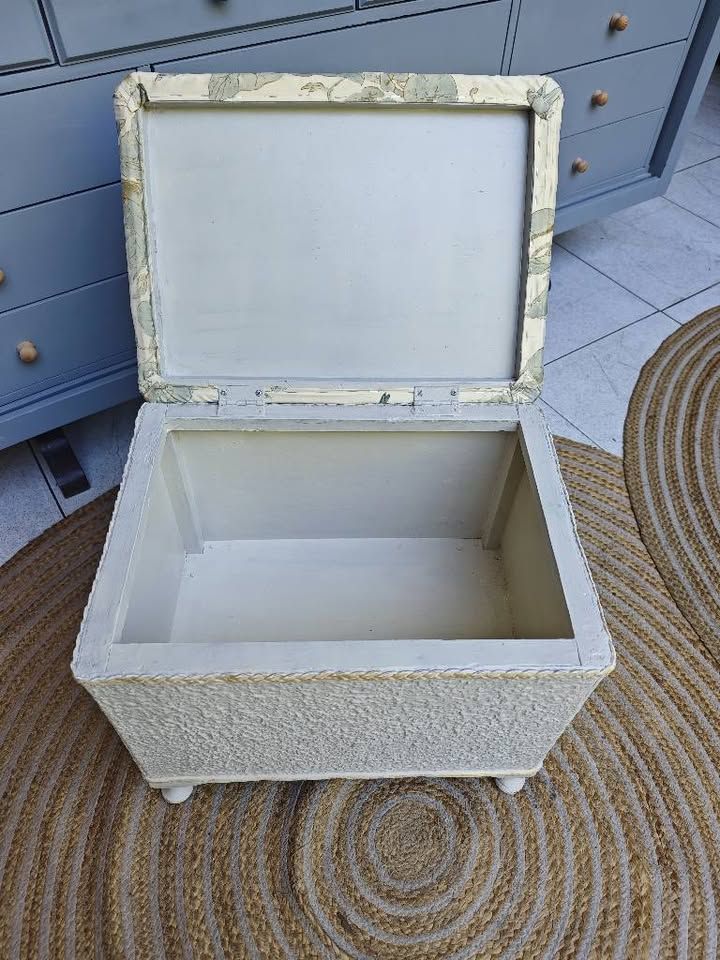 Las patas cortas y redondeadas aportan estabilidad y un aire retro, mientras que el interior del baúl ofrece espacio de almacenaje ideal para guardar mantas, cojines, zapatos o accesorios. El tapizado en tela natural y el diseño decorativo hacen que esta pieza encaje perfectamente en ambientes rústicos, cottage, shabby chic o bohemios.