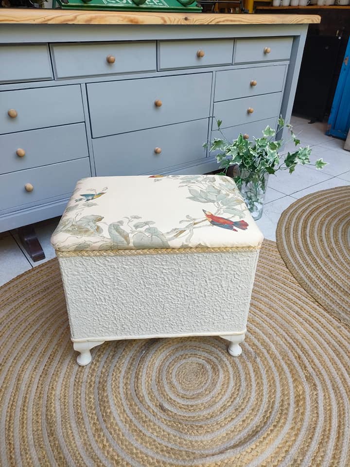 Este baúl descalzador de estilo vintage combina funcionalidad y estética con un diseño encantador y acogedor. Su estructura rectangular está tapizada en tejido texturizado color crema, con una tapa acolchada decorada con un estampado natural que incluye aves y motivos florales en tonos suaves como verde, naranja y negro.