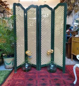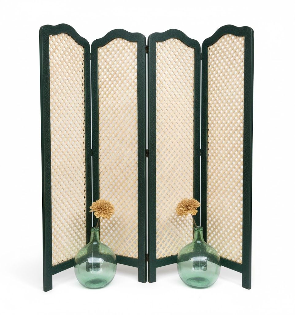 Este biombo vintage de gran formato es una pieza decorativa con fuerte presencia visual, ideal para dividir ambientes, aportar privacidad o enriquecer la estética de cualquier espacio. Fabricado en madera maciza, su diseño artesanal y proporciones generosas lo convierten en un elemento escénico que aporta carácter, textura y calidez.