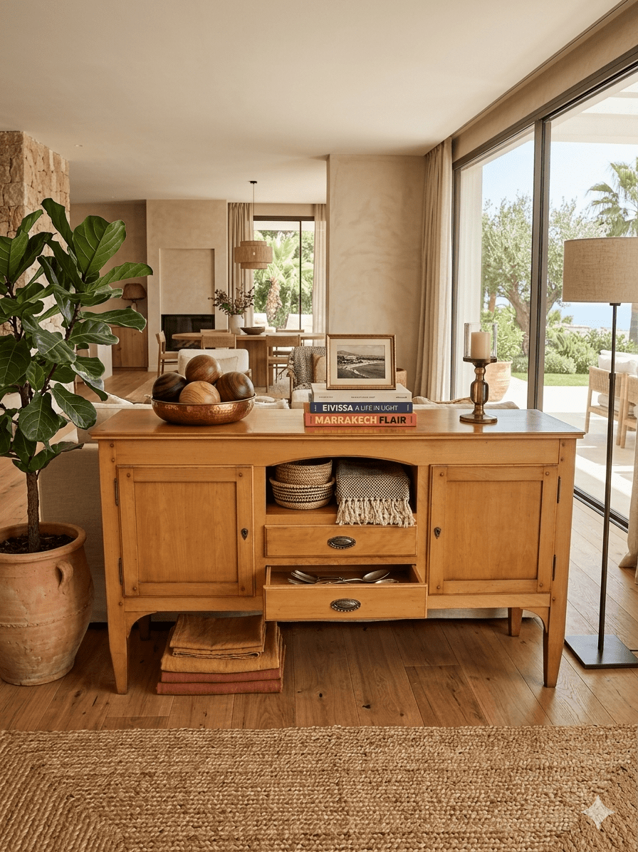En el Comedor: Actúa como el soporte perfecto para vajillas y mantelerías, aportando una presencia cálida y señorial.