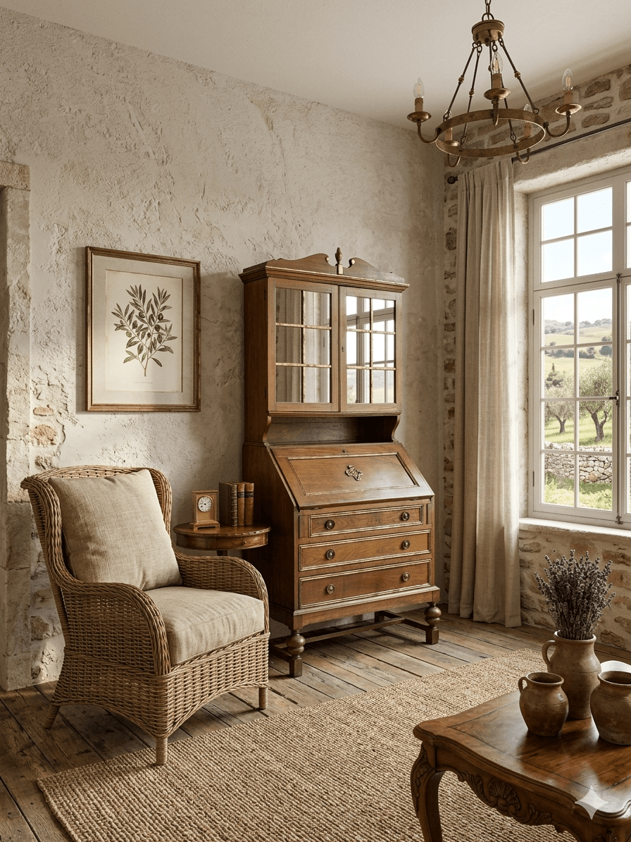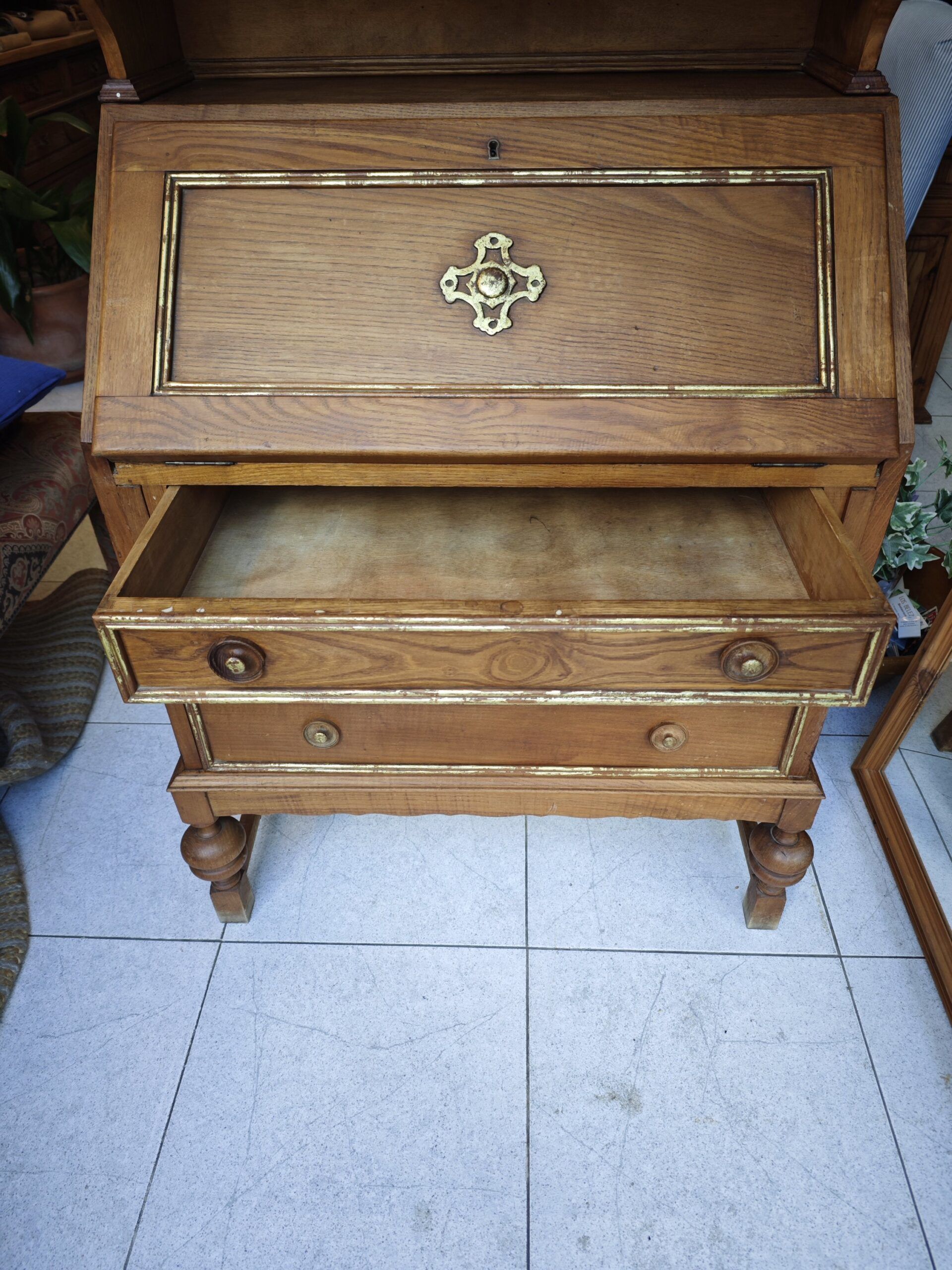 - Material y Estilo: Estructura de madera maciza (probablemente pino o castaño teñido) con detalles ornamentales y molduras clásicas. Los tiradores y el cierre son de metal dorado/latón.