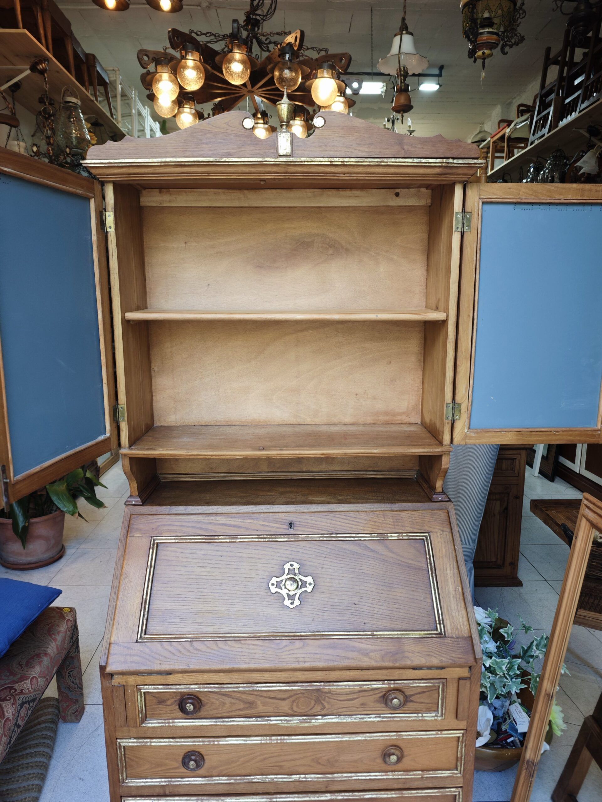 - Secreter Abatible: La tapa central se abate para formar una superficie de escritorio (imagen 20). El interior cuenta con una organización clásica («pigeon holes»): pequeños cajones, estantes abiertos y separadores verticales para cartas o documentos. El interior es de una madera más clara.