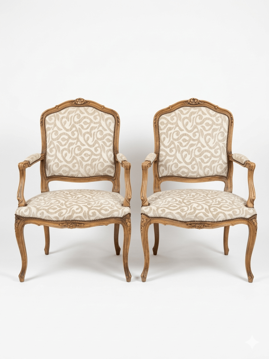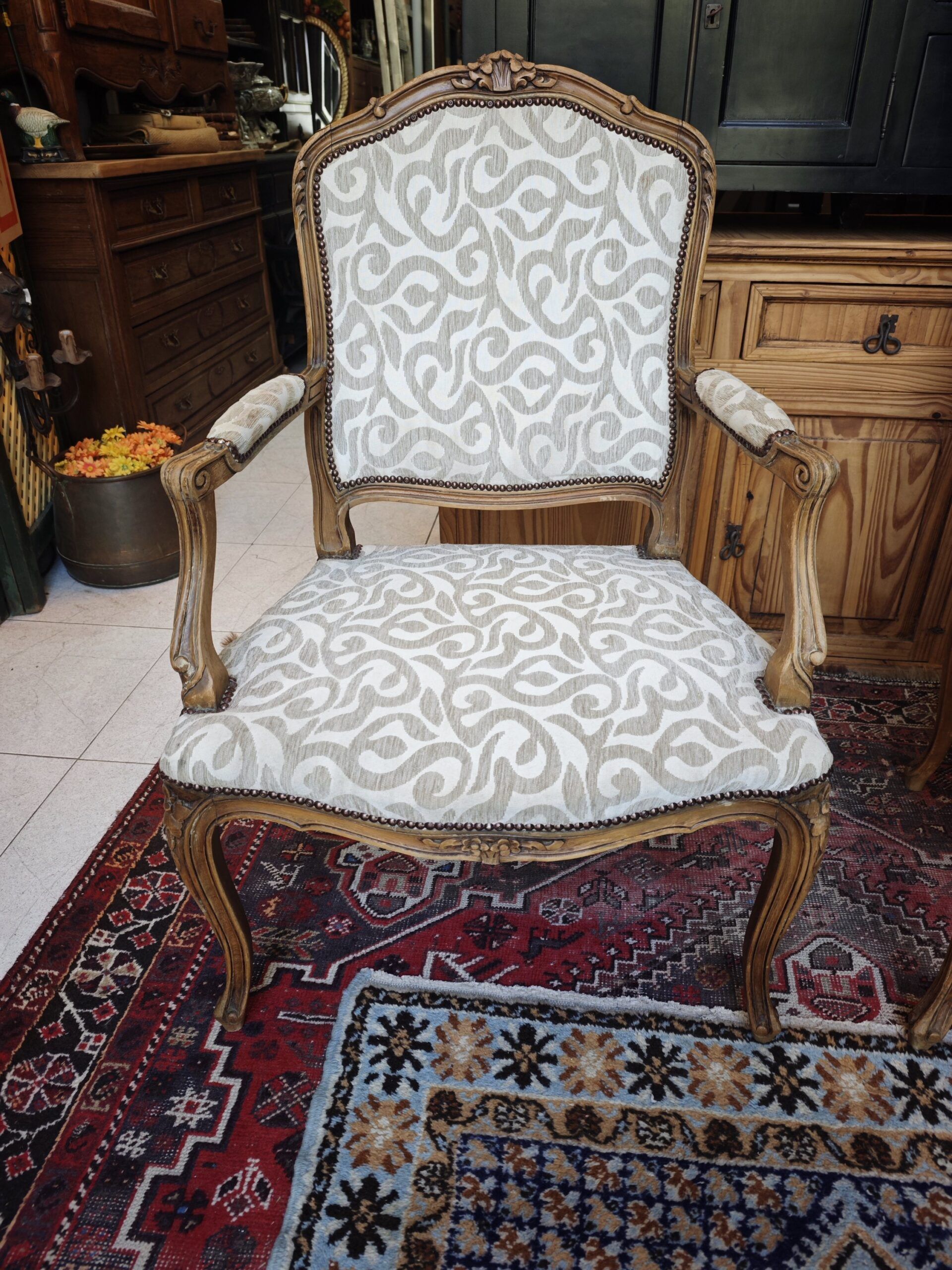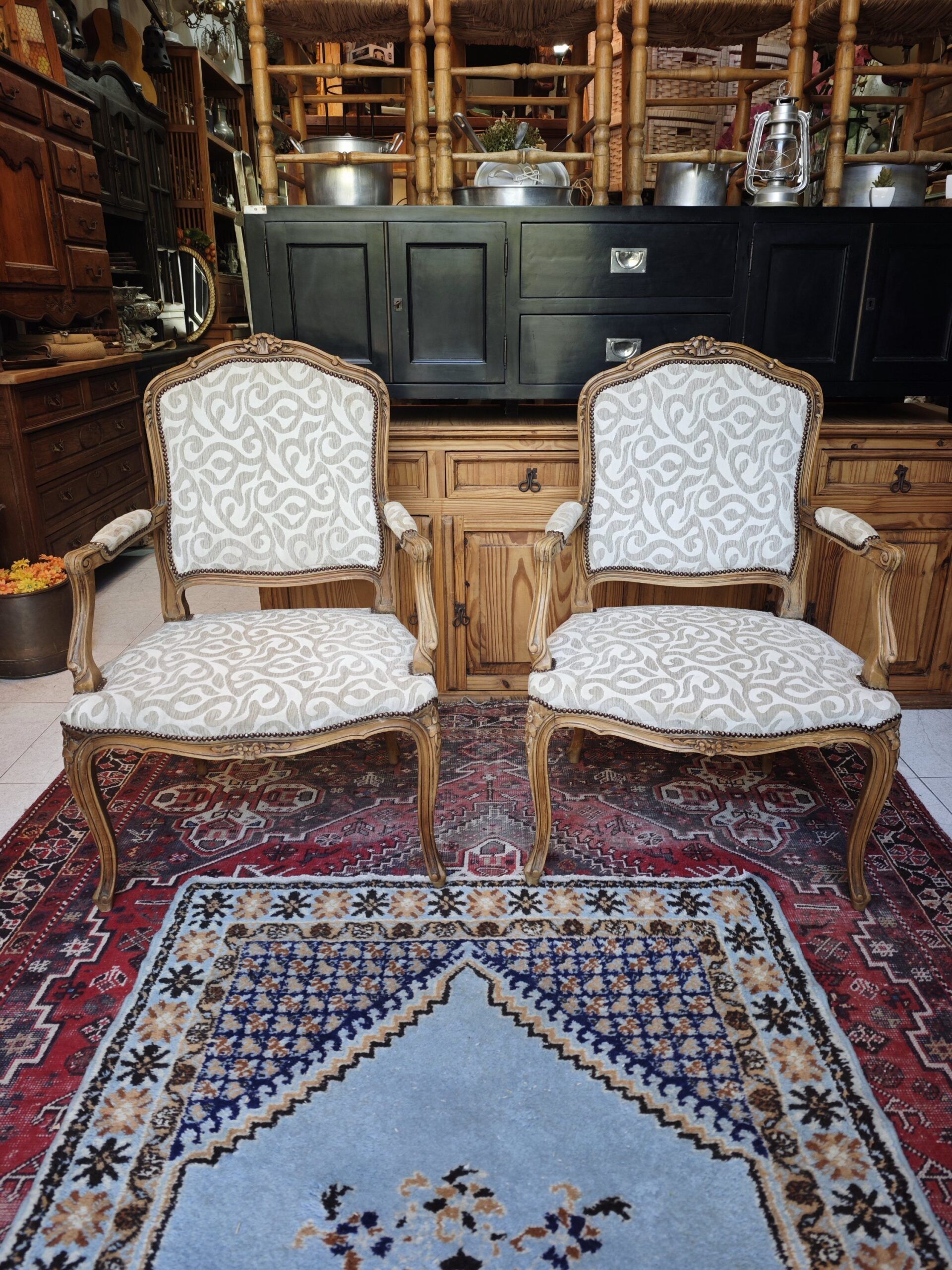 Elegante pareja de butacas de estilo Isabelino con estructura de madera tallada y tapicería de motivos orgánicos. Medidas: 70 cm de ancho, 102 cm de altura total y 44 cm de altura de asiento.