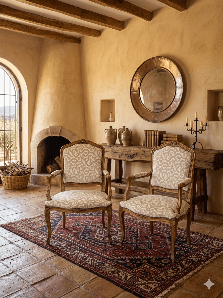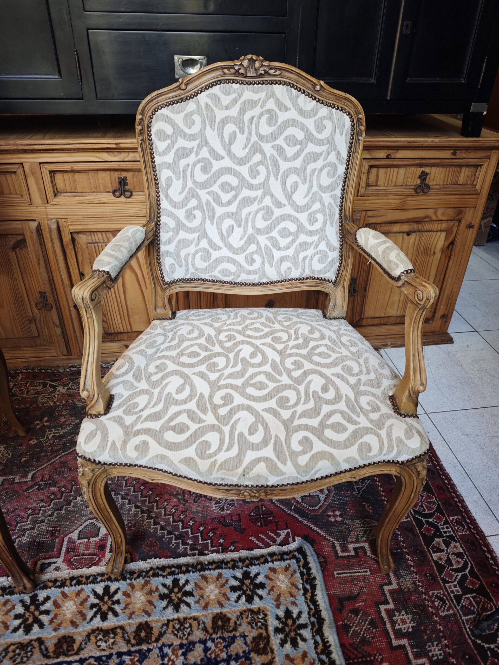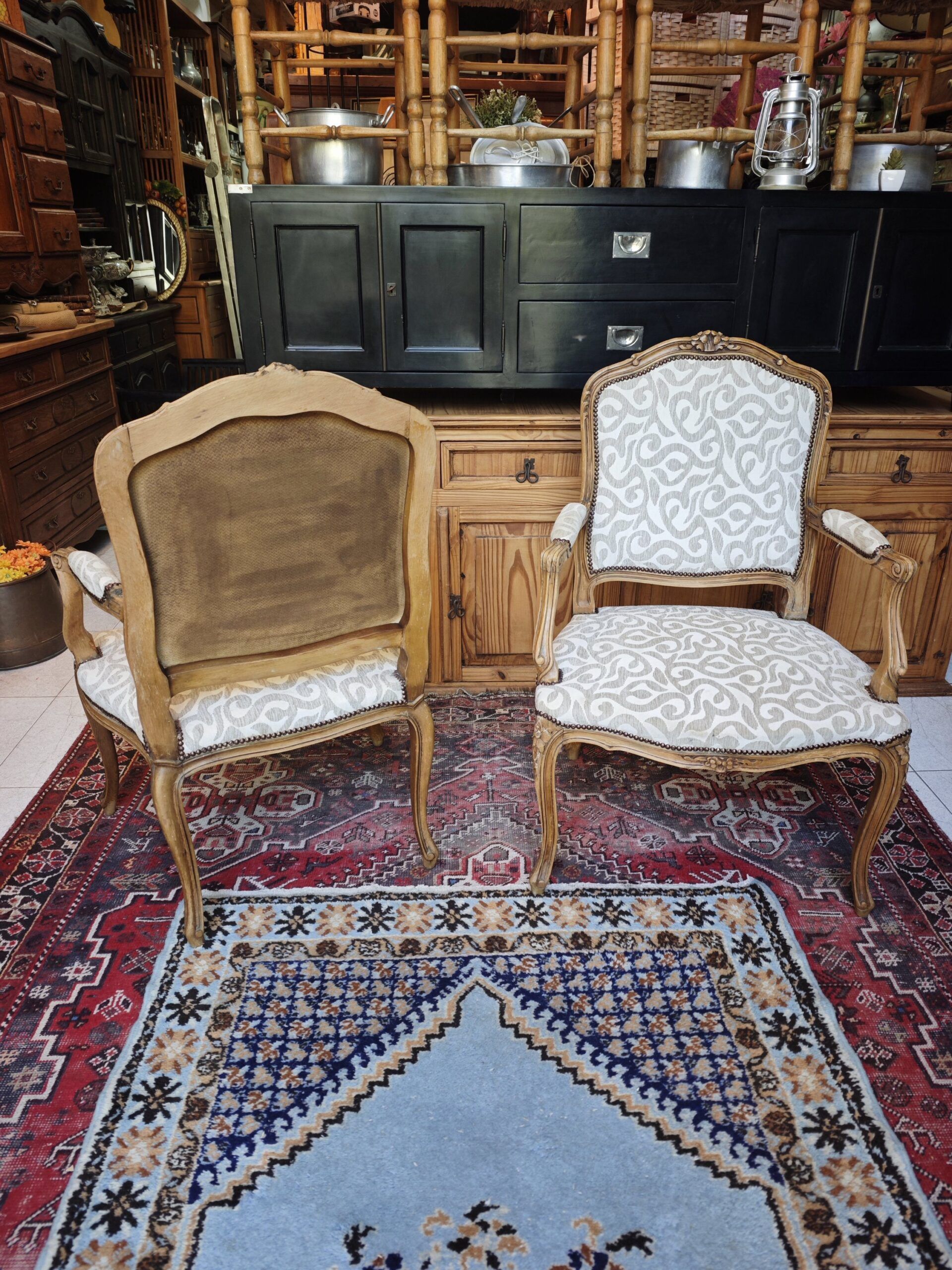 Elegante pareja de butacas de estilo Isabelino con estructura de madera tallada y tapicería de motivos orgánicos. Medidas: 70 cm de ancho, 102 cm de altura total y 44 cm de altura de asiento.