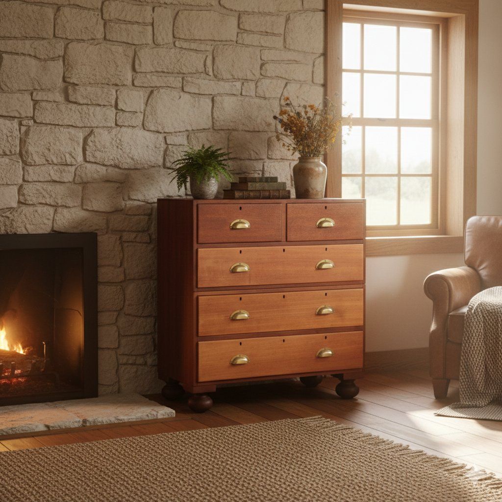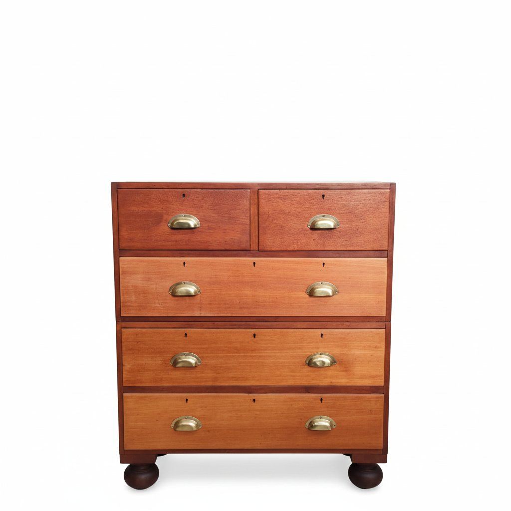 Esta cómoda militar de campaña es una pieza robusta, versátil y con una estética sobria que evoca el mobiliario utilitario de época. Fabricada en madera maciza y equipada con tiradores metálicos tipo concha, su diseño modular y simétrico refleja la funcionalidad y resistencia propias del mobiliario militar tradicional. Su acabado natural y estructura firme la convierten en una opción perfecta tanto para decoración como para uso diario.