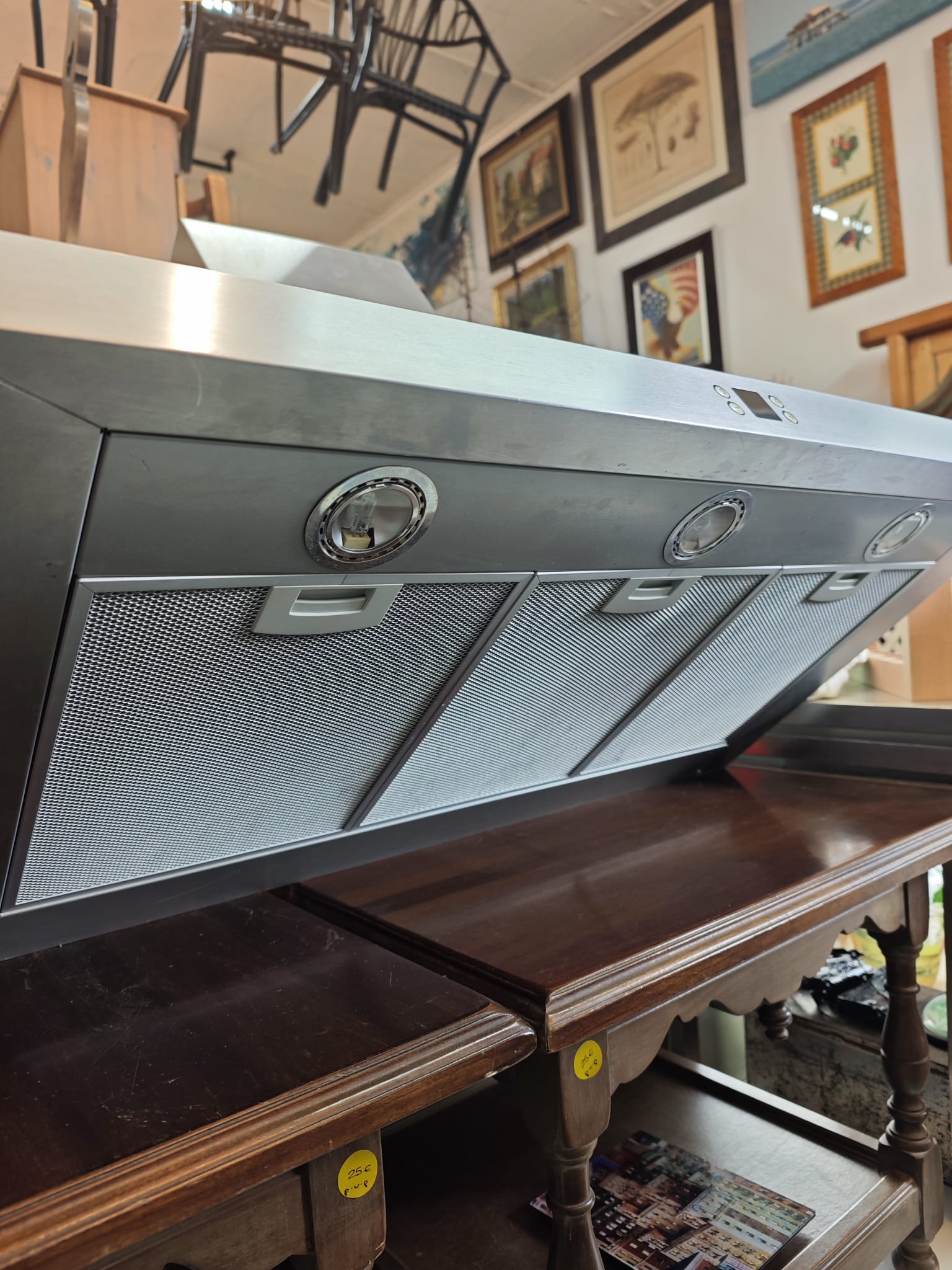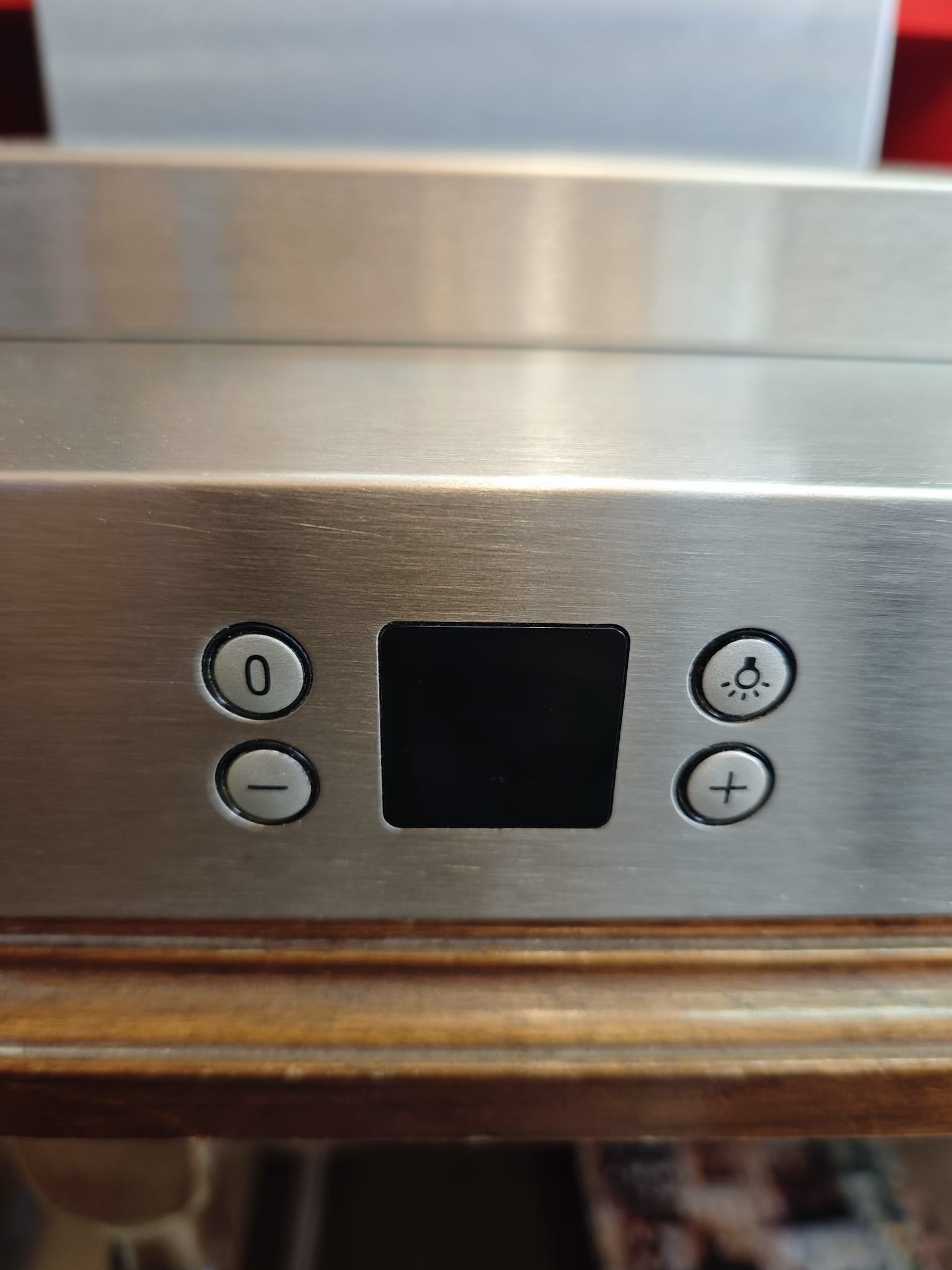 La parte inferior incorpora tres luces LED circulares que ofrecen una iluminación clara y directa sobre la zona de cocción. El panel de control digital está ubicado en el frente, con botones táctiles para regular la potencia de extracción, encender la luz y ajustar otras funciones.