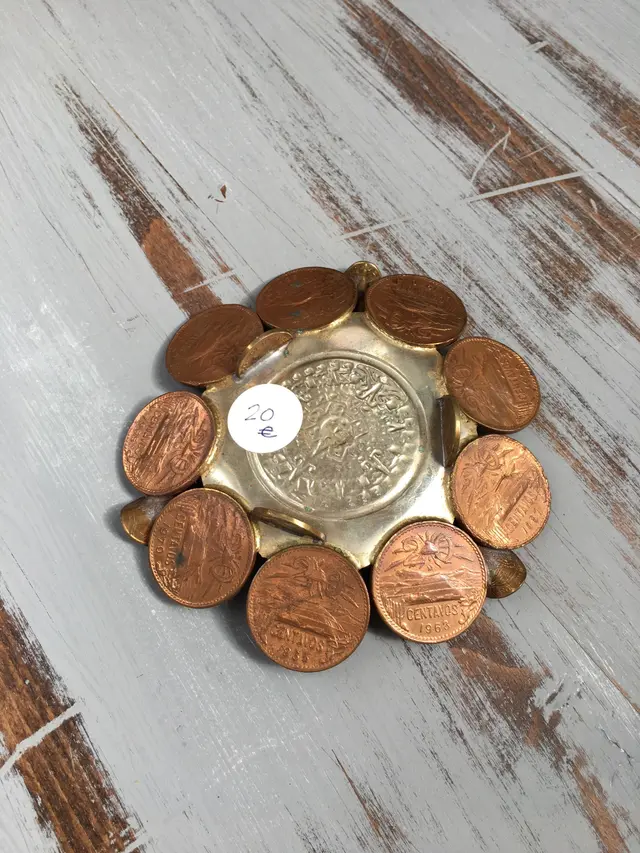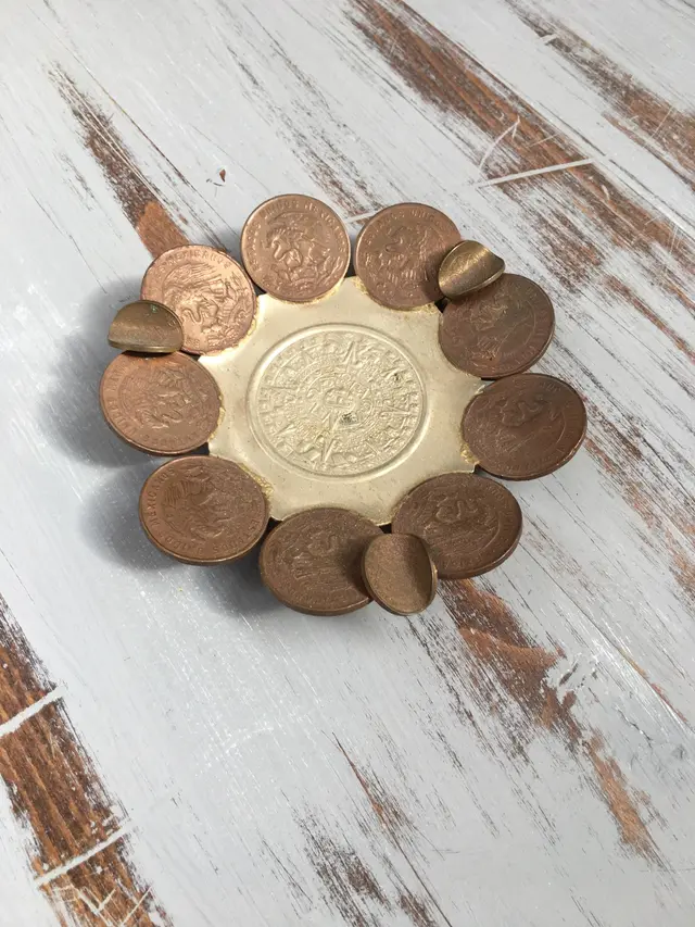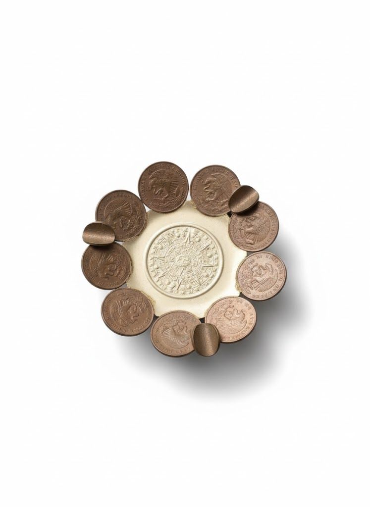 Cenicero decorativo con relieve de moneda mexicana y acabado metálico artesanal.