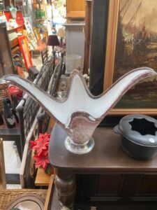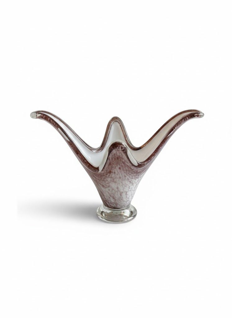 Este centro de mesa vintage es una pieza decorativa excepcional, elaborada en cristal soplado con un diseño orgánico y elegante que evoca formas florales o marinas. Su estructura asimétrica, con tres puntas curvas que se elevan desde una base redonda transparente, lo convierte en una obra escultórica ideal para destacar en cualquier ambiente.