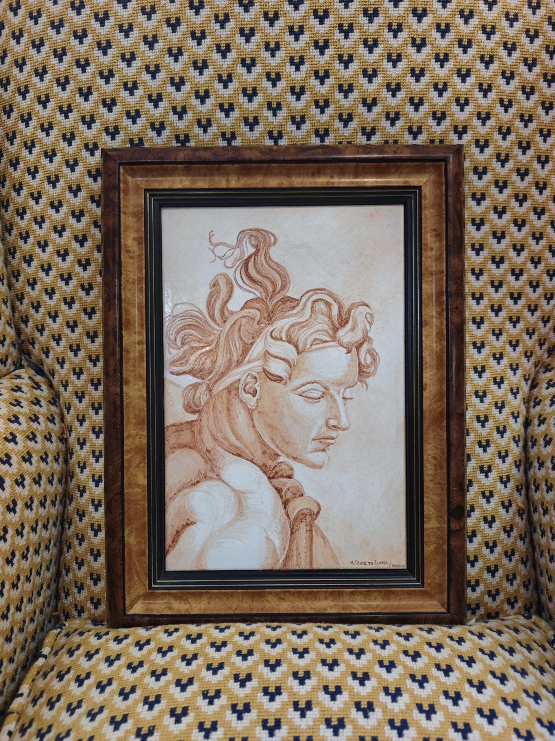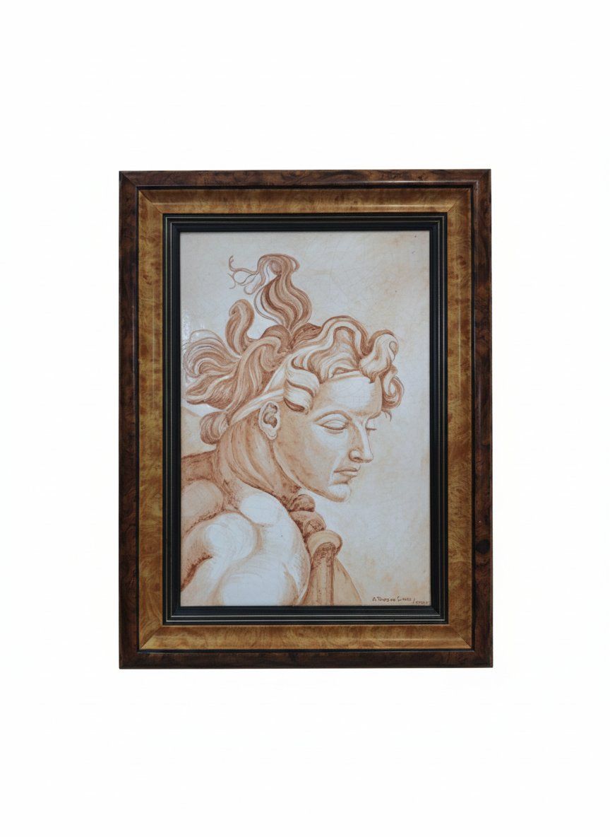 Cuadro artístico enmarcado de cerámica del autor Alfredo Ruiz de Luna, con busto clásico de inspiración escultórica y acabado craquelado. Medidas: 40 cm de alto x 30 cm de ancho. Pieza decorativa elegante, ideal para interiores clásicos o vintage, con marco de madera.