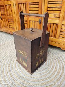 Esta cesta antigua de madera es una pieza única que combina funcionalidad, historia y belleza artesanal. Con un diseño rectangular y estructura robusta, destaca por sus laterales decorados con motivos florales pintados a mano, que aportan un toque cálido y tradicional. Su acabado envejecido y el tono oscuro de la madera la convierten en un elemento decorativo ideal para ambientes rústicos, vintage o bohemios.
