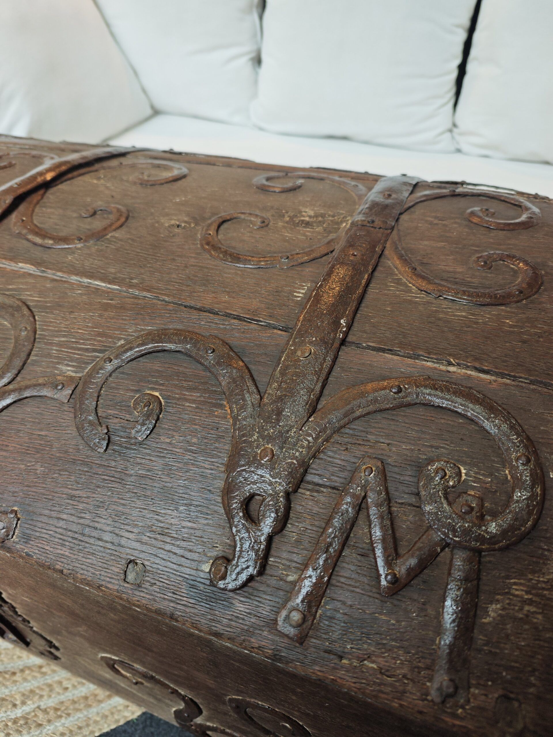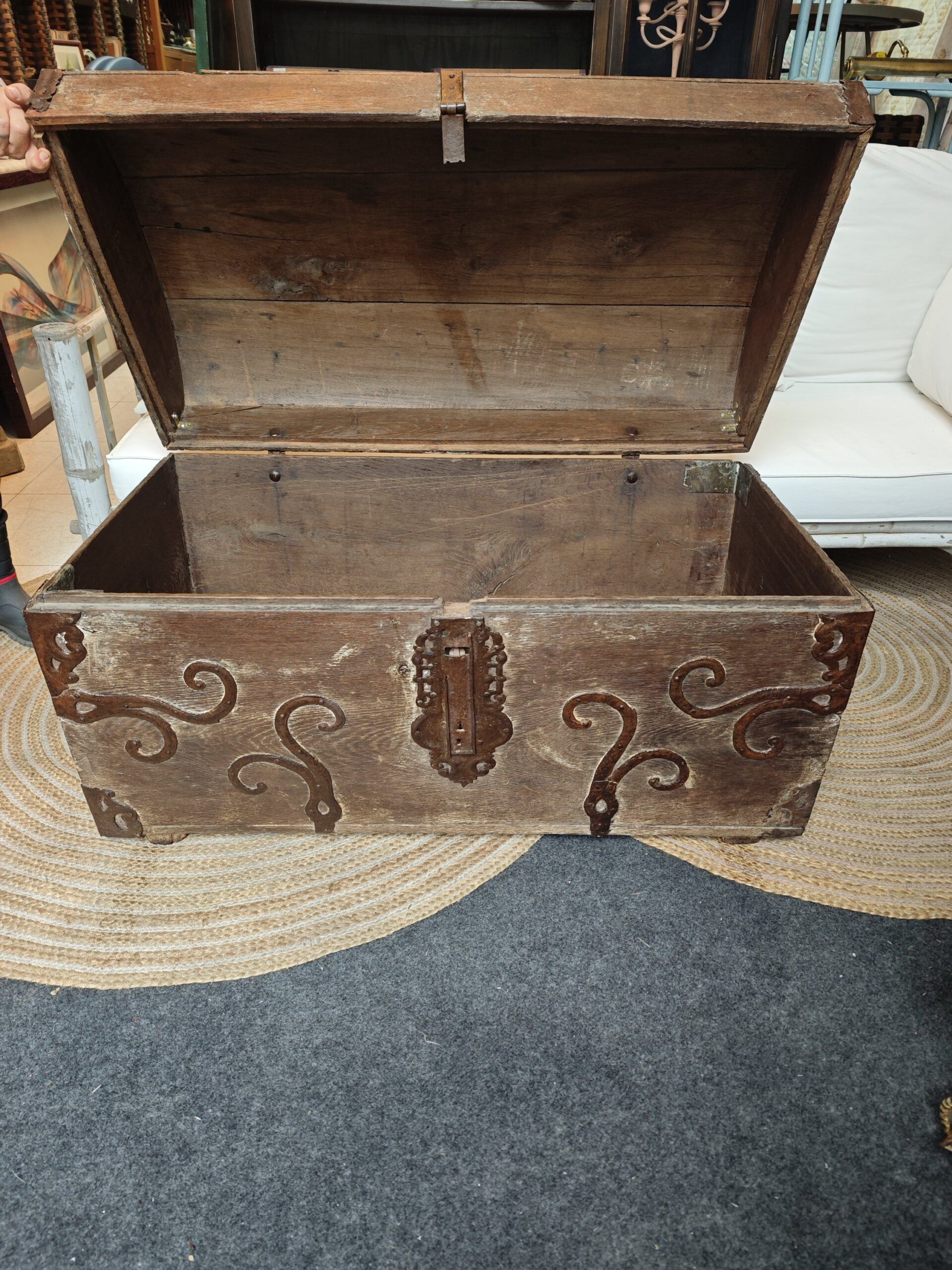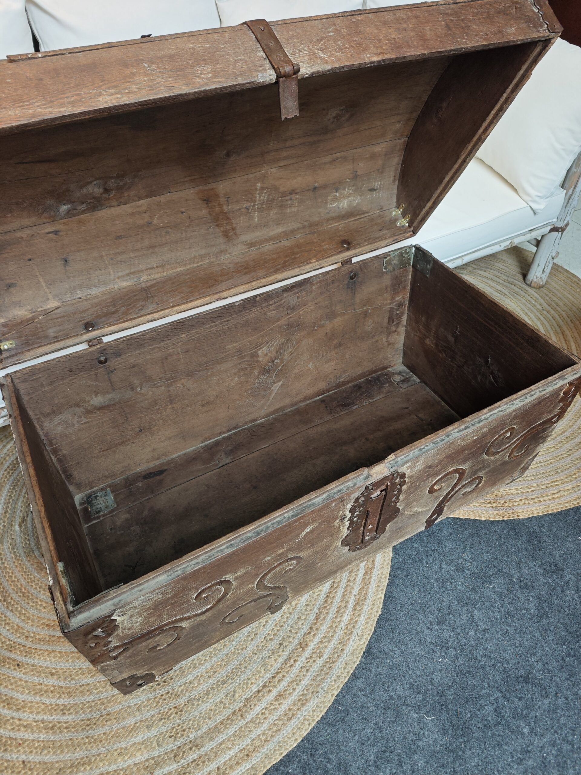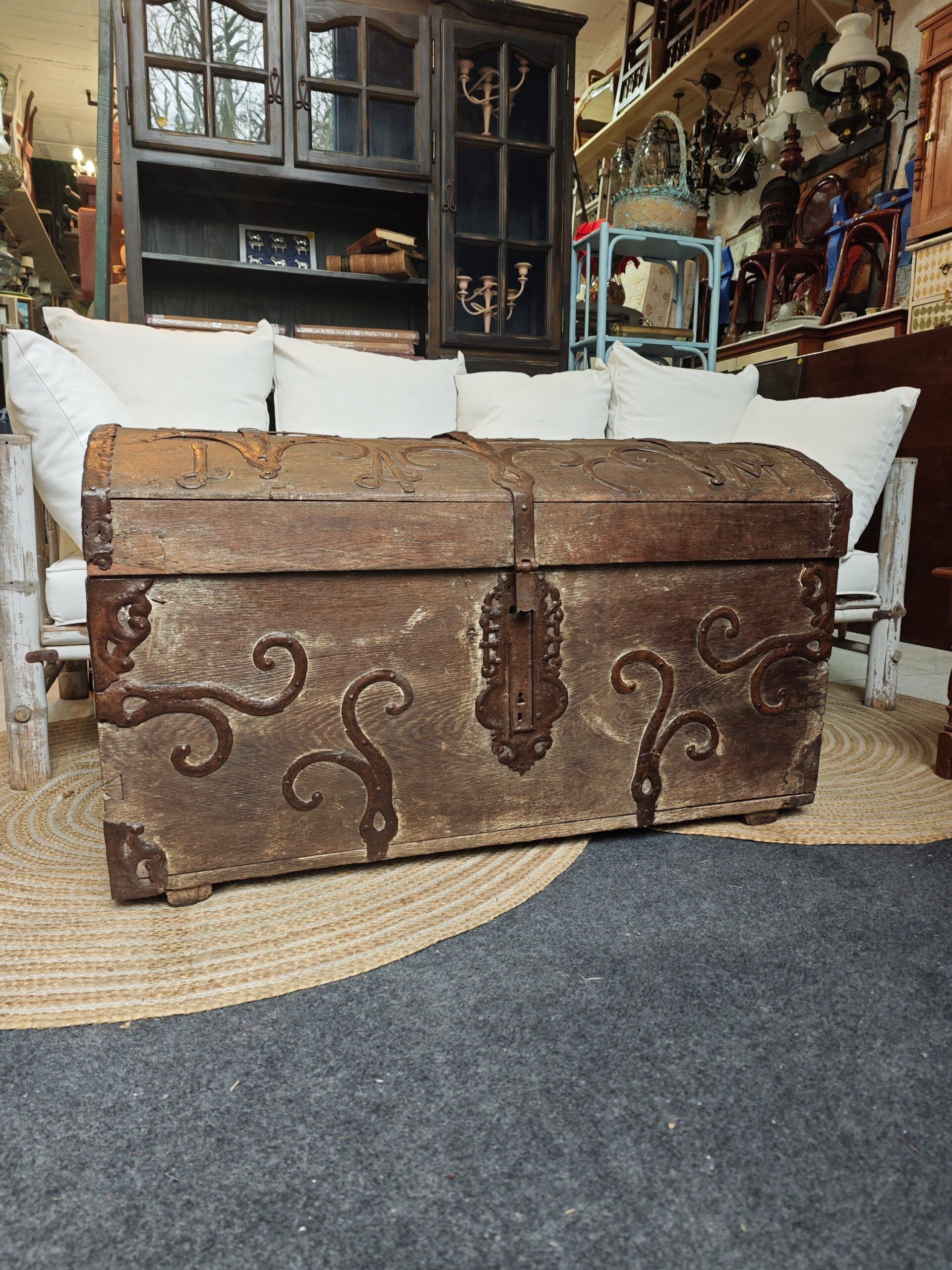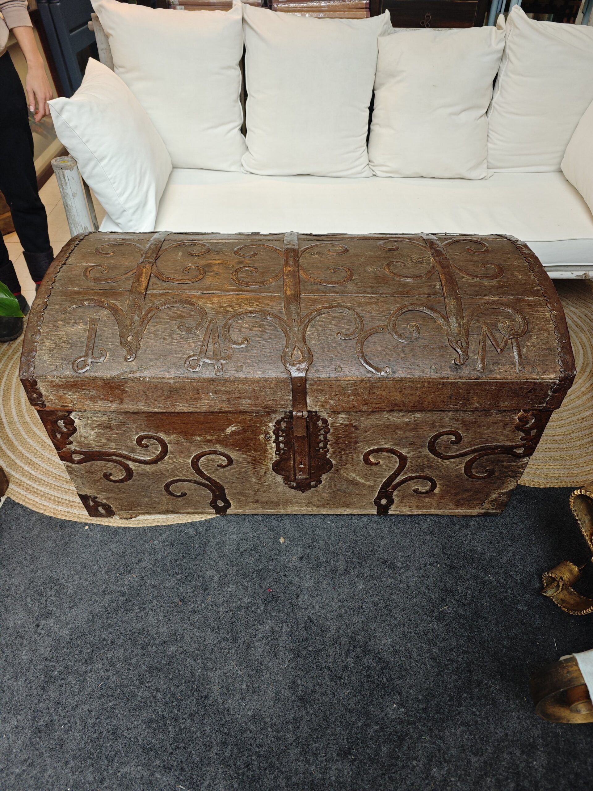 Este cofre antiguo europeo datado en el siglo XIX es una pieza de alta ebanistería rústica que destaca por su imponente presencia y autenticidad histórica. Fabricado en madera maciza de gran densidad, presenta una tapa convexa reforzada con bandas de hierro forjado a mano. La ornamentación metálica incluye intrincadas volutas y motivos caligráficos en relieve que denotan su origen artesanal en la Europa central o mediterránea de la época.