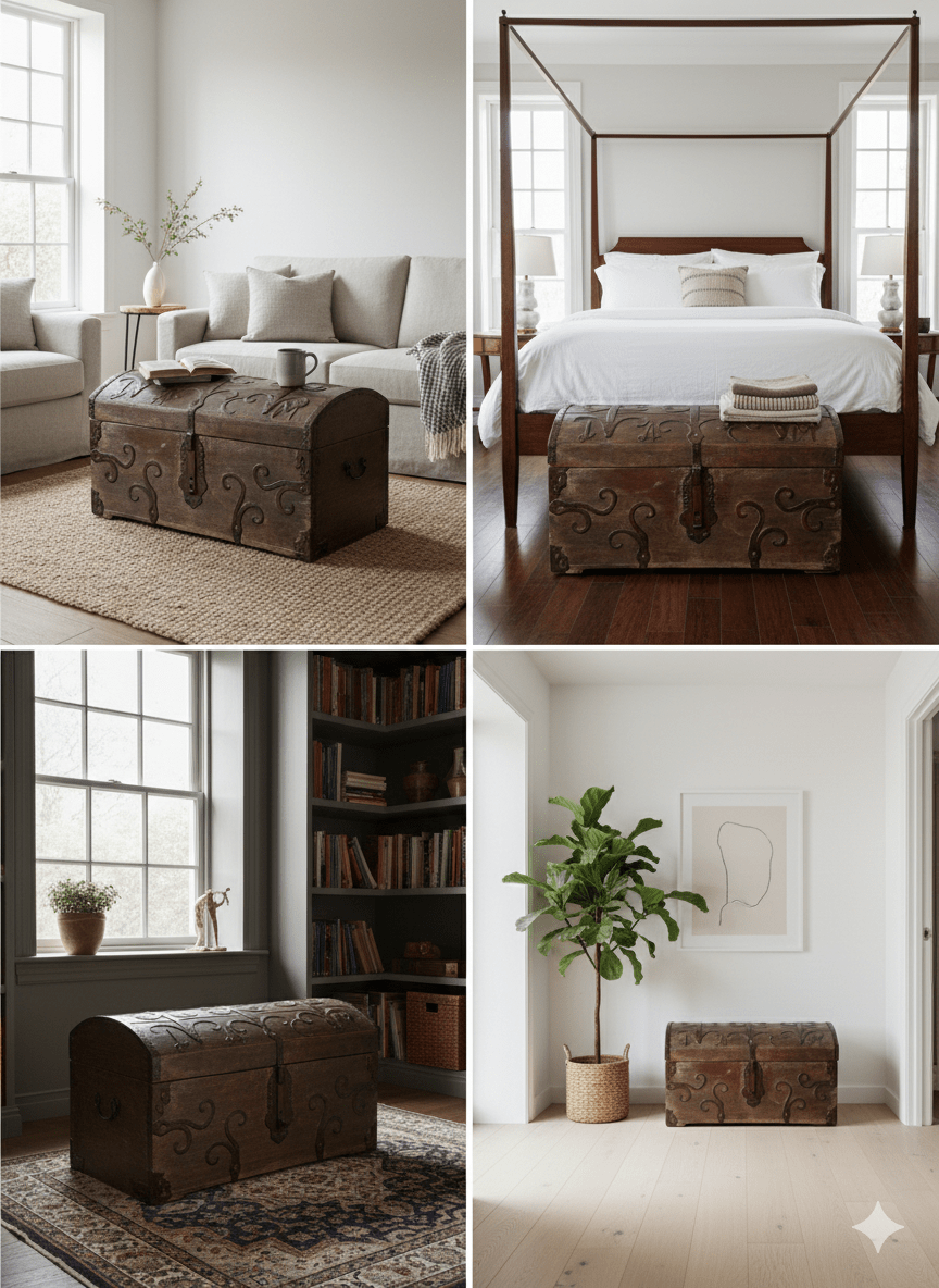 La estructura se conserva en excelente estado, manteniendo la pátina oscura original que solo el paso del tiempo puede otorgar. Este baúl de viaje antiguo no solo es una pieza de colección, sino un elemento funcional de gran capacidad. Su estética robusta y sus herrajes decorativos lo convierten en un punto focal idóneo para salones señoriales, bibliotecas o como pieza de pie de cama en dormitorios de estilo clásico o colonial.