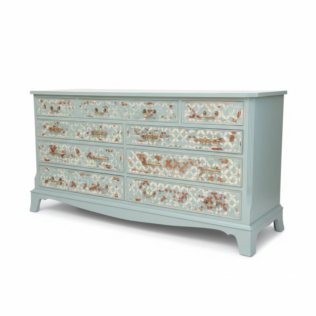 – Color: Azul pastel con detalles florales en blanco y marrón