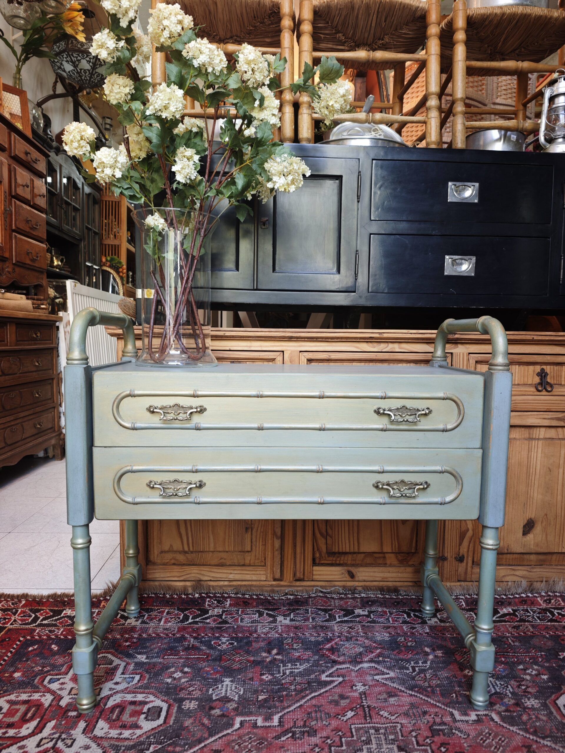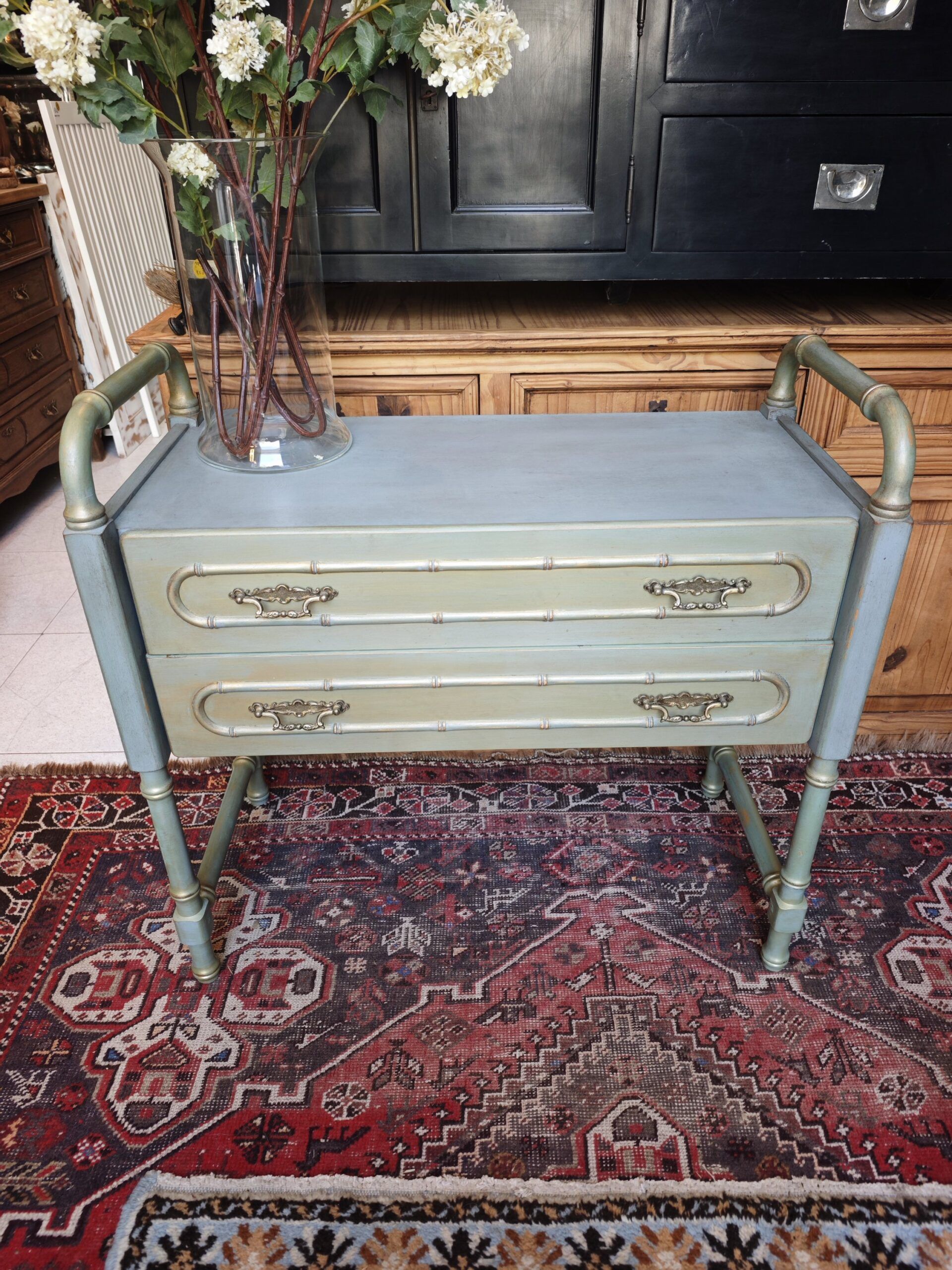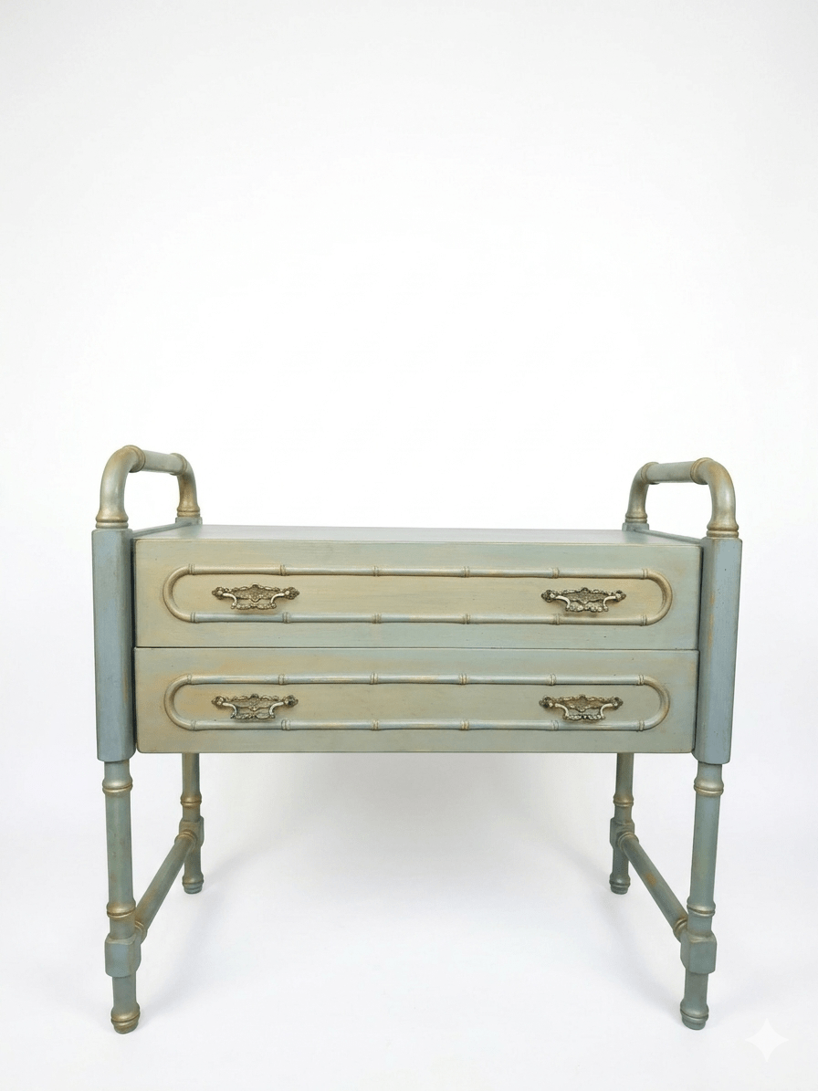 Cómoda Auxiliar «Faux Bamboo» Años 70reali zado en madera tallada imitando bambú (Faux Bamboo). Estilo Hollywood Regency con acabado original pátina y detalles dorados. Incluye dos cajones con tiradores de latón de época.