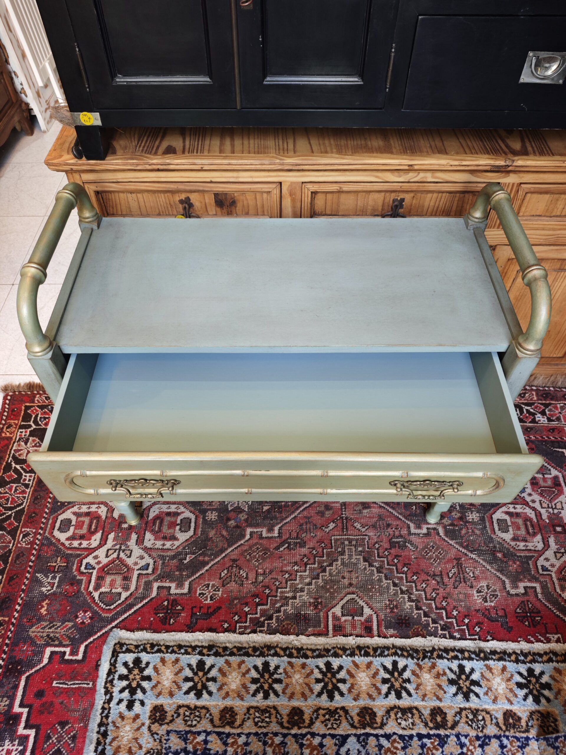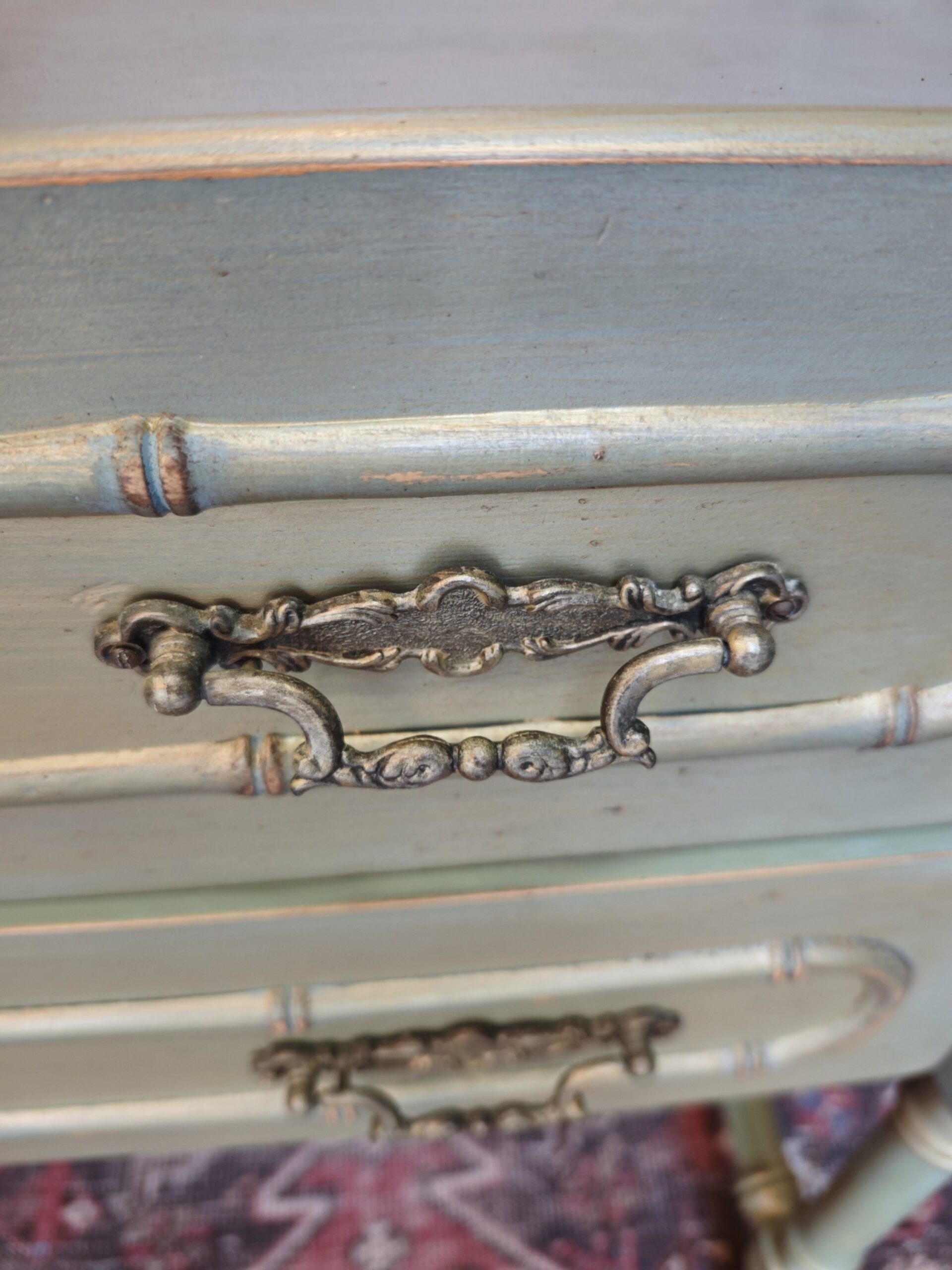 • Acabado: Lacado verde celadón mezclado con pátina y detalles dorados. Herrajes de latón.