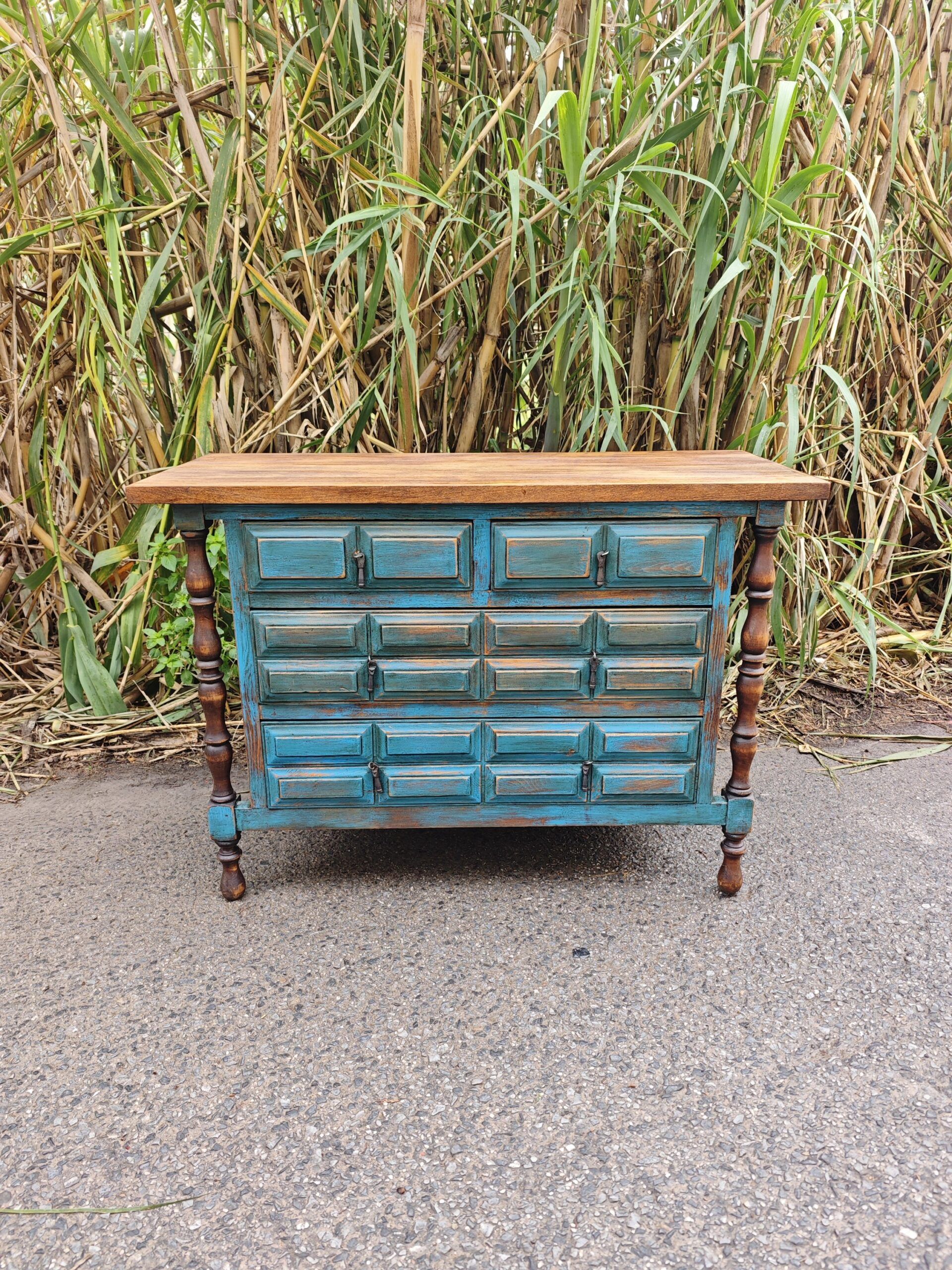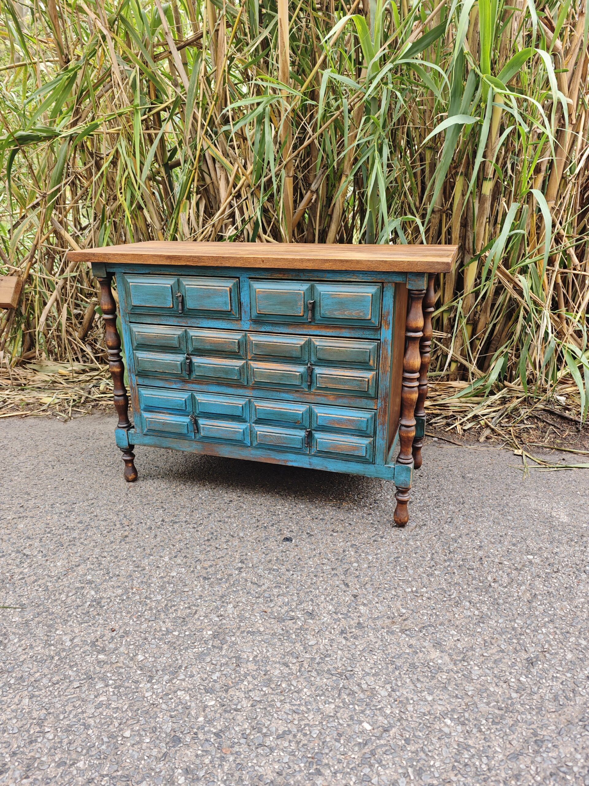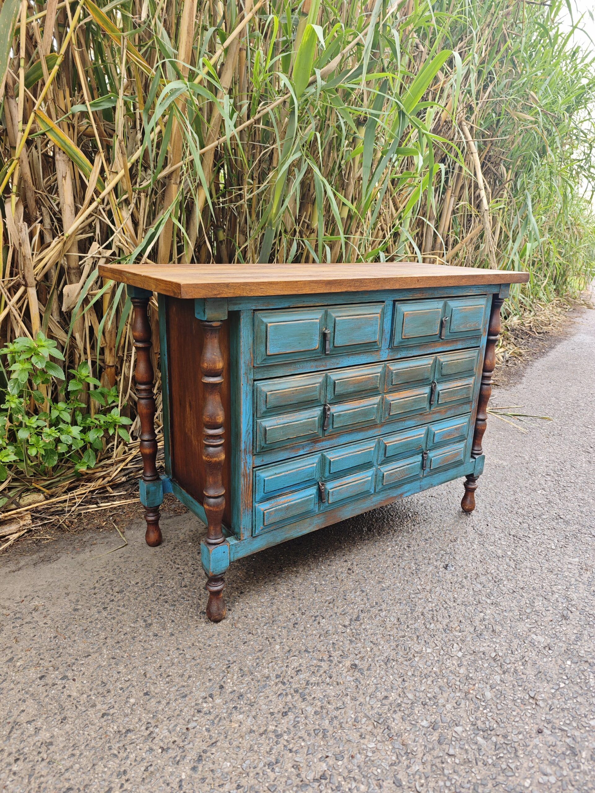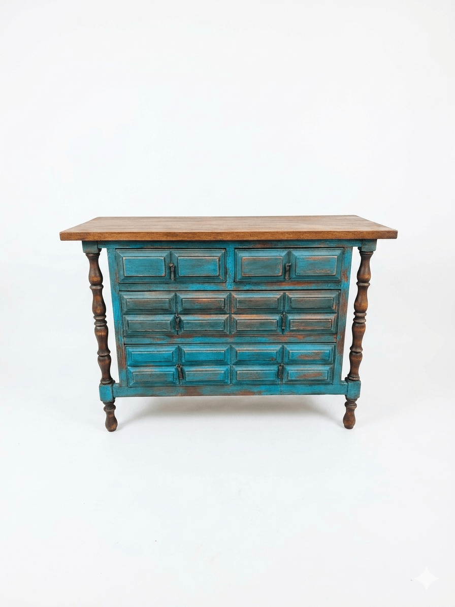 Comprar esta pieza no es solo adquirir almacenamiento; es rescatar la herencia cultural de España y adaptarla al siglo XXI. Es un mueble de madera maciza, construido para durar generaciones, con una personalidad que los muebles de fabricación en serie no pueden replicar. El contraste entre el azul decapado y la madera natural ofrece una estética lujosa pero acogedora.