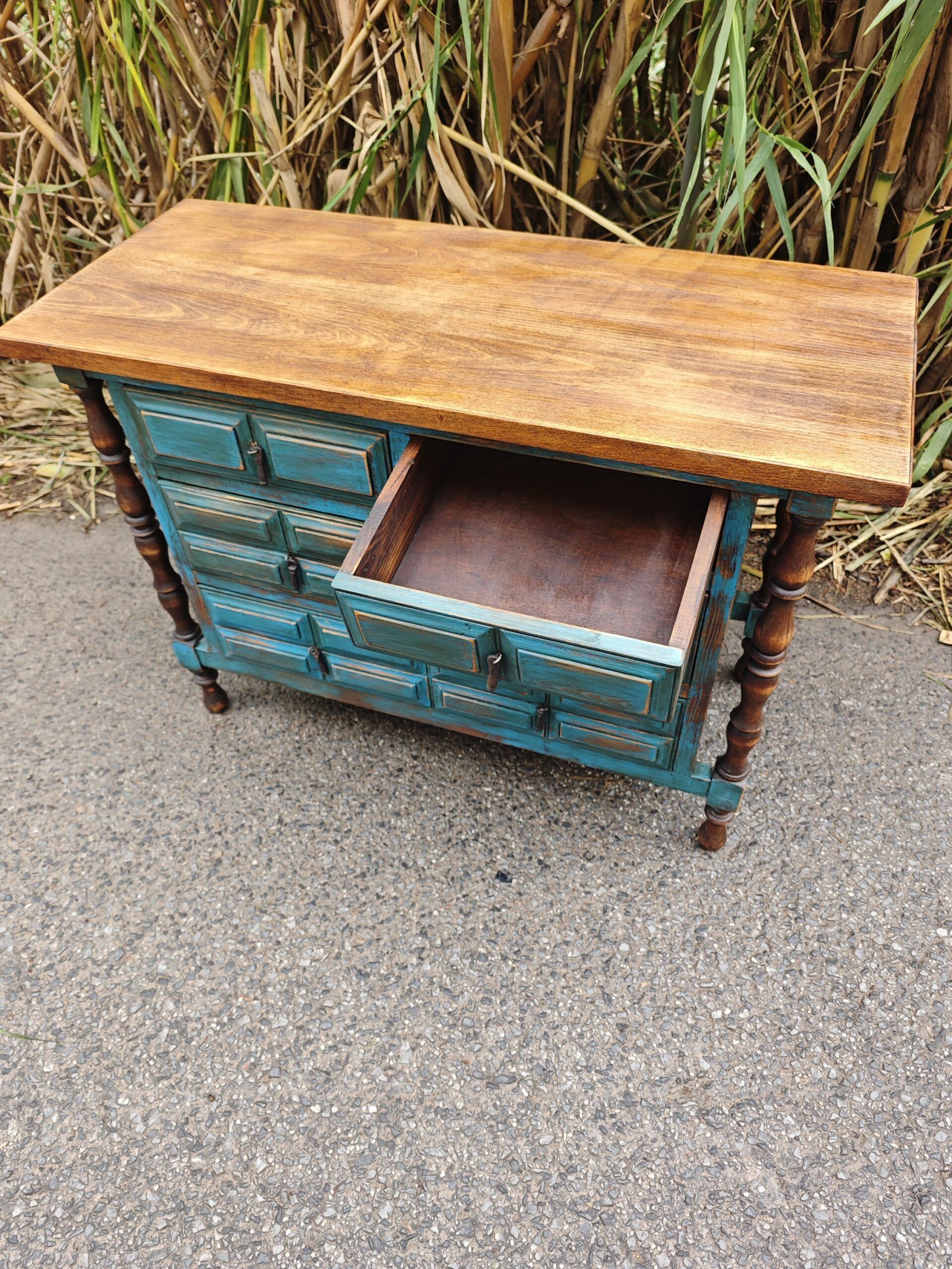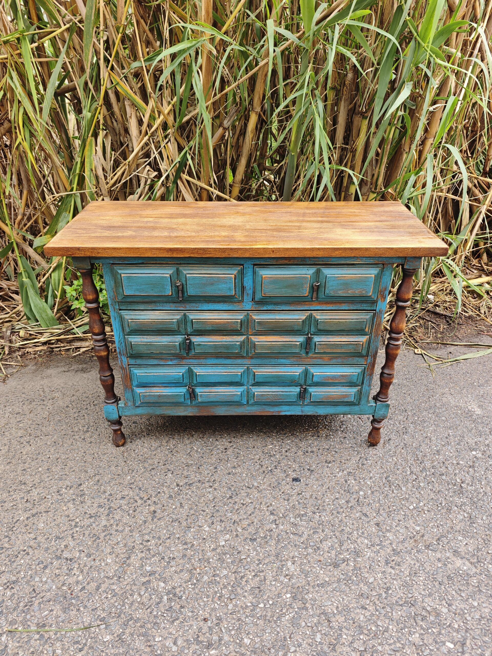 Esta pieza en particular ha sido sometida a un proceso de restauración artística. Mientras que la encimera conserva la calidez de la madera natural tratada para mostrar su veta original, el cuerpo ha sido acabado en un tono azul mediterráneo con un envejecido manual. Los herrajes de forja originales se mantienen, aportando ese toque auténtico de «hierro y madera» que define al mueble español.